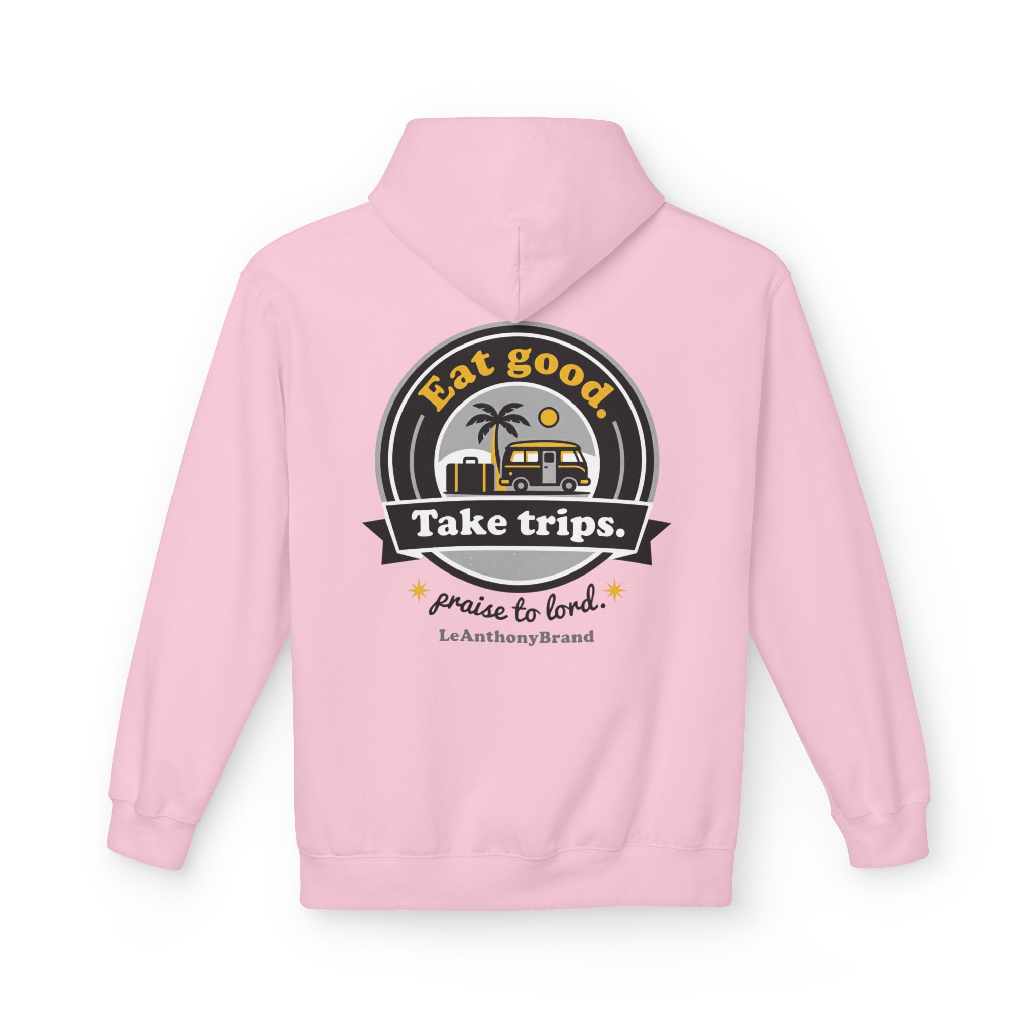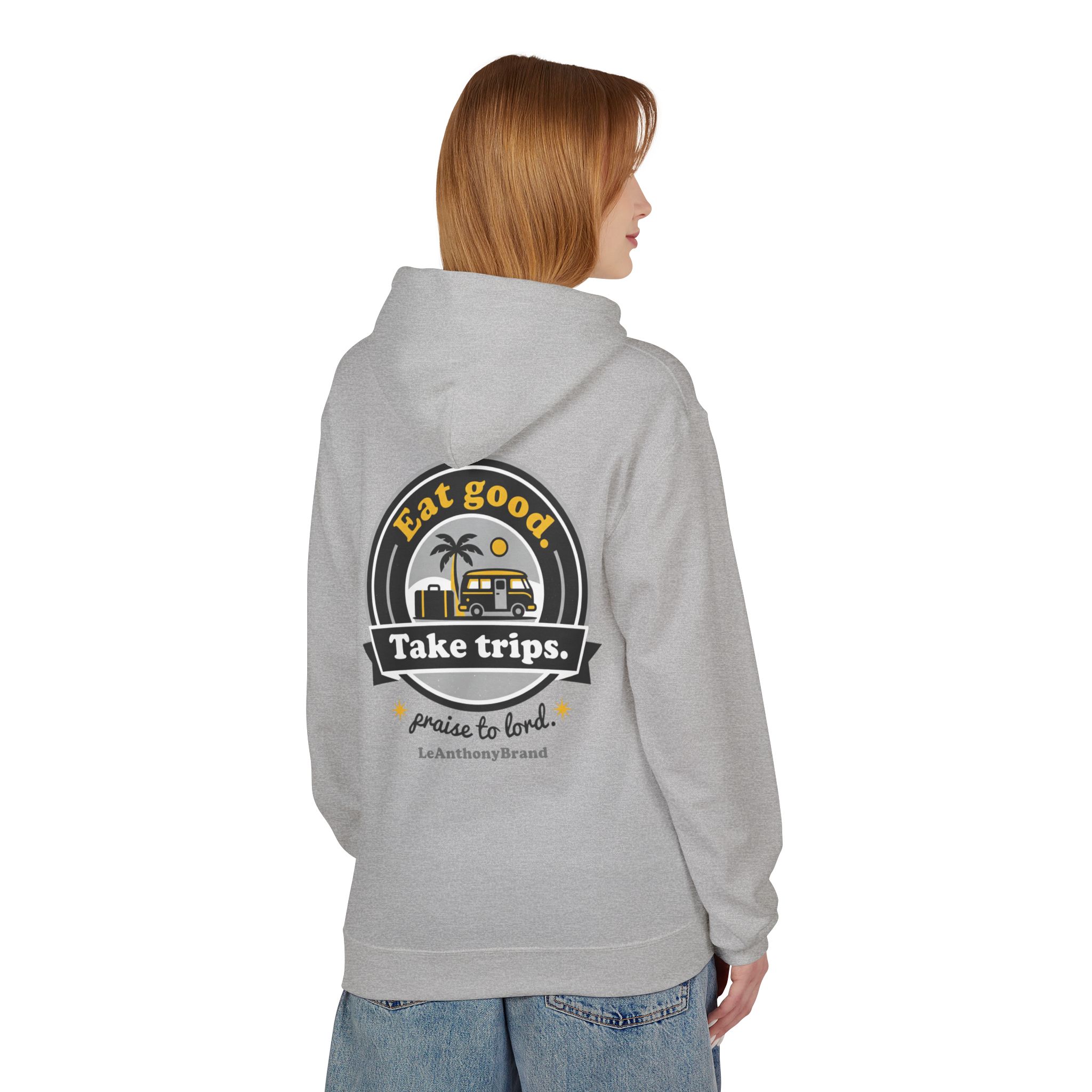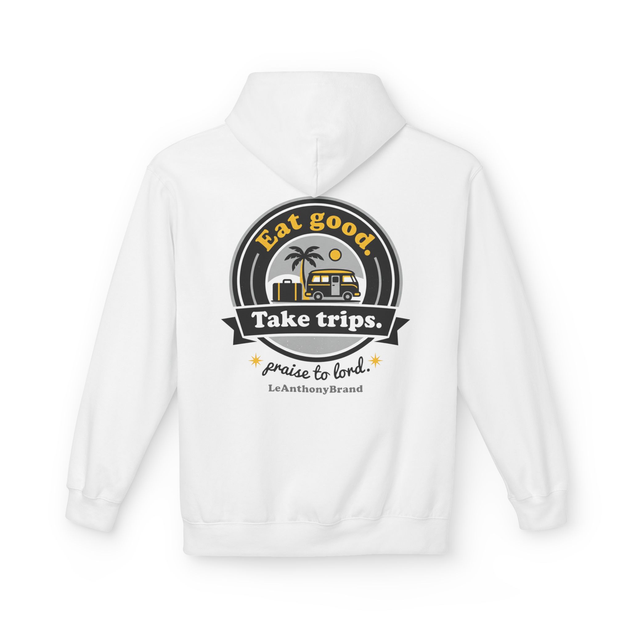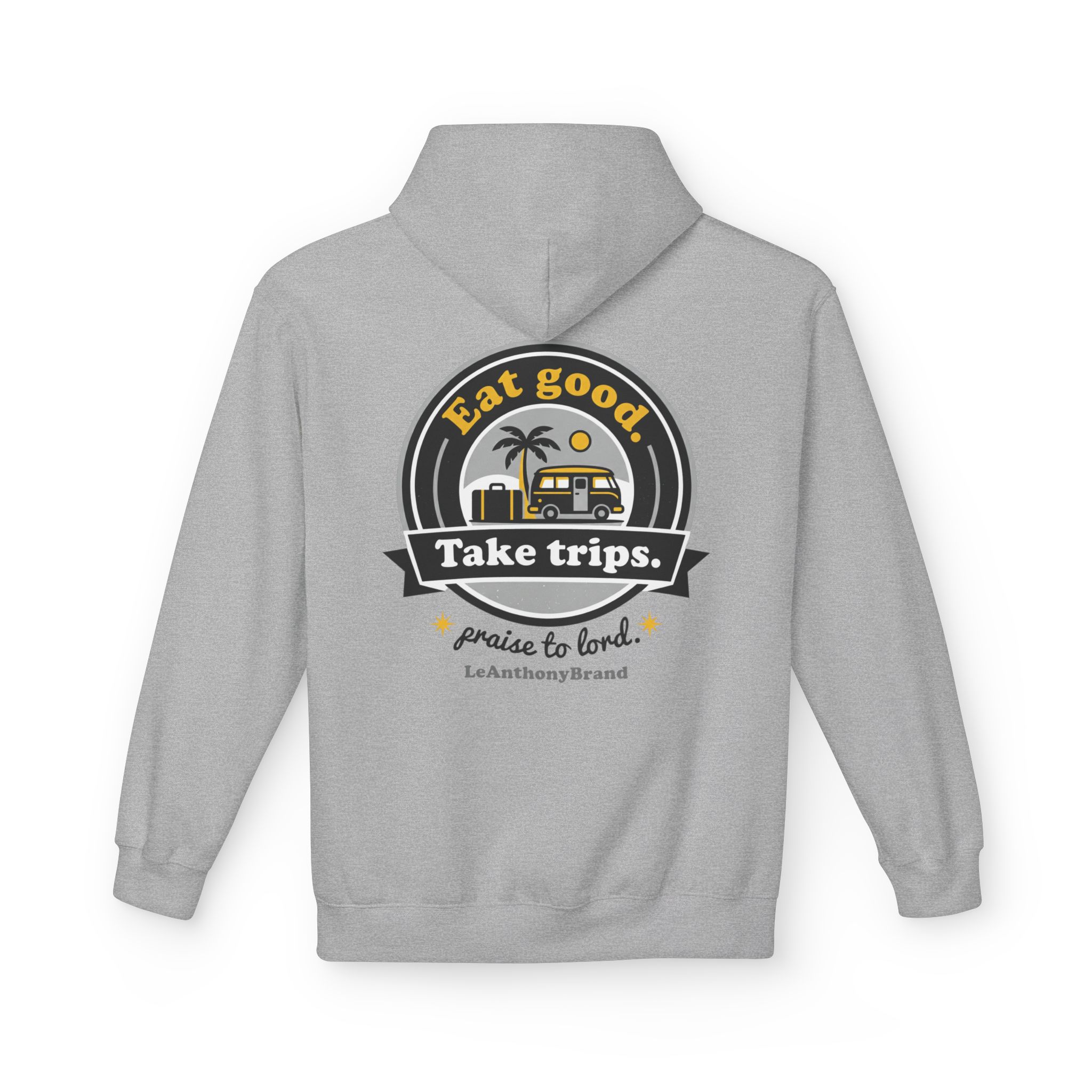 This midweight hoodie feels like a quiet morning on the road: warm, slightly lived-in, and ready for the next detour. The front chest holds a subtle travel emblem while the back wears a bold, sunlit camper graphic that reads “Eat good. Take trips.” — a gentle call to slow mornings, roadside diners, and palm-tree sunsets. The dropped shoulders and classic fit let you move easily between the driver’s seat and a picnic blanket. Soft ring-spun cotton with a cotton face gives a cozy hand, and the lined two-piece hood and pouch pocket keep hands and small treasures protected. Made in sustainably-minded facilities and OEKO-TEX certified, it’s comfortable to wear and responsibly produced, meant for people who collect miles and moments rather than things.