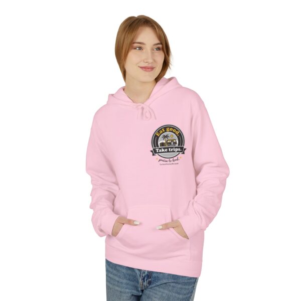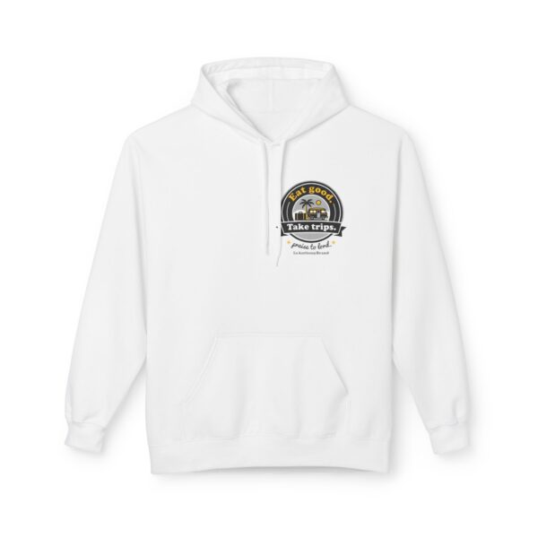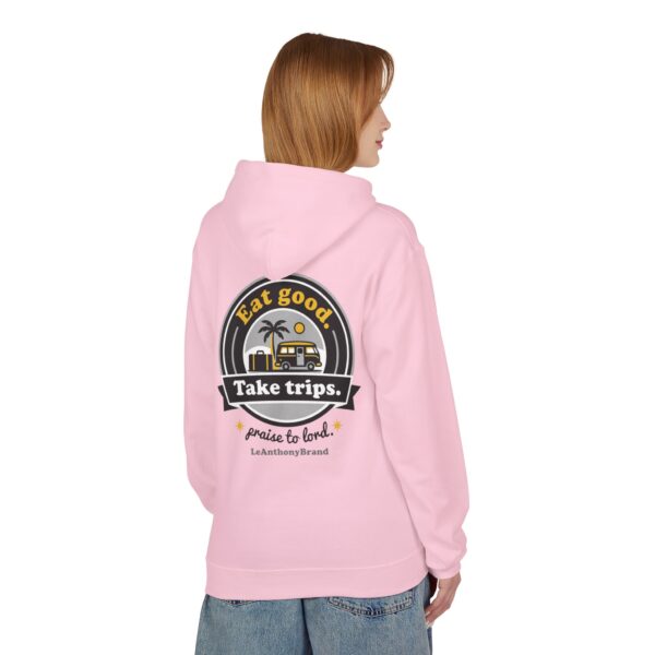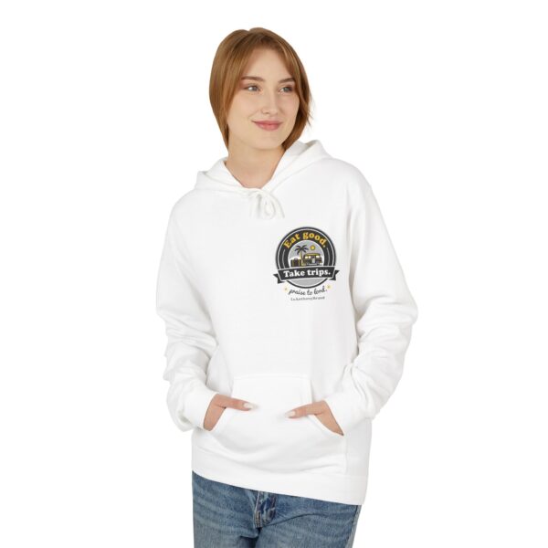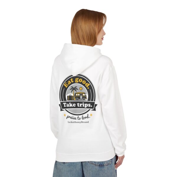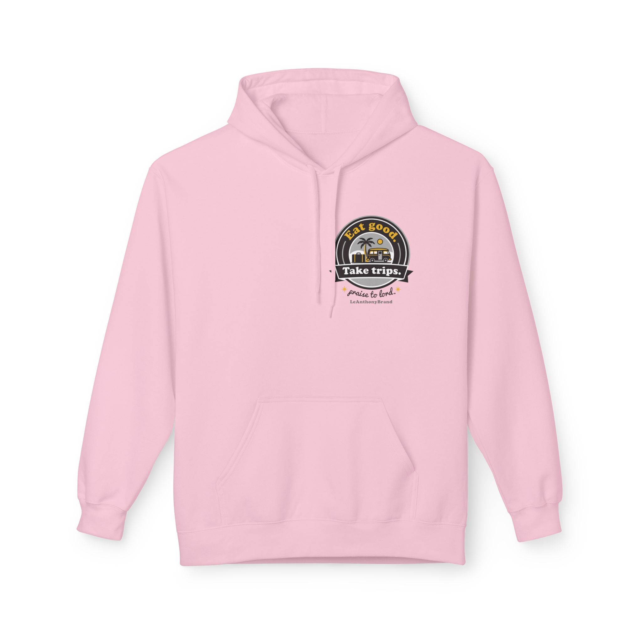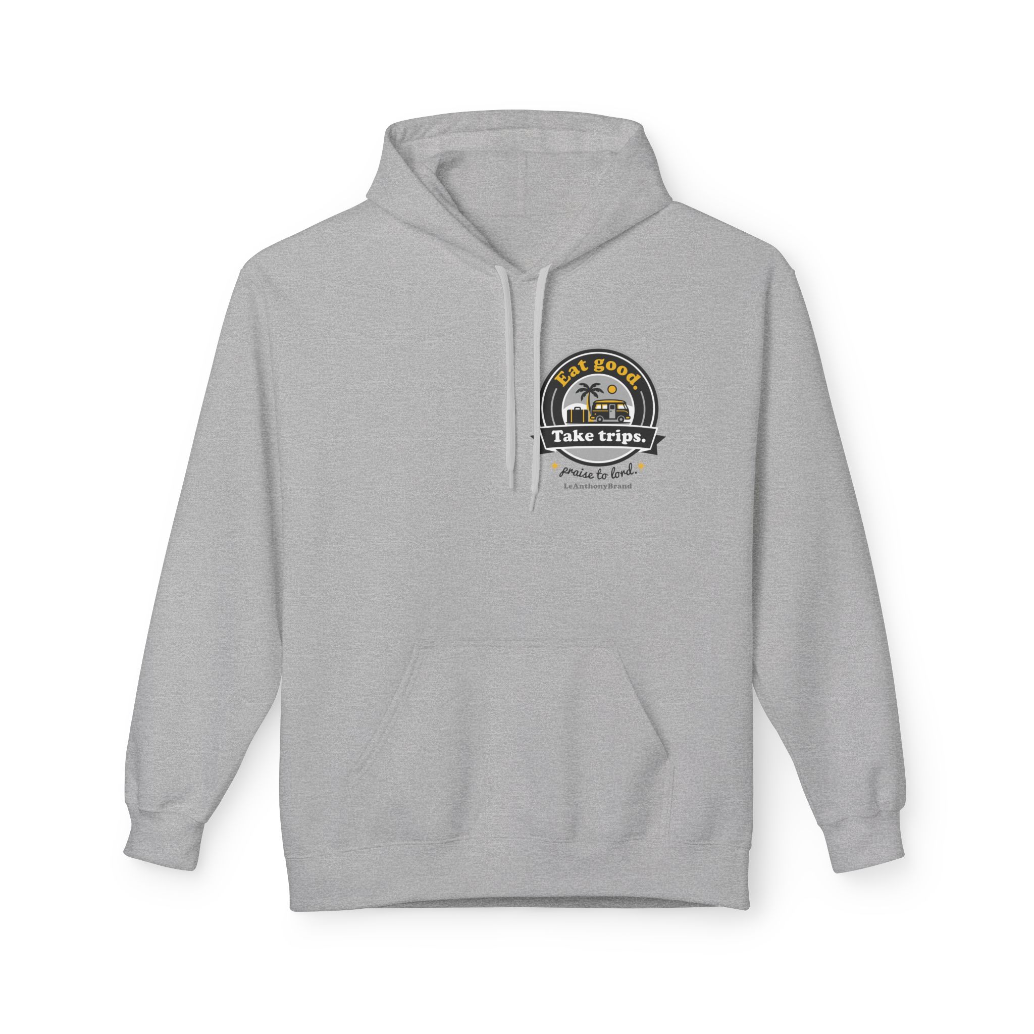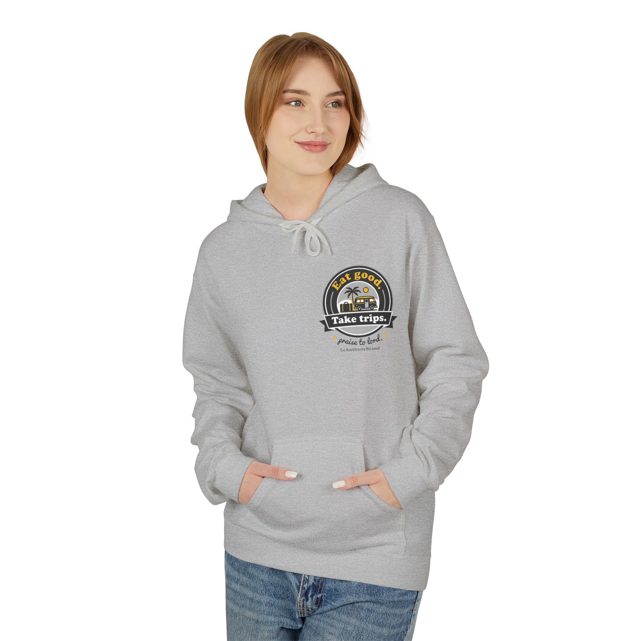 This midweight hoodie feels like a quiet morning on the road: warm, slightly lived-in, and ready for the next detour. The front chest holds a subtle travel emblem while the back wears a bold, sunlit camper graphic that reads “Eat good. Take trips.” — a gentle call to slow mornings, roadside diners, and palm-tree sunsets. The dropped shoulders and classic fit let you move easily between the driver’s seat and a picnic blanket. Soft ring-spun cotton with a cotton face gives a cozy hand, and the lined two-piece hood and pouch pocket keep hands and small treasures protected. Made in sustainably-minded facilities and OEKO-TEX certified, it’s comfortable to wear and responsibly produced, meant for people who collect miles and moments rather than things.