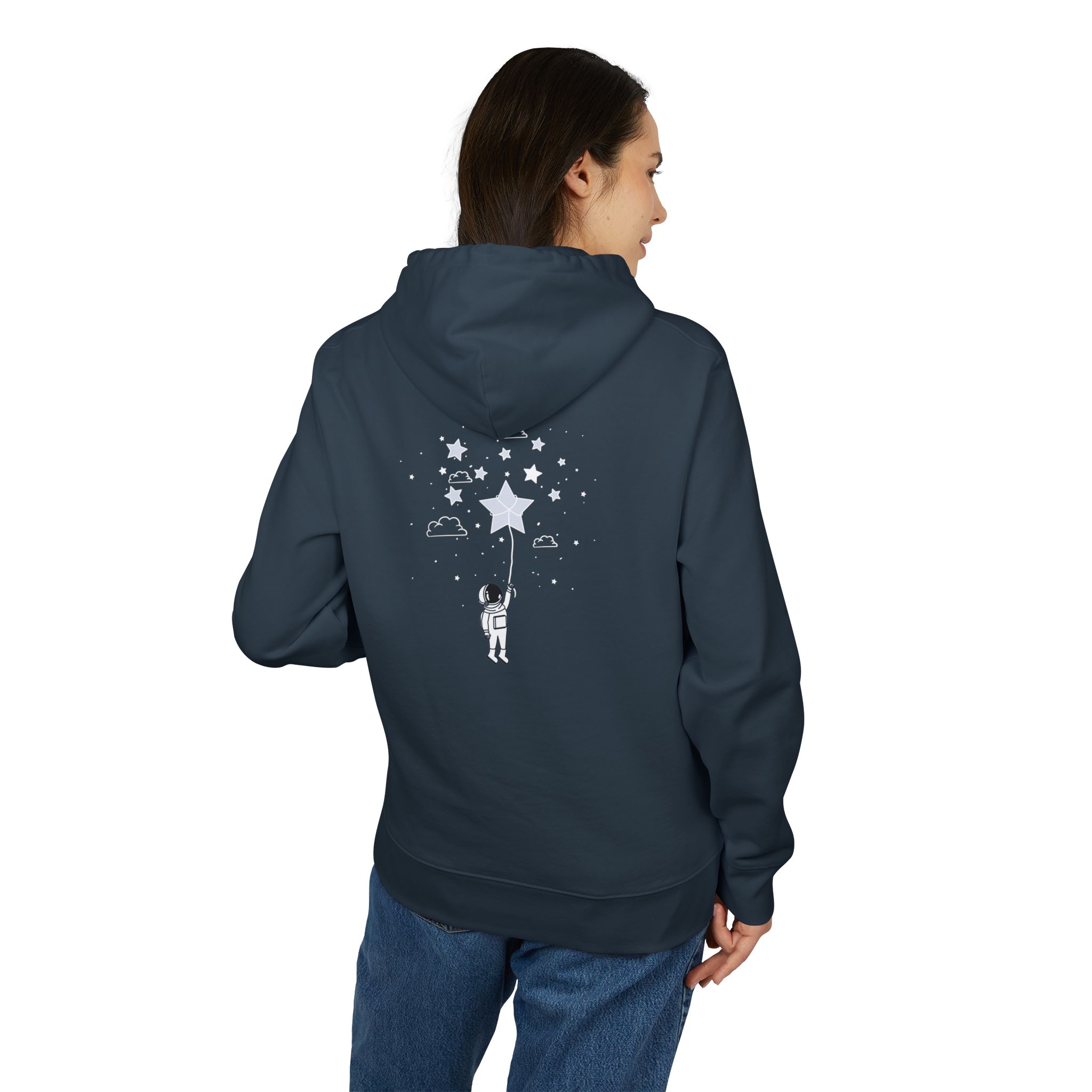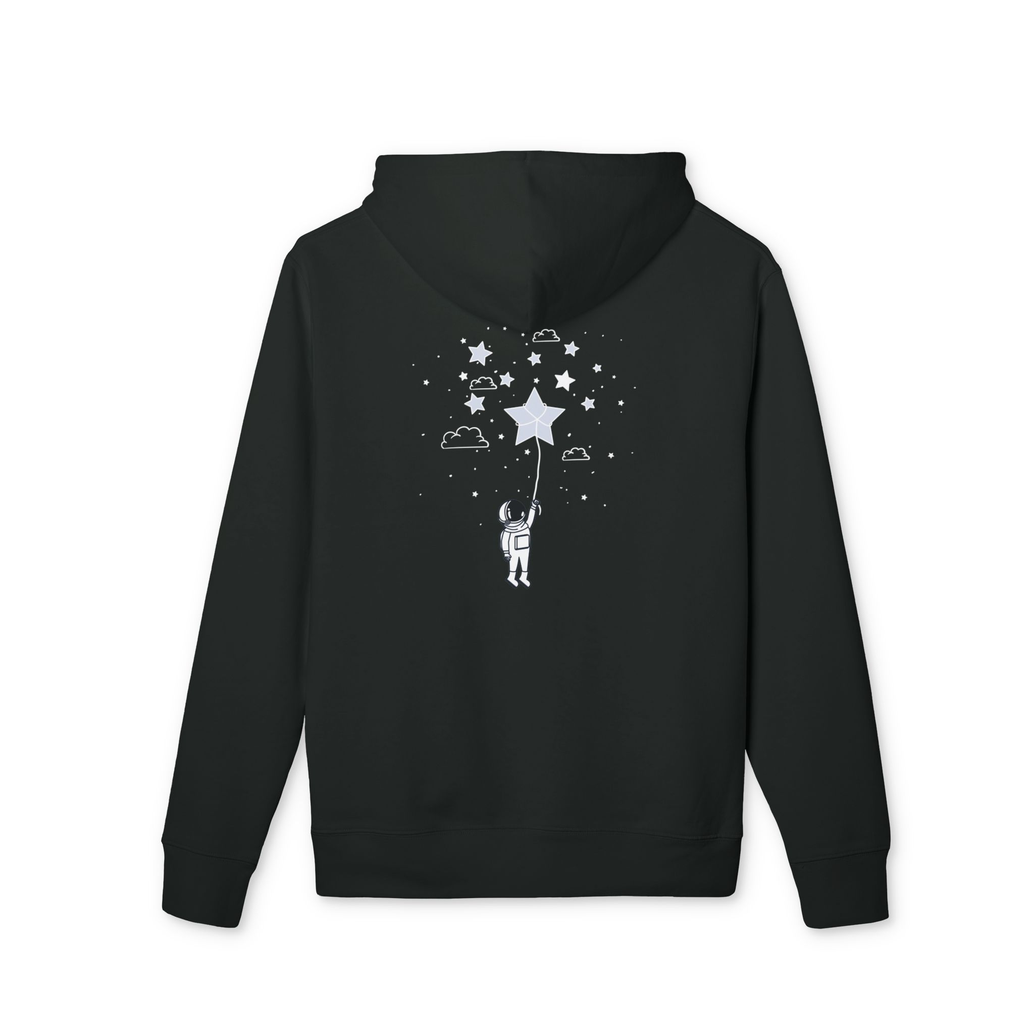 A heavyweight organic cotton hoodie that feels like a quiet night sky wrapped around you. The black fabric is garment-washed for immediate softness and features a subtle chest emblem, while the back shows a small astronaut reaching for a glowing star among scattered clouds and constellations. It sits with a regular fit, roomy kangaroo pocket, and sturdy metal-tipped drawcords — built to last and age gracefully. Wear it on late-night walks, while sketching under a lamp, or whenever you want a calm, imaginative layer that speaks to curiosity and quiet adventure.