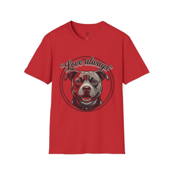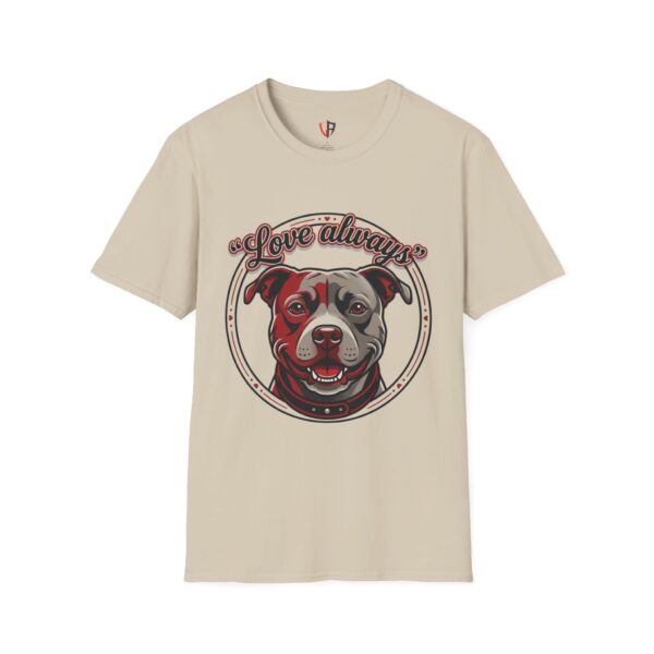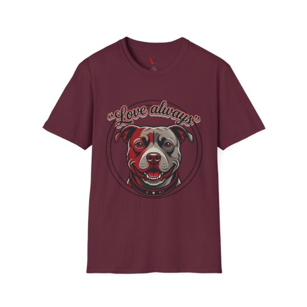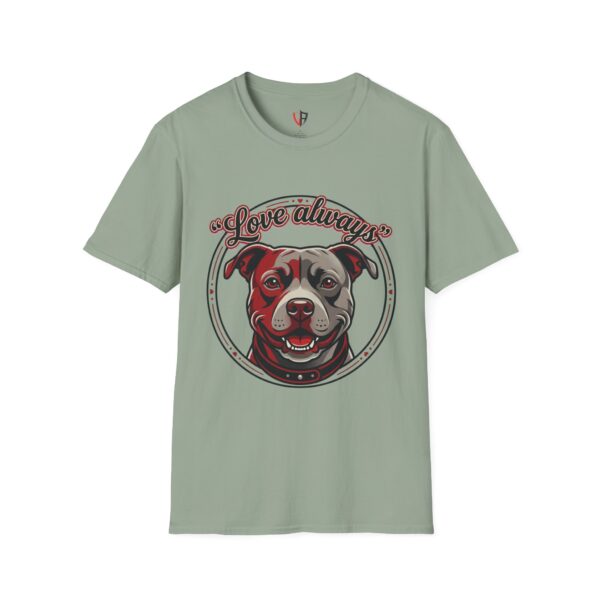 This lightweight crew-neck tee carries warmth in its print: a smiling pit bull portrait framed with the hand-lettered phrase “Love always” on the front, and a bold back graphic that reads “stay loyal, stay honest, stay true.” The art feels like a quiet neighborhood promise — honest, protective, and affectionate — so the shirt reads as both tribute and personal creed. Wear it with jeans for weekend walks, layered under a jacket for cooler mornings, or as a soft reminder of the values you live by. The simply styled silhouette keeps the focus on the message and the dog’s welcoming face, making it an easily wearable piece that blends comfort with character.
