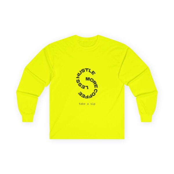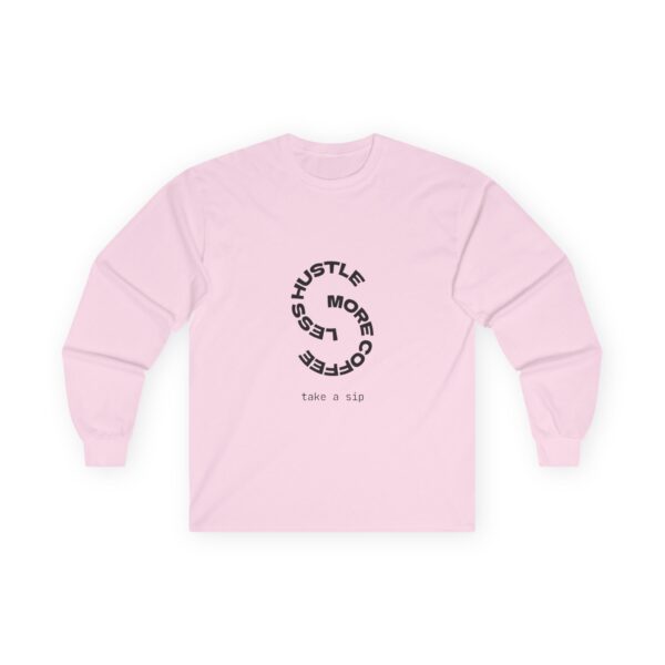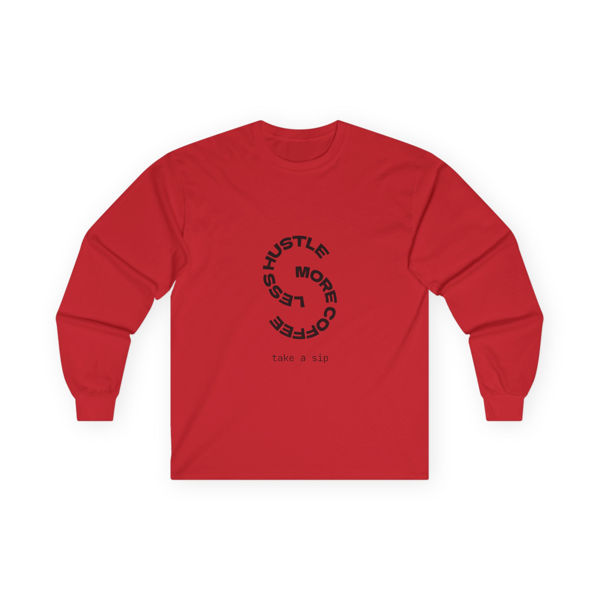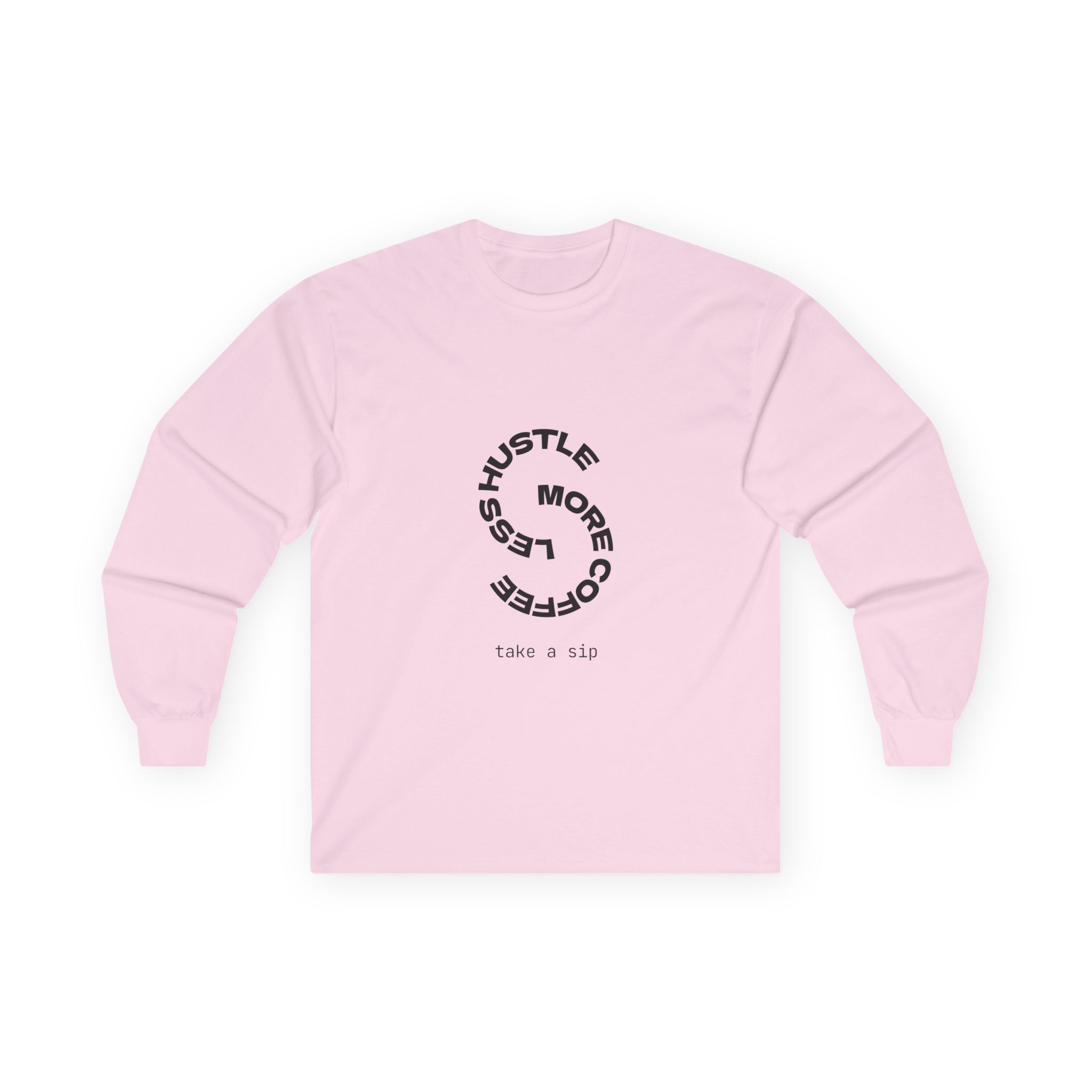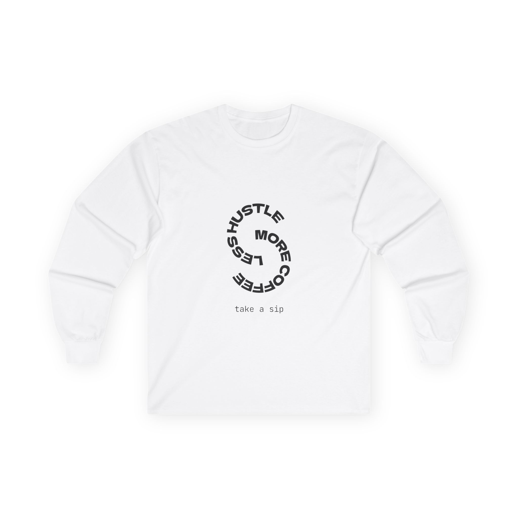 A soft, vintage-feel long sleeve that carries quiet confidence. The midweight cotton drapes like an everyday companion—structured but lived-in—while the circular “HUSTLE MORE, LESS COFFEE” chest graphic keeps the look minimal and witty. Slip it on for early mornings at the studio, late-night side projects, or slow coffee runs when you want to feel deliberate, not rushed. The tubular knit and shoulder taping keep the shoulders neat after repeated wears. Slightly snug in fit, it wears like a familiar layer that nudges you forward without shouting for attention.