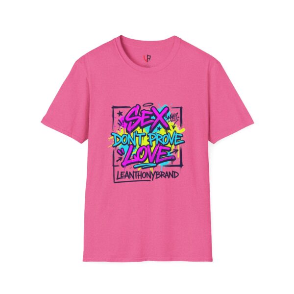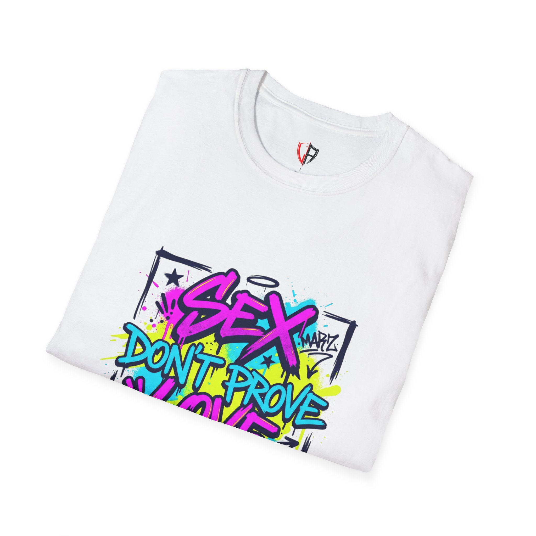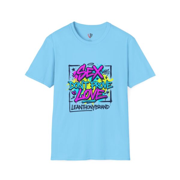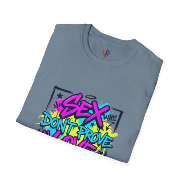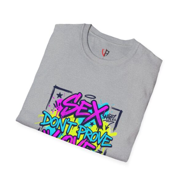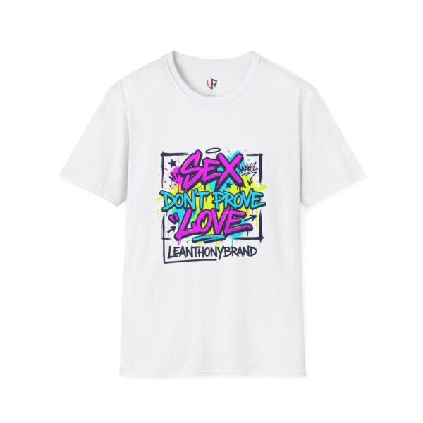 This lightweight crew tee carries a bold, streetwise attitude — bright graffiti lettering reads “Sex Don’t Prove Love” across a framed, sketched background. The print’s neon pinks, blues and yellows pop against the clean white fabric, creating a punchy, urban statement piece that feels lived-in and confident. Wear it when you want your outfit to start a conversation: pair it with distressed denim, high-top sneakers, and a worn leather jacket for nights out, or layer it under an open flannel for daytime grit. The soft, breathable cotton and classic cut keep the focus on the art while staying comfortable through long shifts, late shows, or weekend walks with friends. It speaks to people who value honesty, bold visuals, and a bit of rebellious humor — a tee that matches outspoken playlists and city-lit nights.