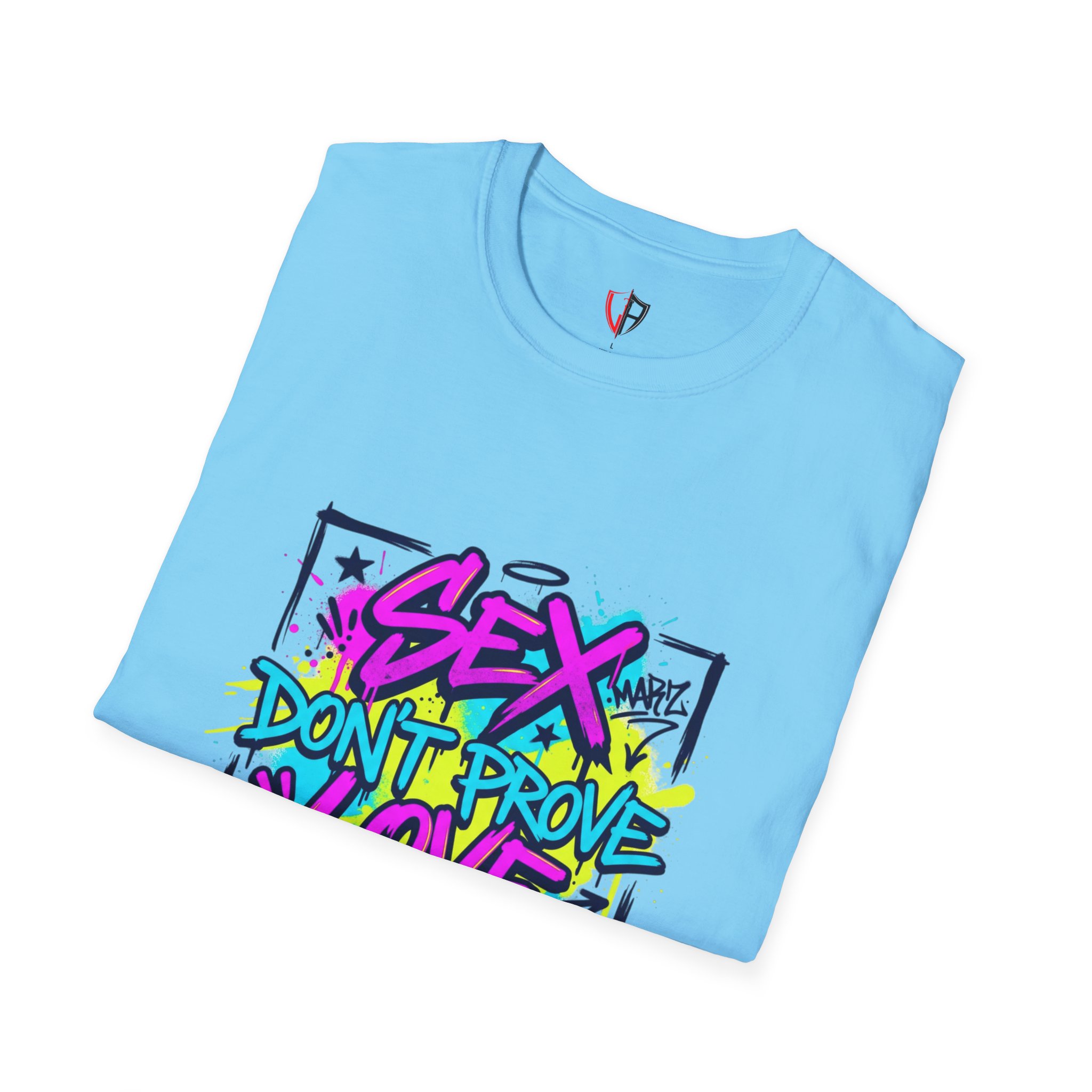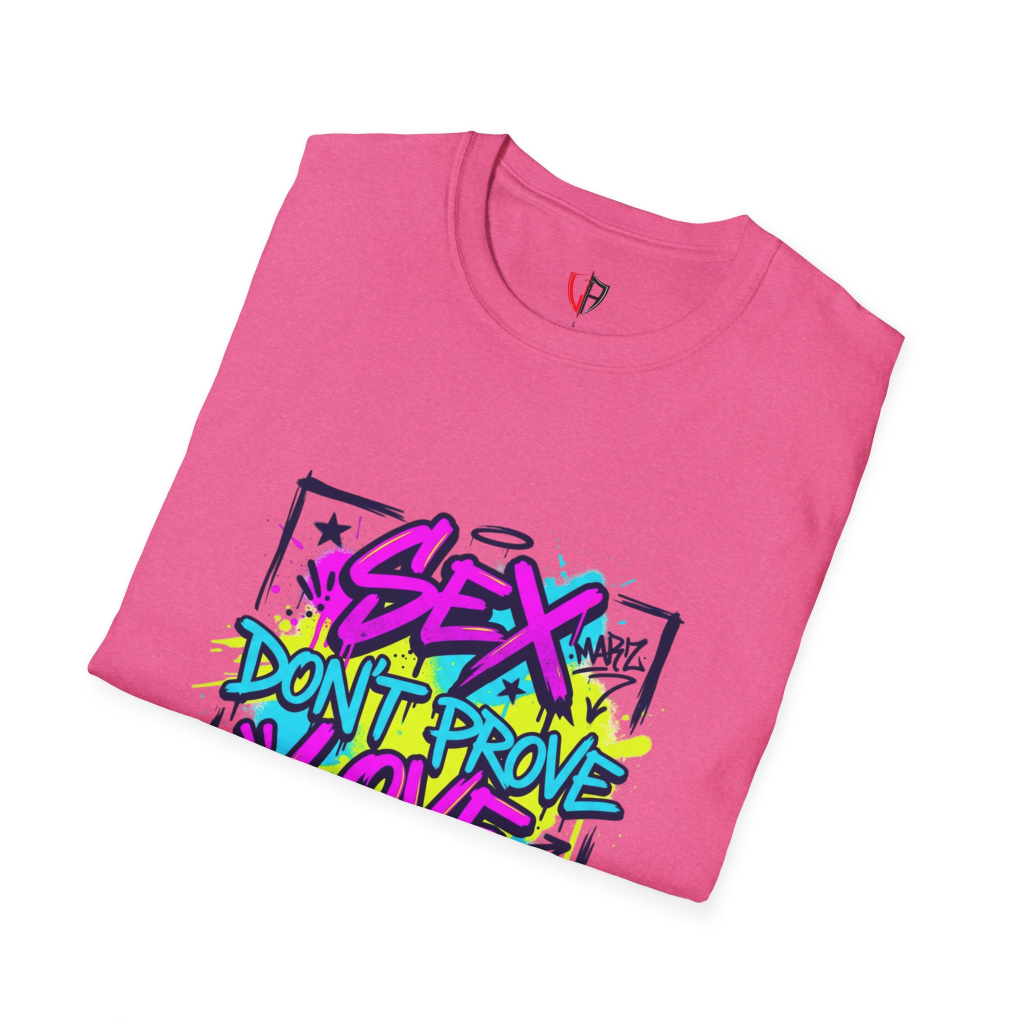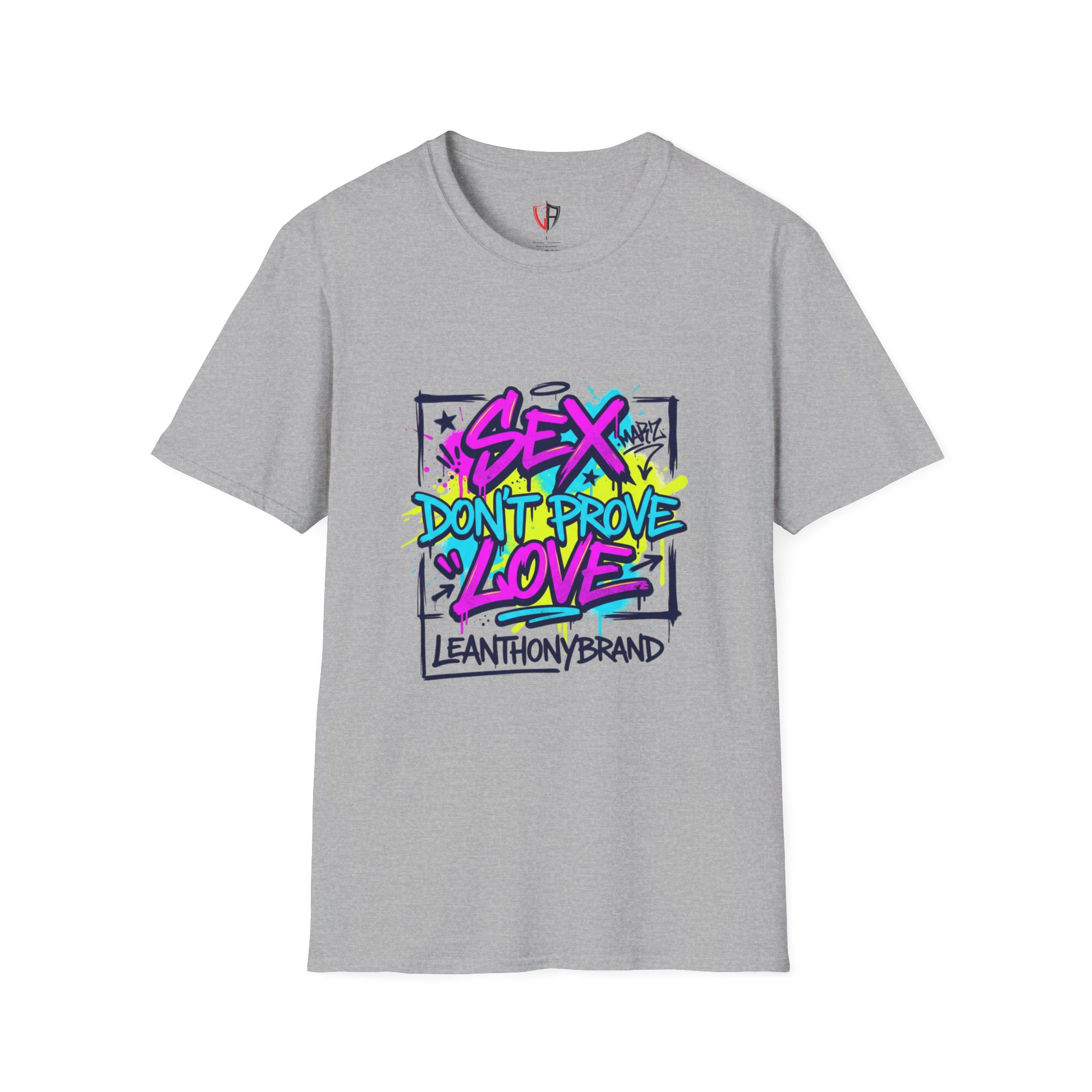 This lightweight crew tee carries a bold, streetwise attitude — bright graffiti lettering reads “Sex Don’t Prove Love” across a framed, sketched background. The print’s neon pinks, blues and yellows pop against the clean white fabric, creating a punchy, urban statement piece that feels lived-in and confident. Wear it when you want your outfit to start a conversation: pair it with distressed denim, high-top sneakers, and a worn leather jacket for nights out, or layer it under an open flannel for daytime grit. The soft, breathable cotton and classic cut keep the focus on the art while staying comfortable through long shifts, late shows, or weekend walks with friends. It speaks to people who value honesty, bold visuals, and a bit of rebellious humor — a tee that matches outspoken playlists and city-lit nights.
