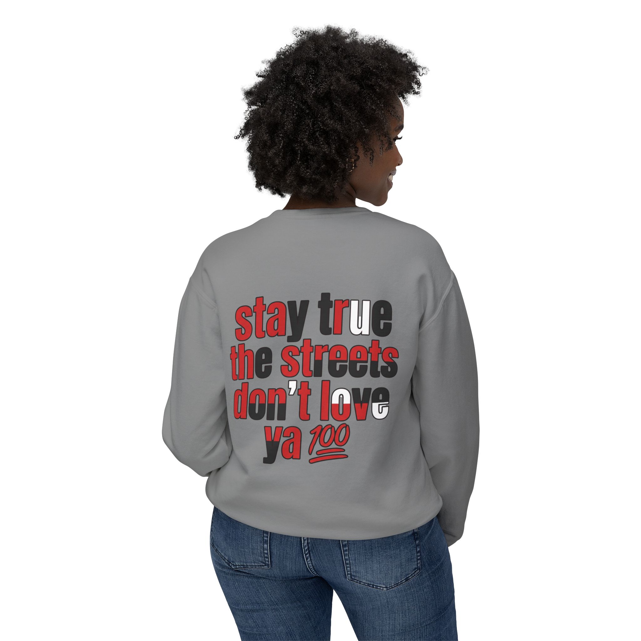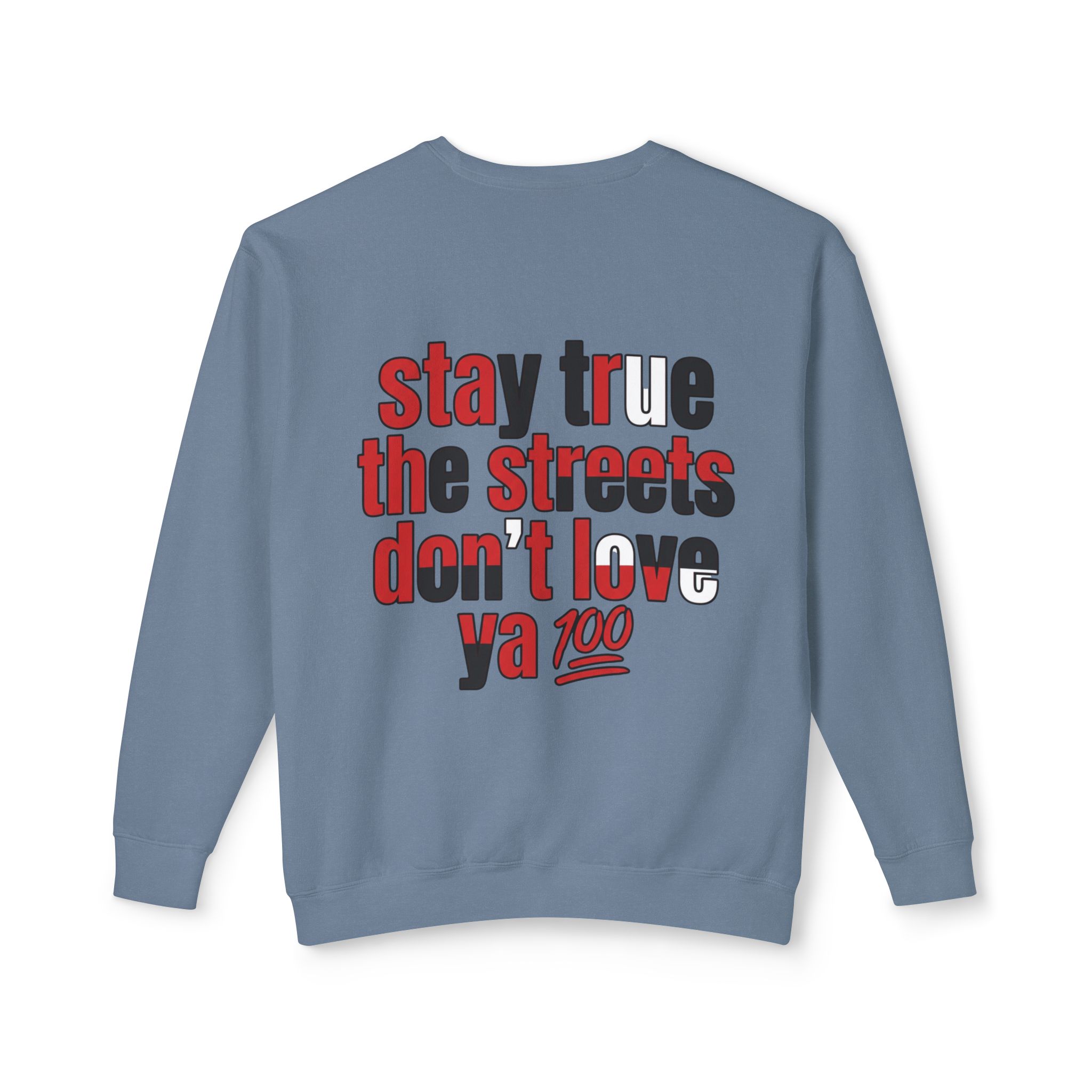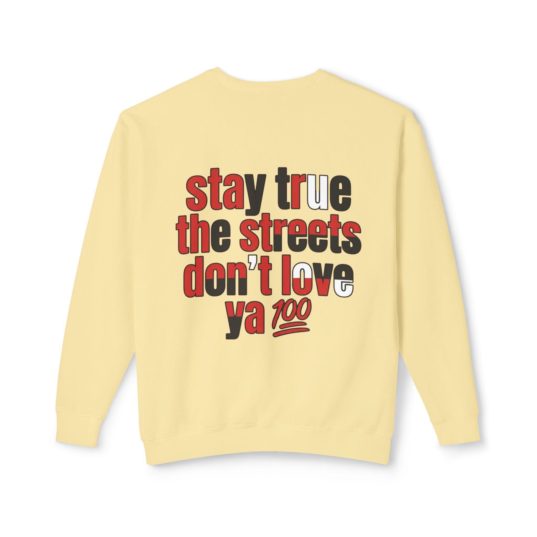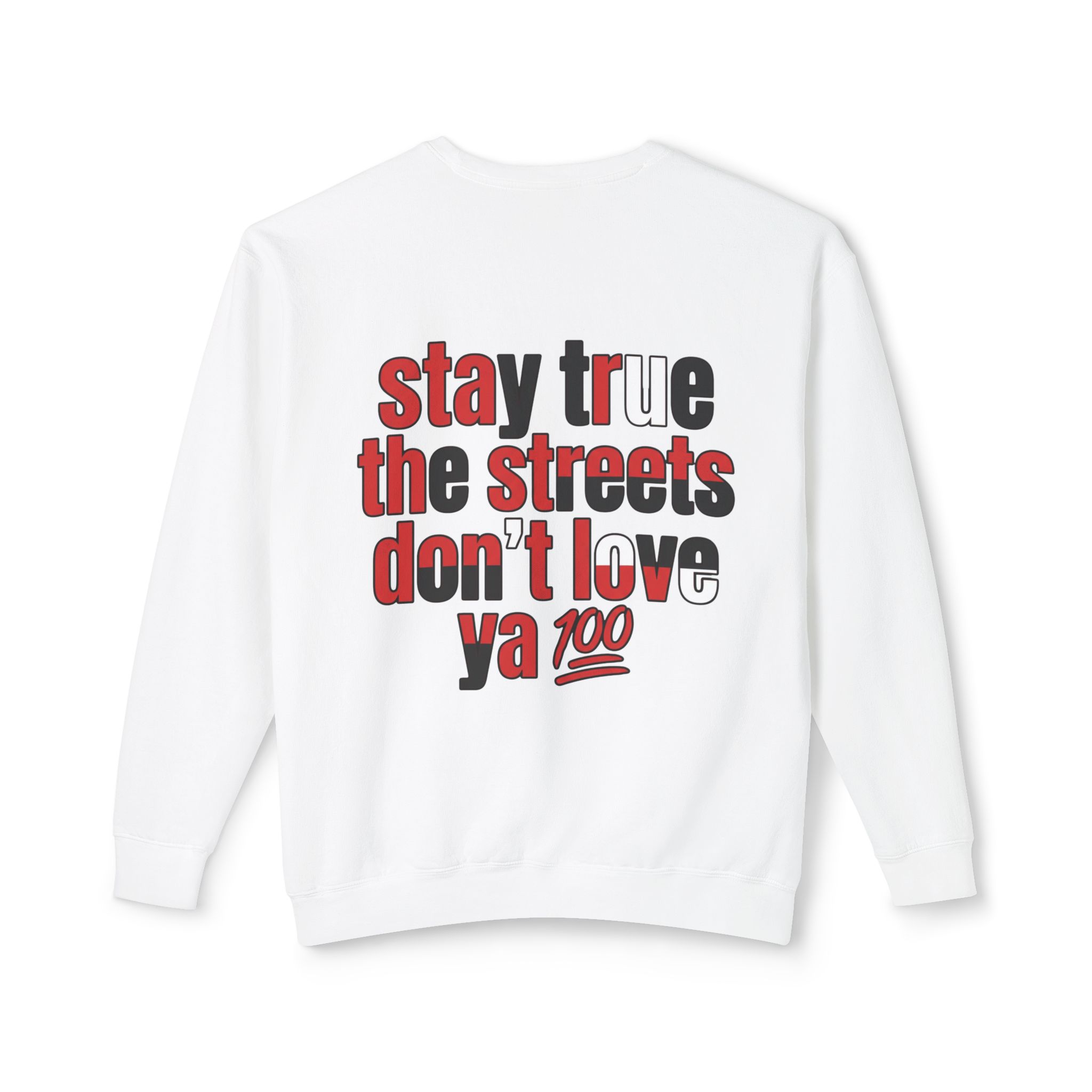 This lightweight crewneck sweatshirt carries quiet confidence — a soft, breathable cotton layer with bold streetwise graphics. The front features a small, red bull emblem; the back displays large, typographic art reading “stay true the streets don’t love ya” in red and black. It feels lived-in and easy to wear: relaxed fit, low-weight fabric, and clean tubular knit keep the silhouette simple so the message stands out. Wear it on cool evenings walking neighborhood blocks, at late-night meetups, or layered under a jacket for city errands. The design speaks to folks who value authenticity and grit — it’s a wearable nod to loyalty, hustle, and keeping your edge.