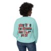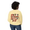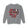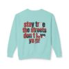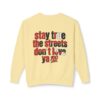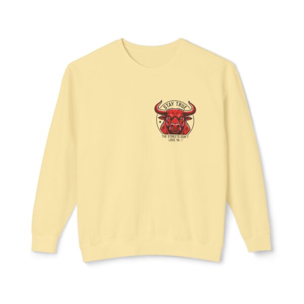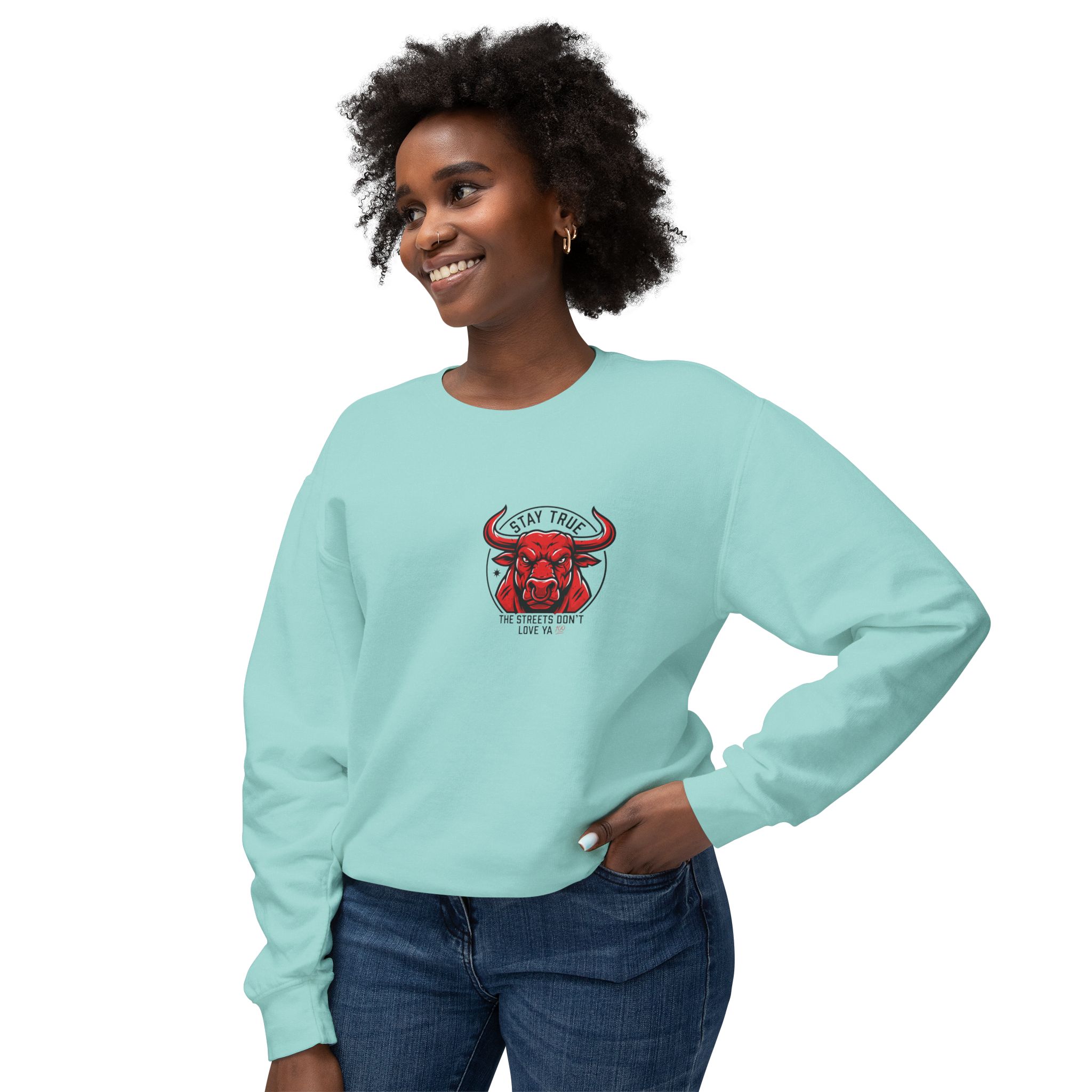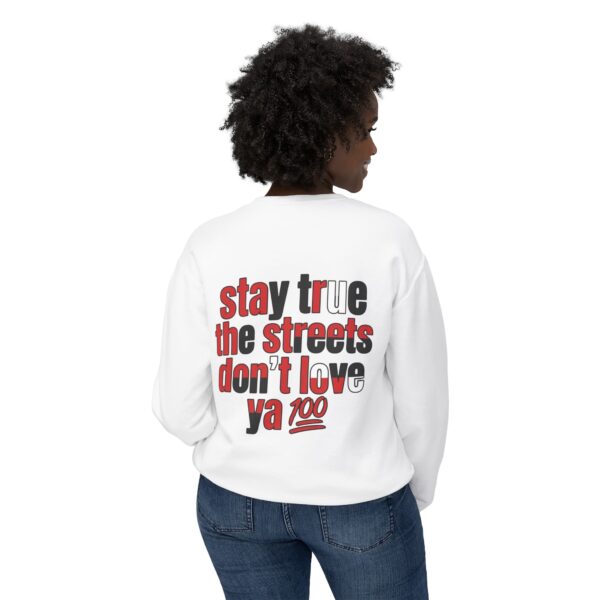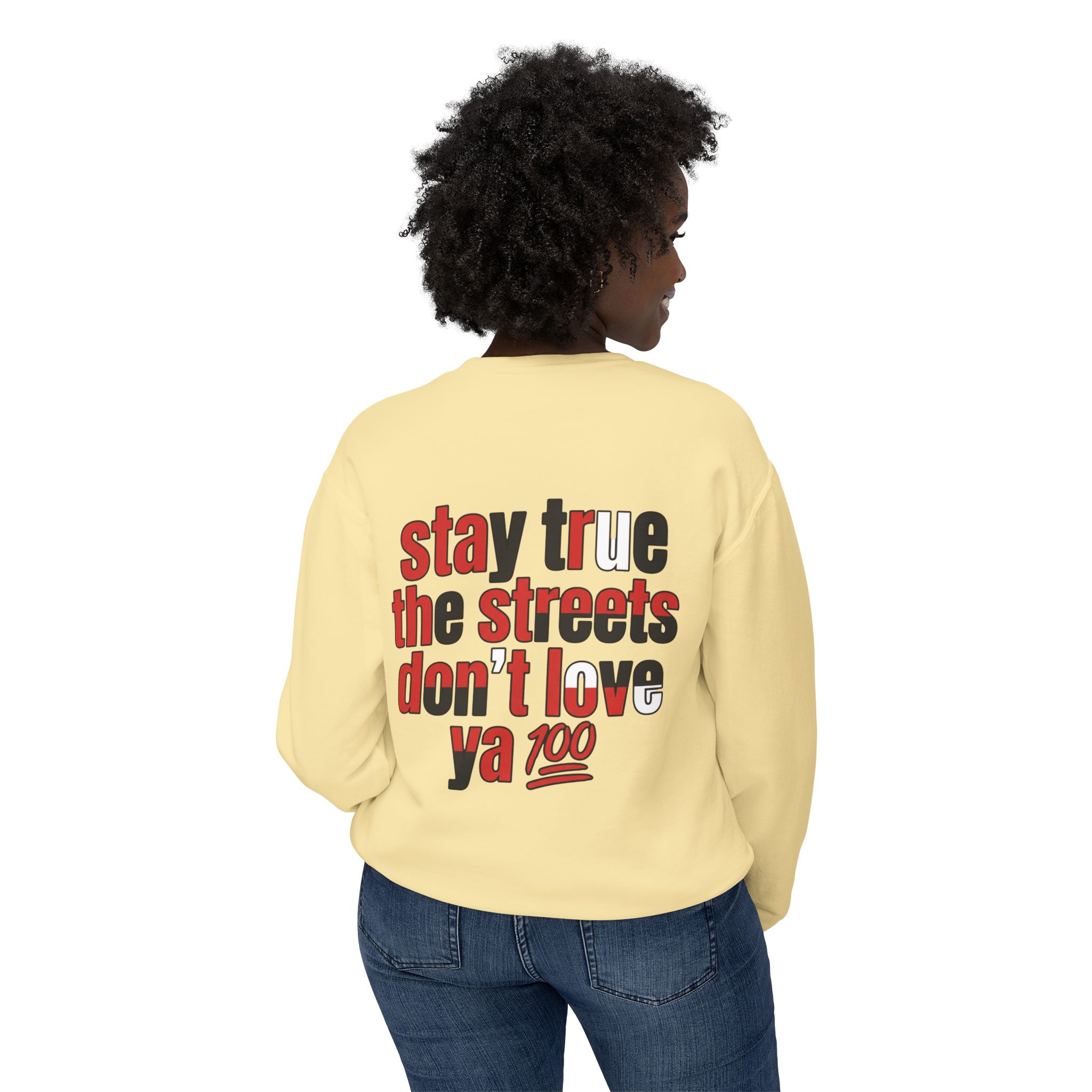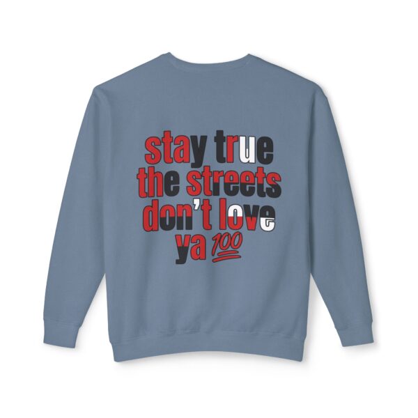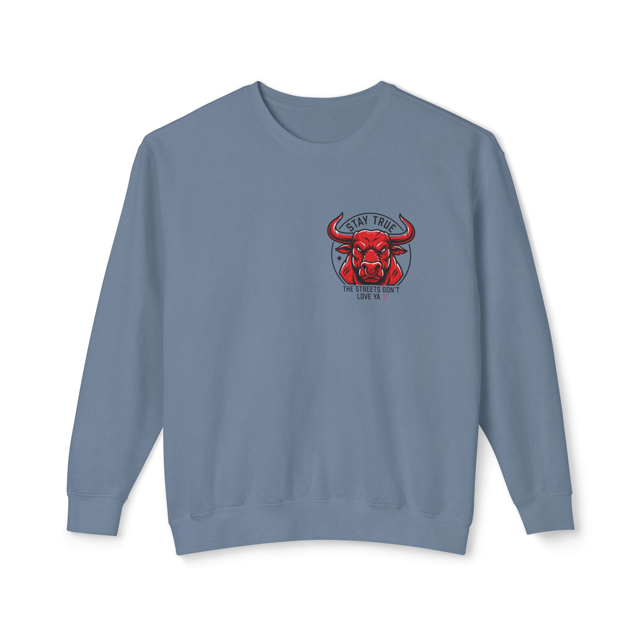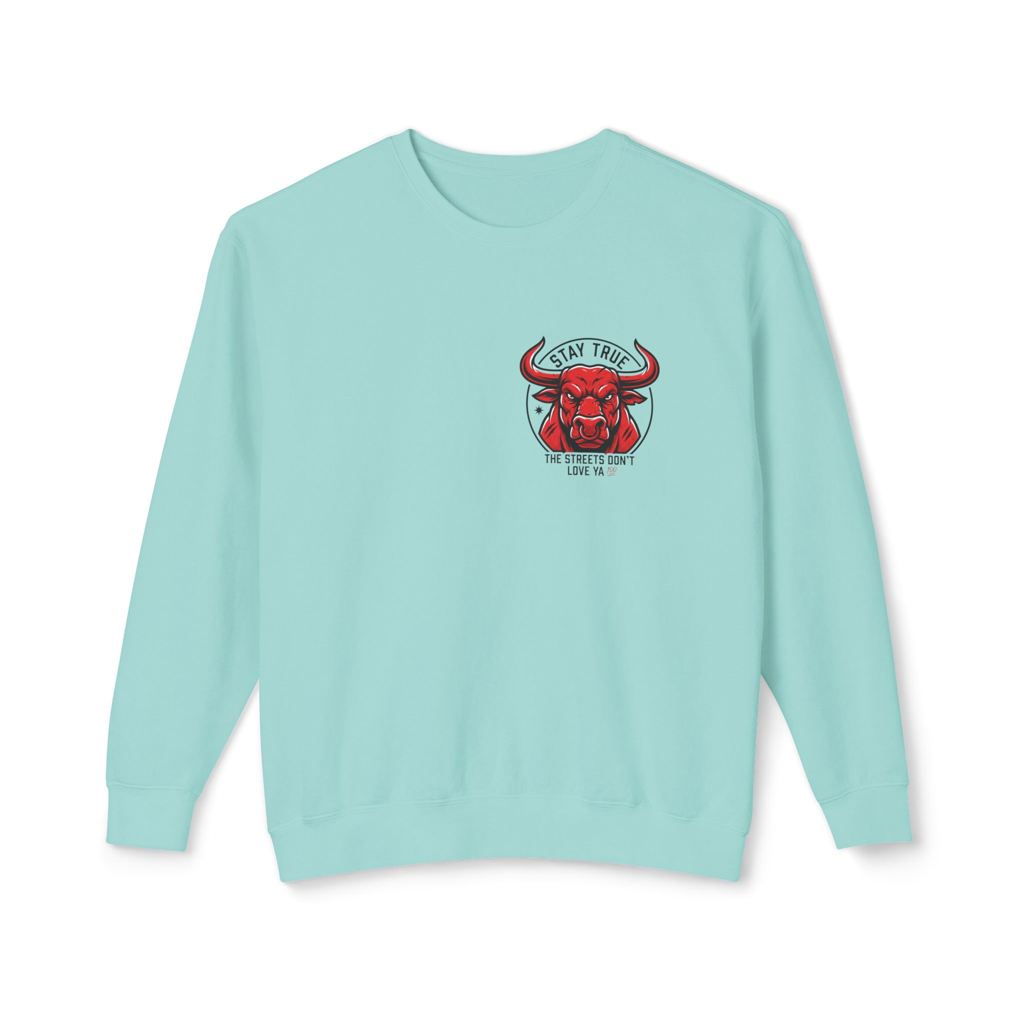 This lightweight crewneck sweatshirt carries quiet confidence — a soft, breathable cotton layer with bold streetwise graphics. The front features a small, red bull emblem; the back displays large, typographic art reading “stay true the streets don’t love ya” in red and black. It feels lived-in and easy to wear: relaxed fit, low-weight fabric, and clean tubular knit keep the silhouette simple so the message stands out. Wear it on cool evenings walking neighborhood blocks, at late-night meetups, or layered under a jacket for city errands. The design speaks to folks who value authenticity and grit — it’s a wearable nod to loyalty, hustle, and keeping your edge.
