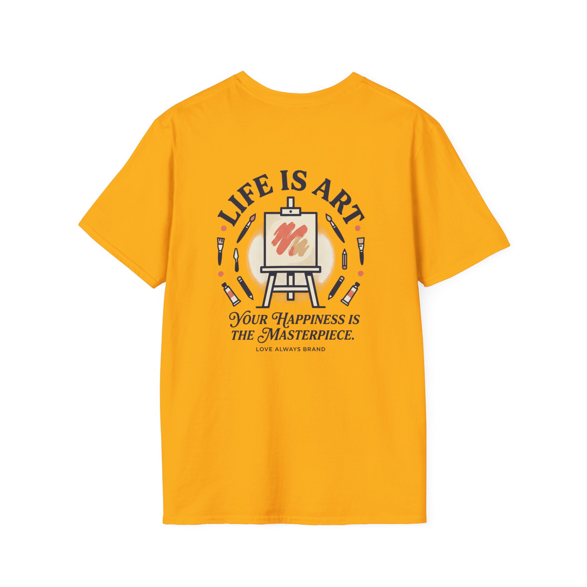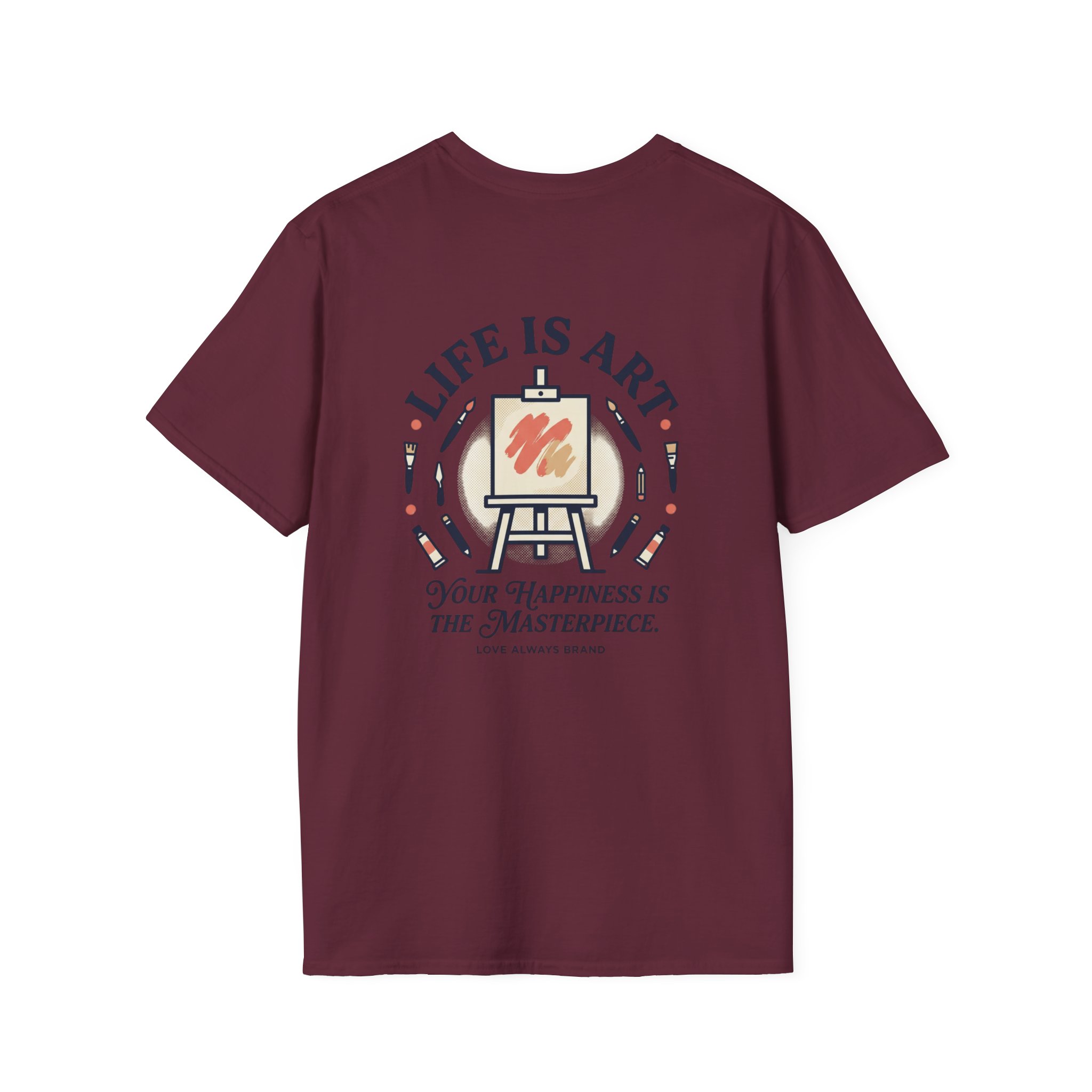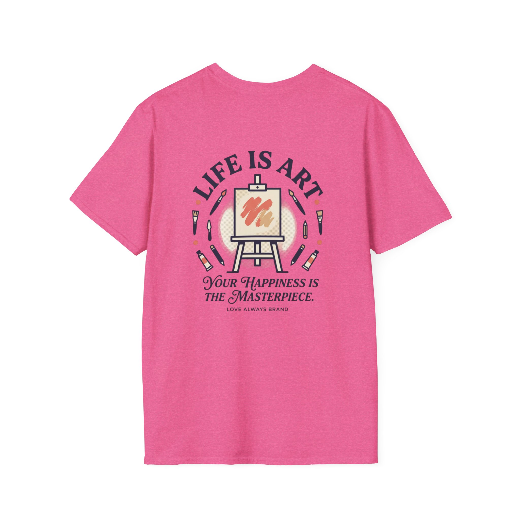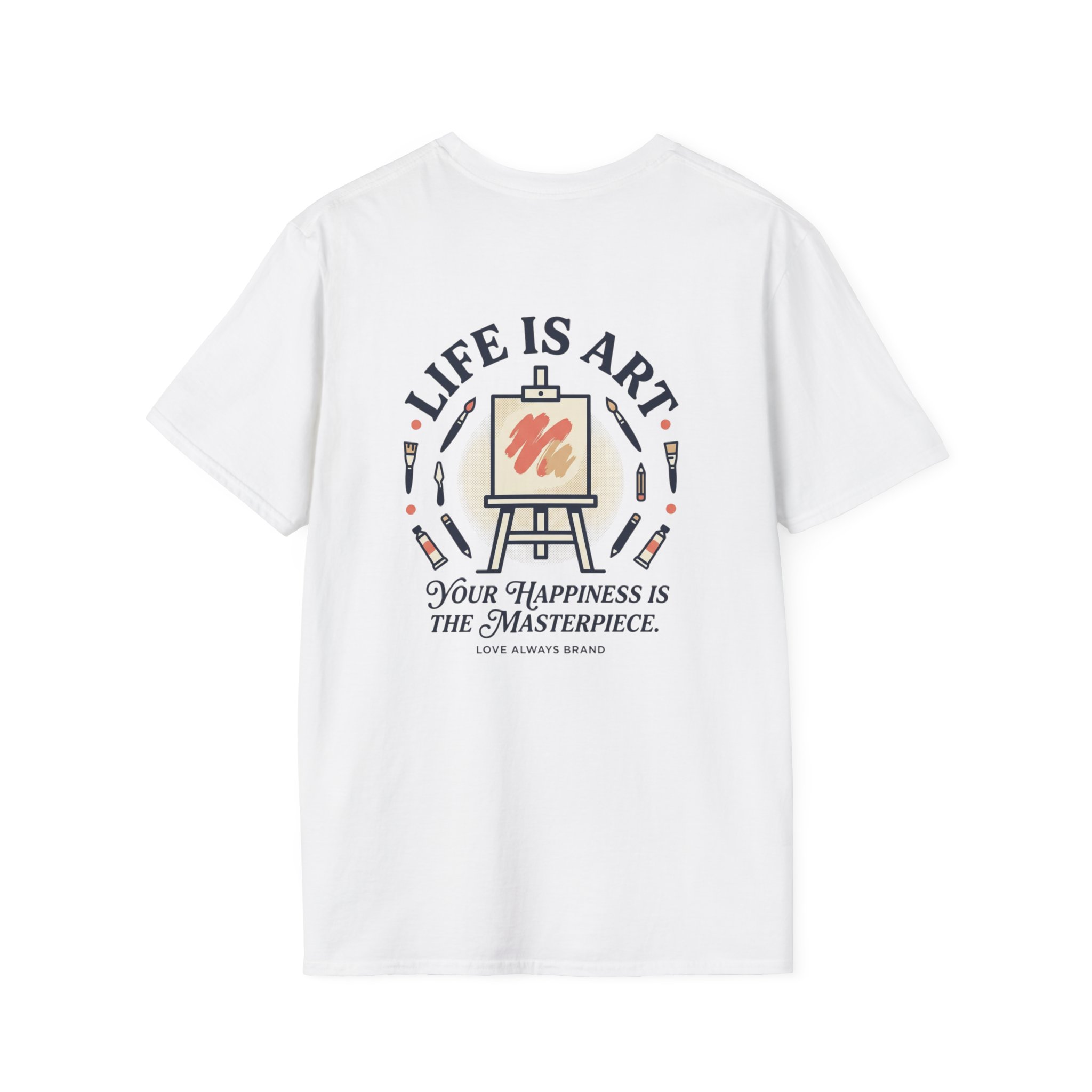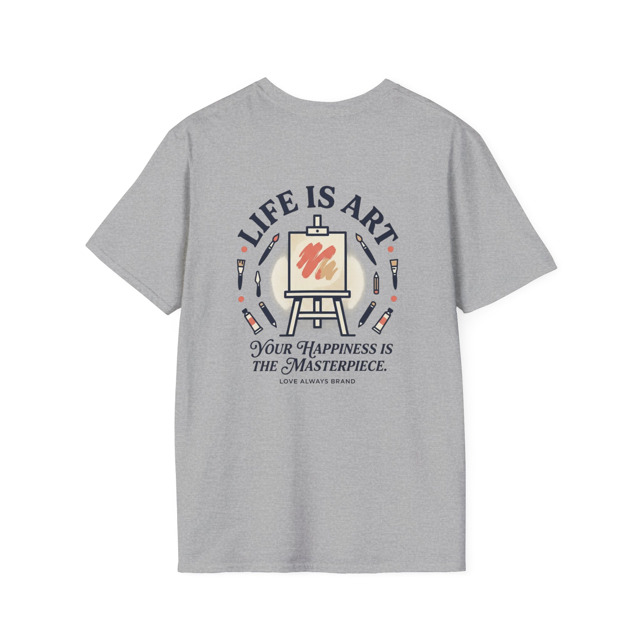 Soft, breathable, and lightly structured — this tee carries a gentle, artful message that settles like a friend’s reminder. A small chest patch nudges curiosity; the back opens into a relaxed, uplifting scene: an easel with a single bold brushstroke framed by tubes of paint and the words “LIFE IS ART.” It’s a quiet companion for studio mornings, gallery strolls, and slow weekends spent sketching or daydreaming. The fabric drapes cleanly, the crew neck holds its shape, and printed inner labels keep irritation away so the focus stays on making and savoring small creative moments.