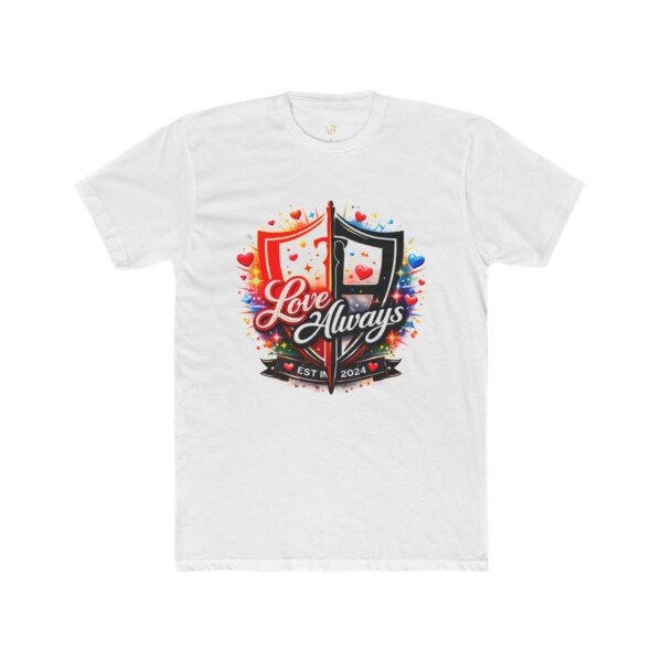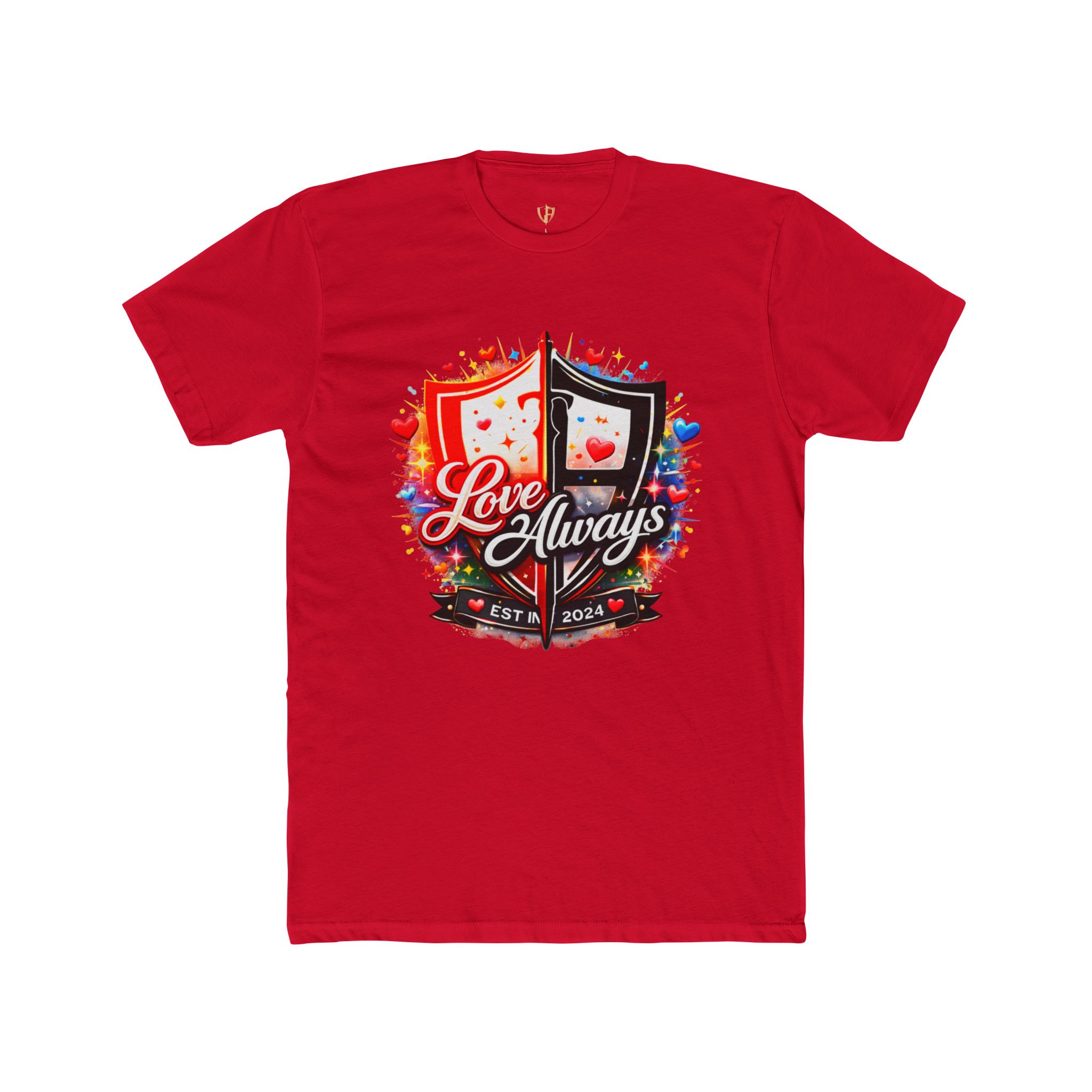 A soft, lightweight crew tee that carries a bold, romantic crest right over the heart. The graphic blends warm reds and deep blacks with playful hearts and confetti — ‘Love Always’ sits across the shield like a quiet promise. Wear it to celebrate an anniversary evening, a cozy date night, or a relaxed weekend where you want to say more with less. The classic crew neckline and clean lines make it easy to layer under a jacket or pair with denim. It’s breathable, subtly fitted, and made to keep its shape through repeated wear so that the message stays vivid and true.