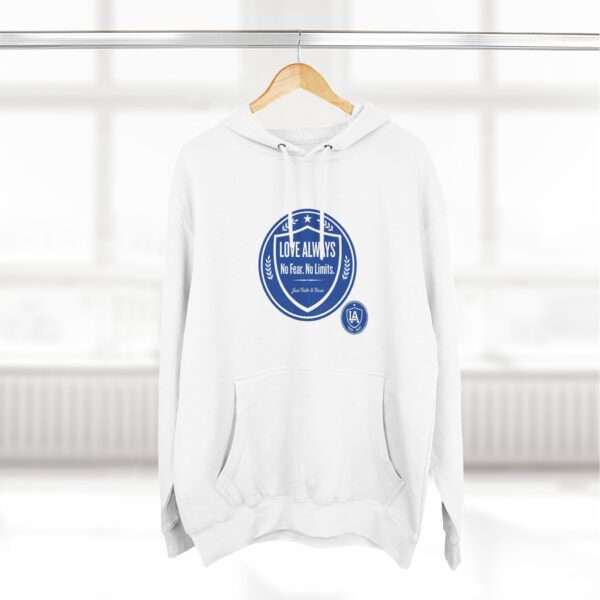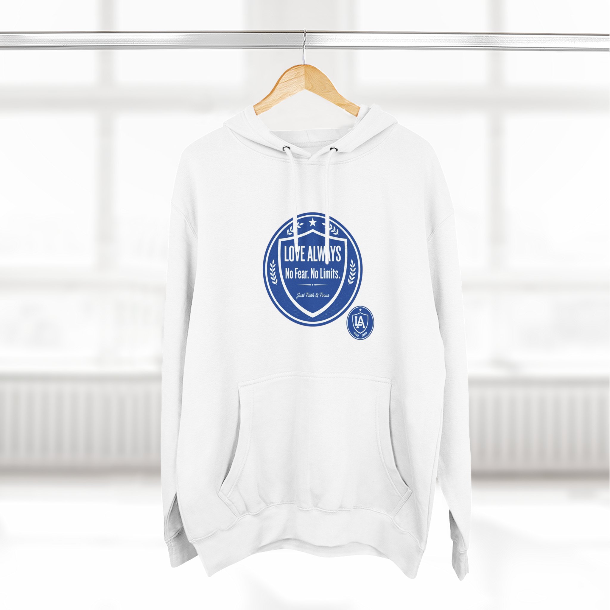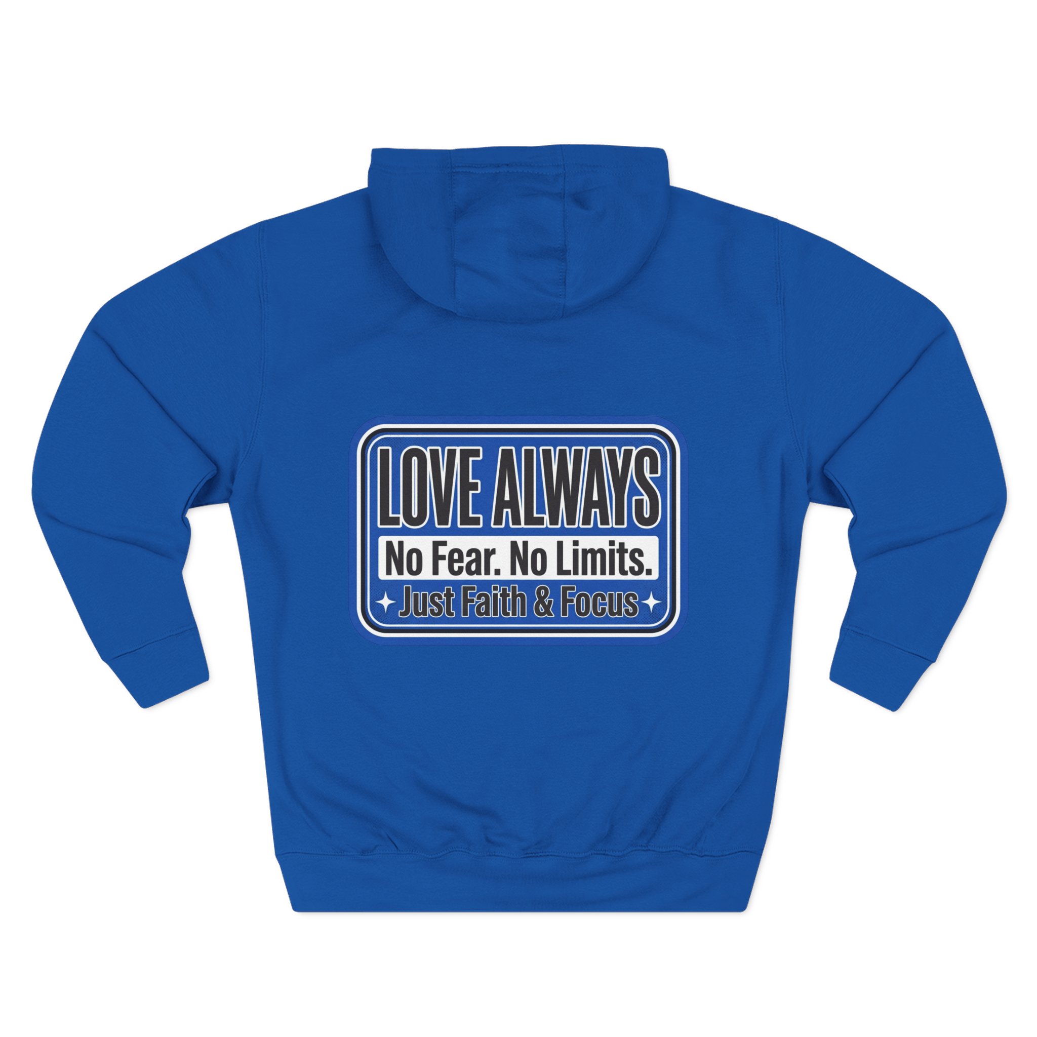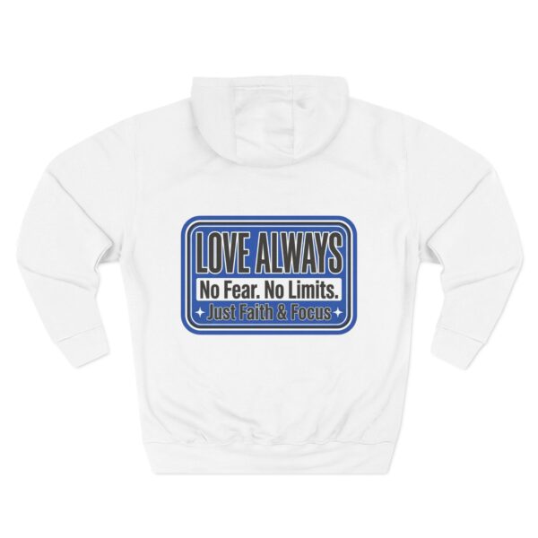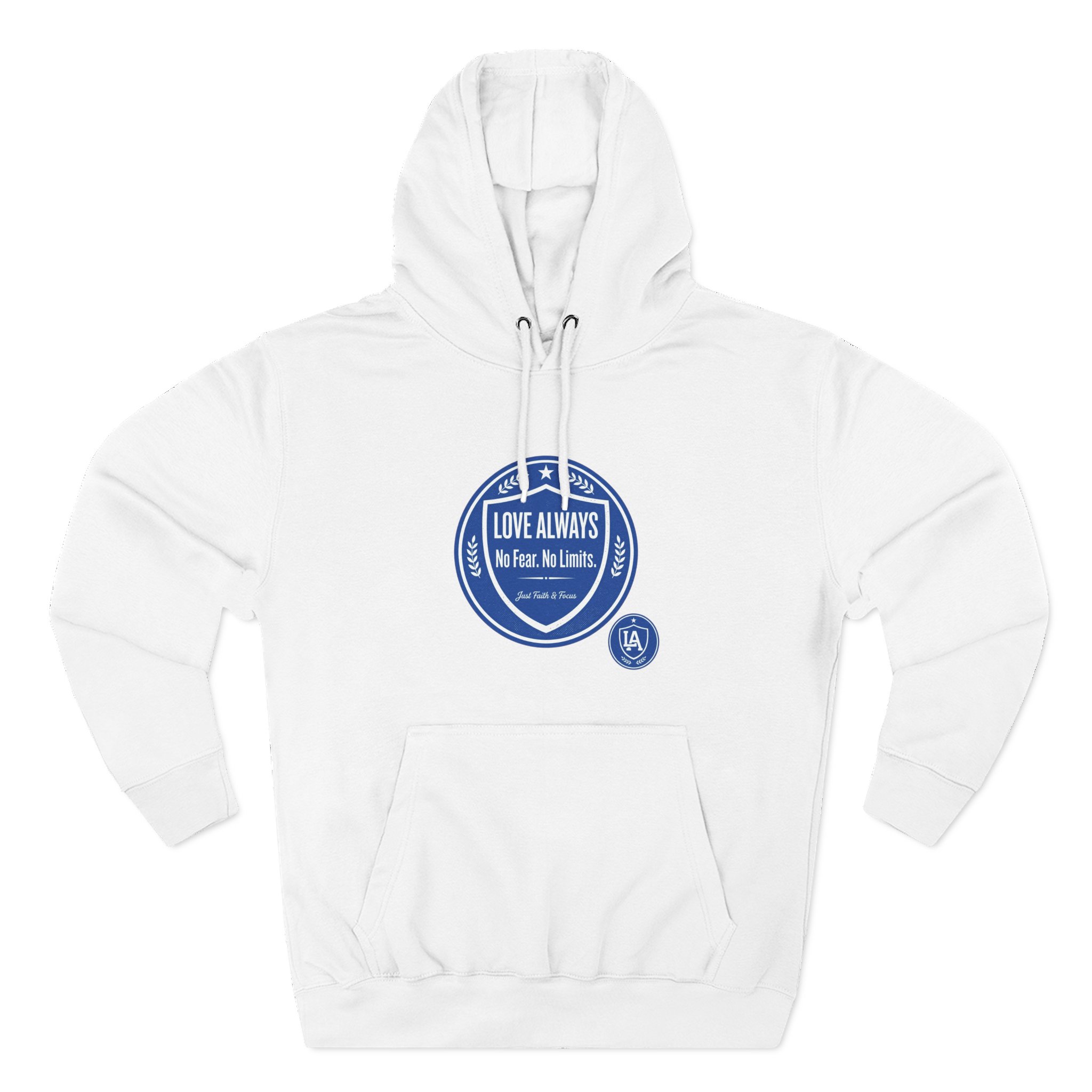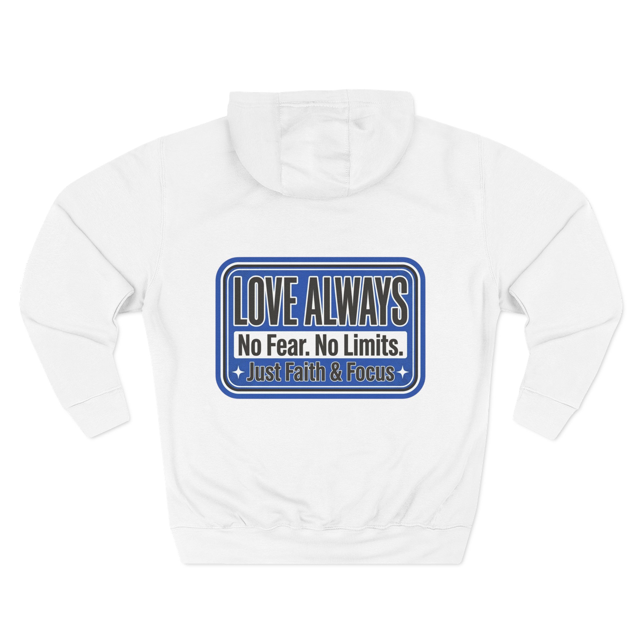 This midweight fleece hoodie brings calm confidence to everyday wear. The clean white canvas highlights bold blue badges that read “LOVE ALWAYS — No Fear. No Limits. Just Faith & Focus,” so your values feel visible but not loud. The roomy kangaroo pocket and adjustable hood invite slow mornings, road-trip playlists, and conversations that matter. Built with soft combed cotton and recycled fibers, it wears like something passed down: broken in, comfortable, and ready for whatever day asks of you.