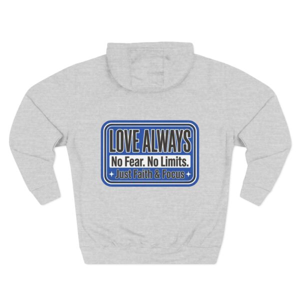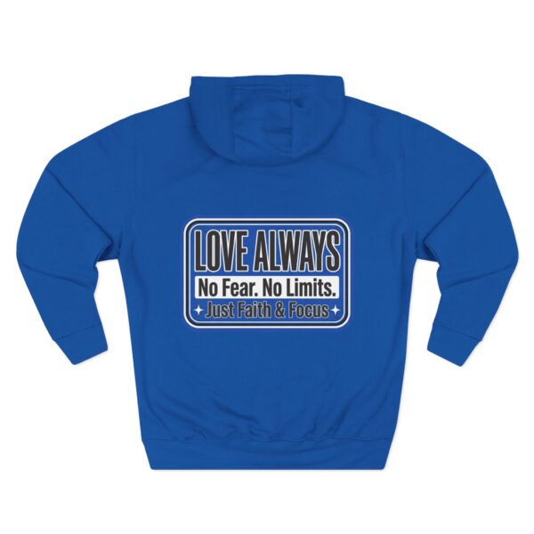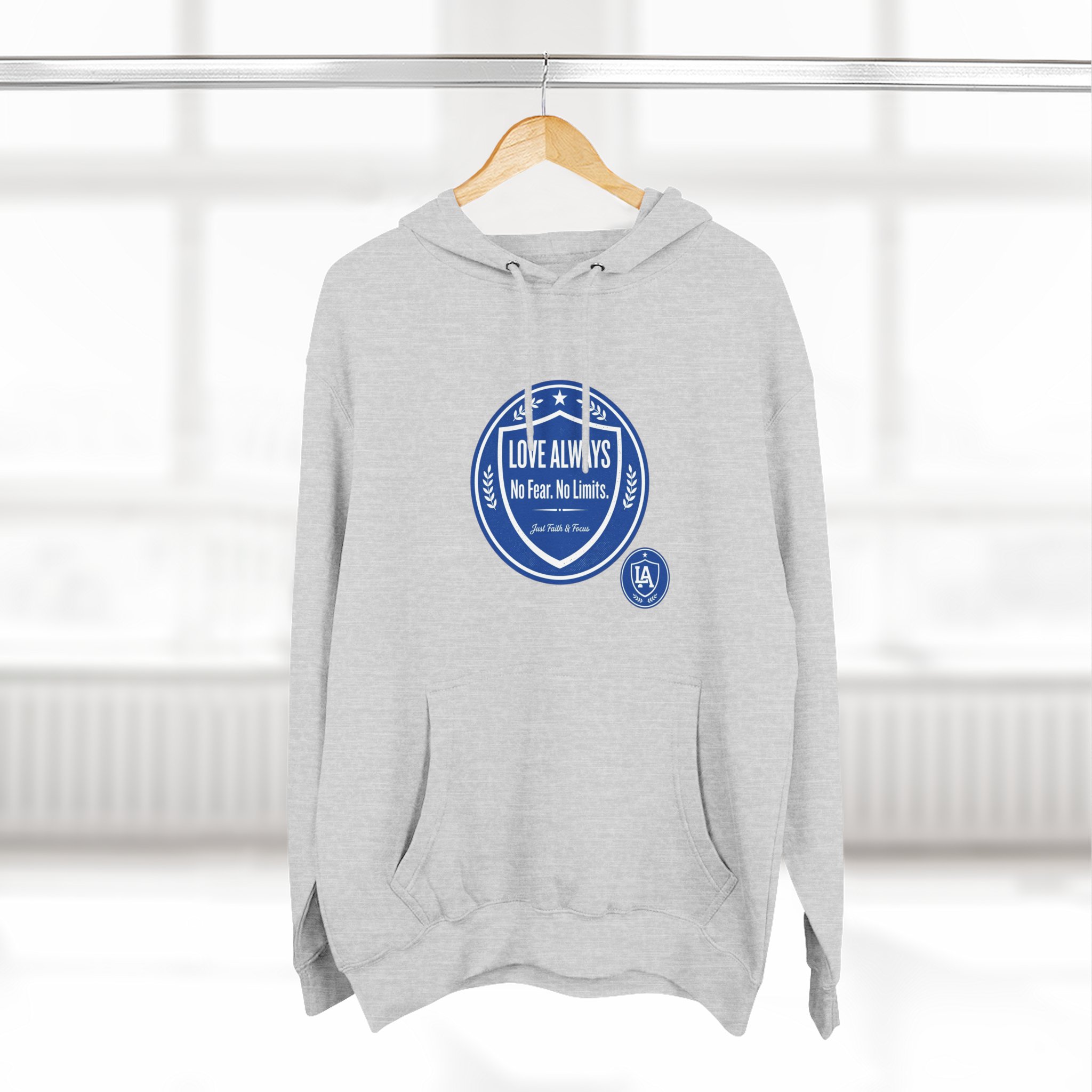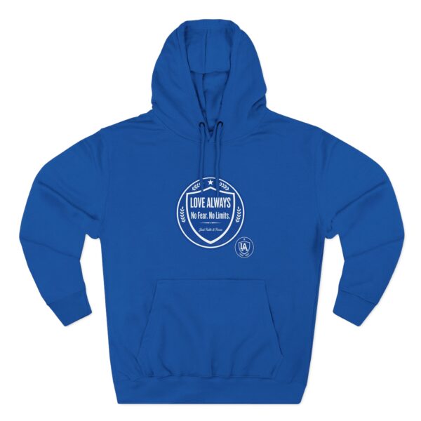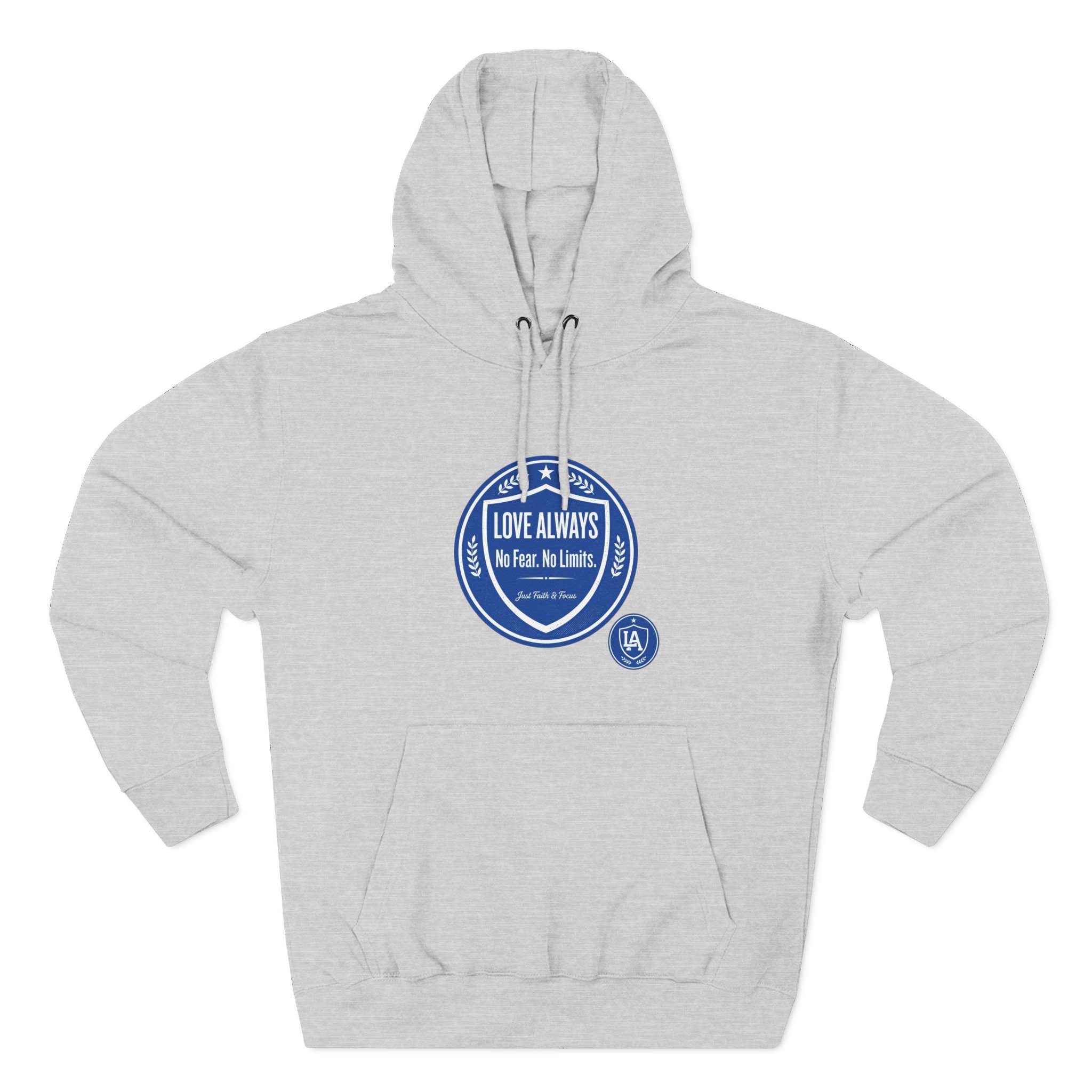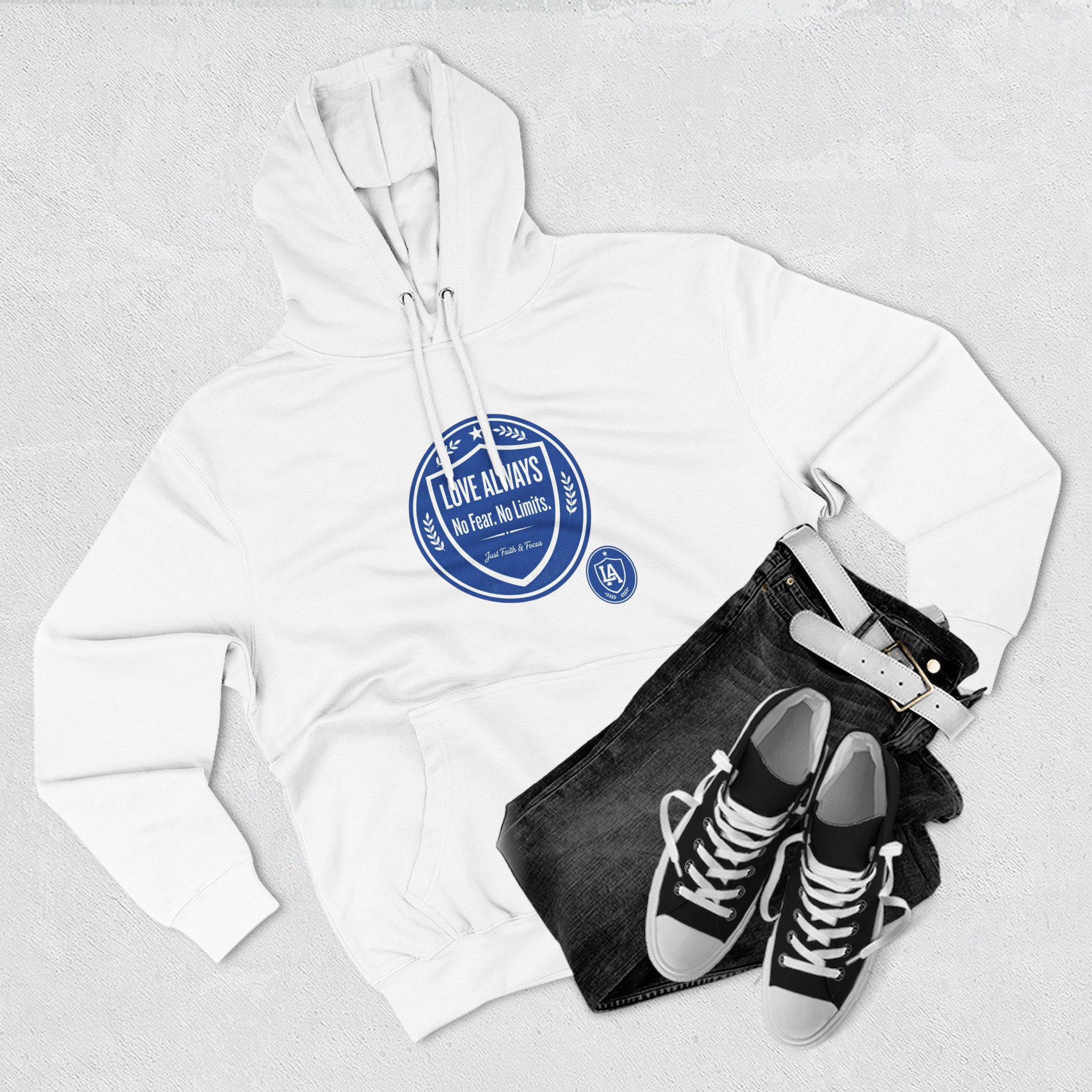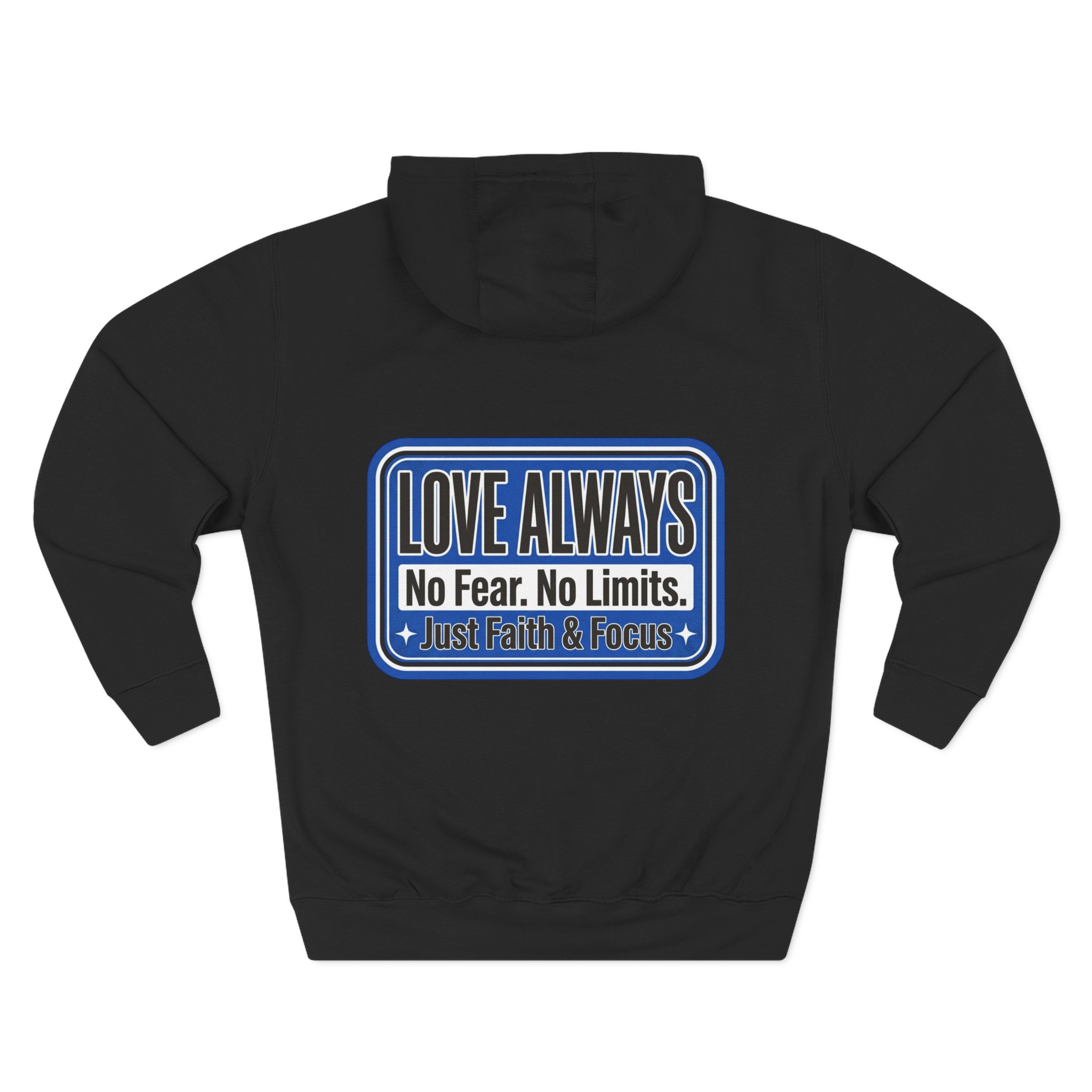 This midweight fleece hoodie brings calm confidence to everyday wear. The clean white canvas highlights bold blue badges that read “LOVE ALWAYS — No Fear. No Limits. Just Faith & Focus,” so your values feel visible but not loud. The roomy kangaroo pocket and adjustable hood invite slow mornings, road-trip playlists, and conversations that matter. Built with soft combed cotton and recycled fibers, it wears like something passed down: broken in, comfortable, and ready for whatever day asks of you.