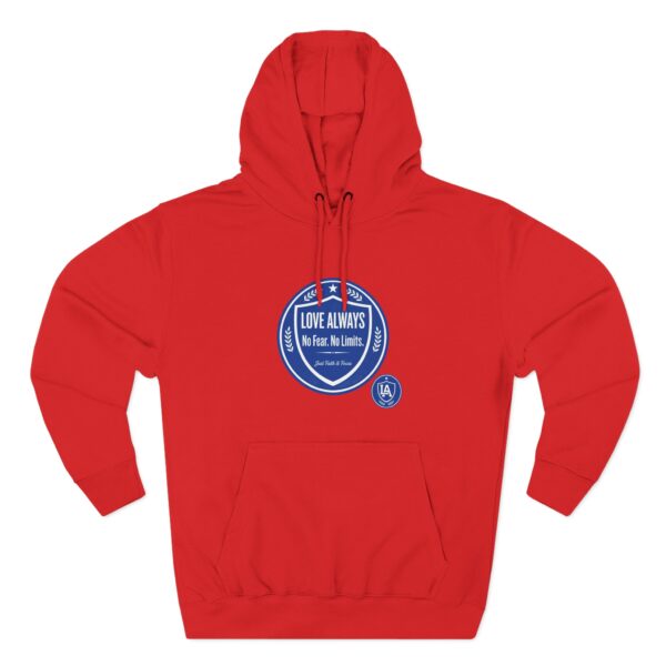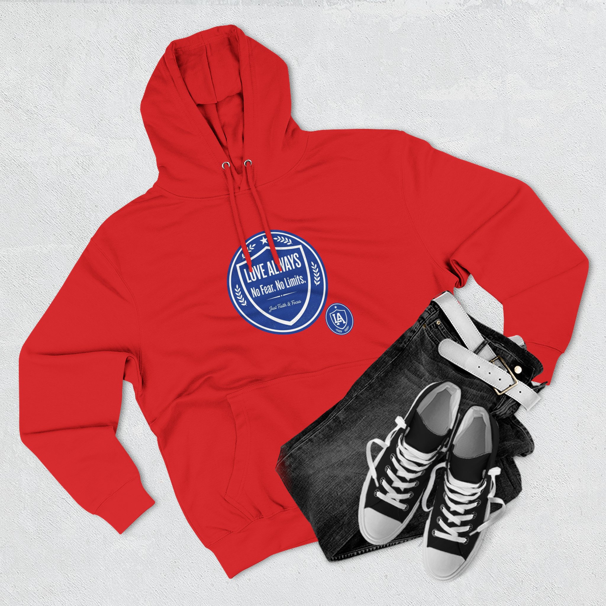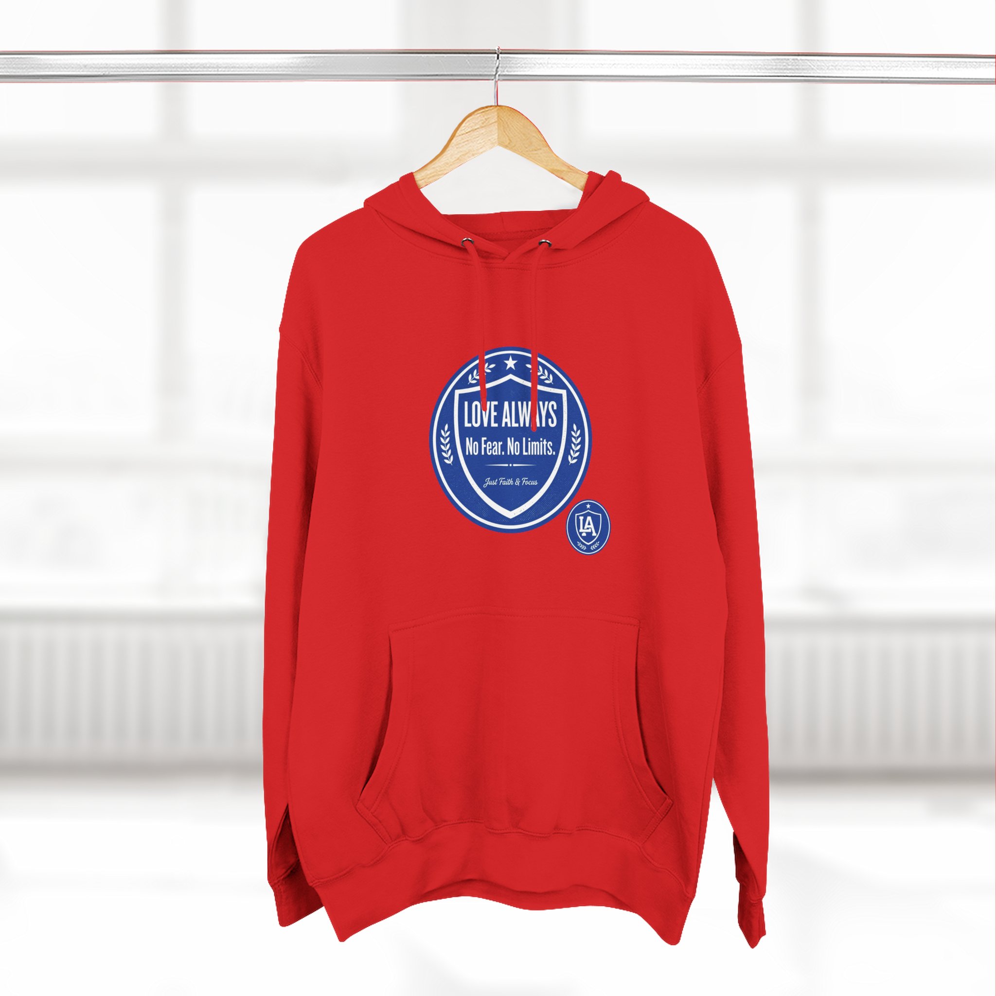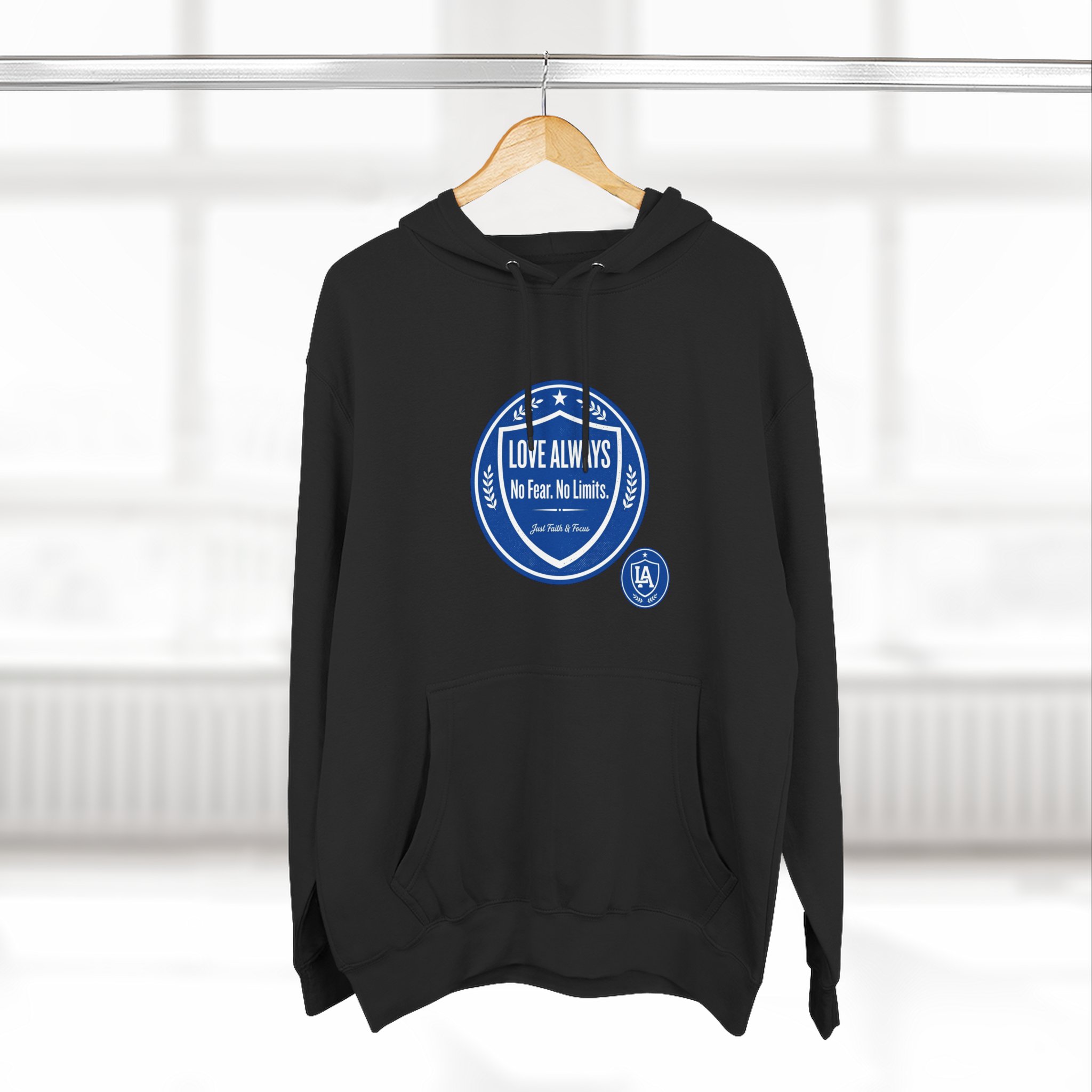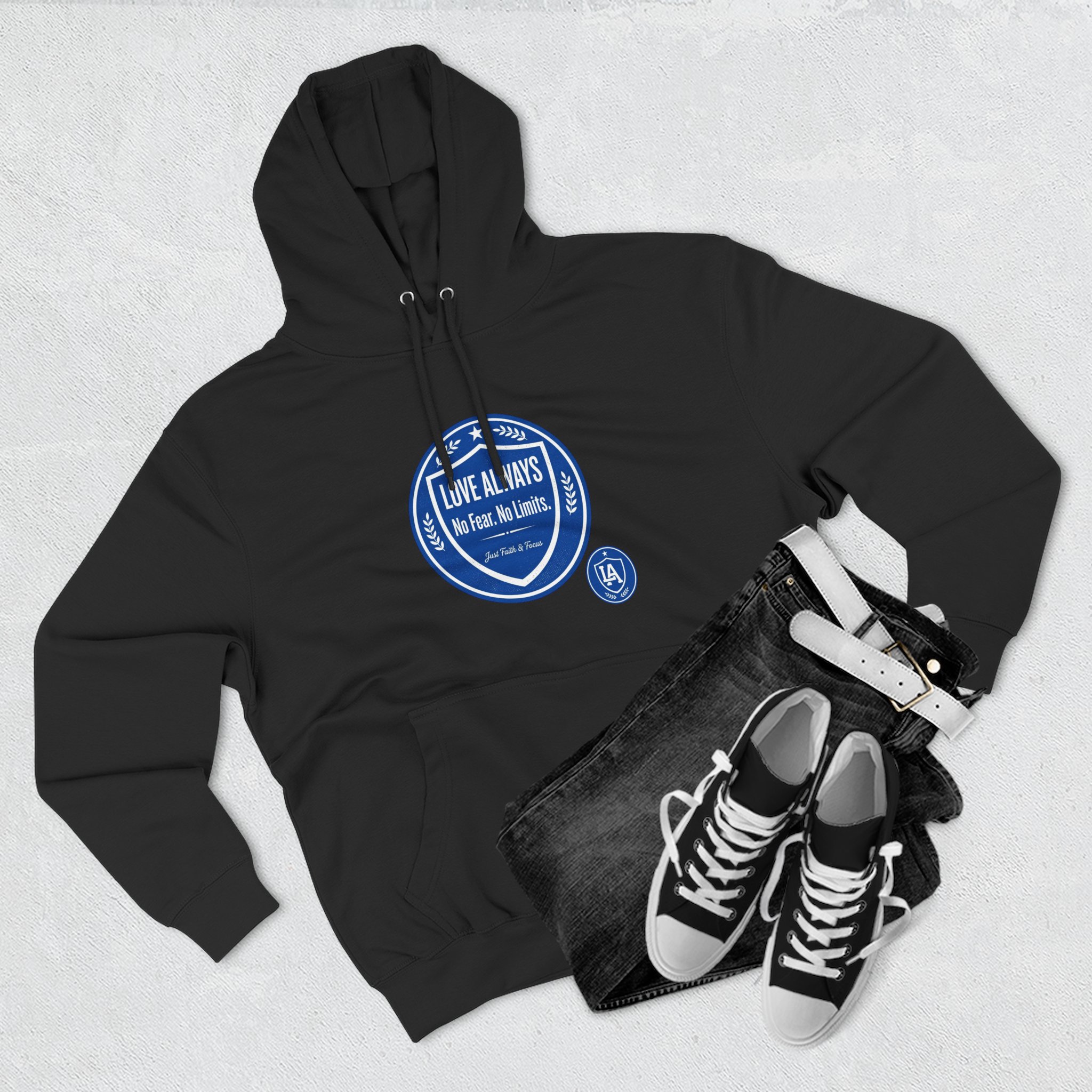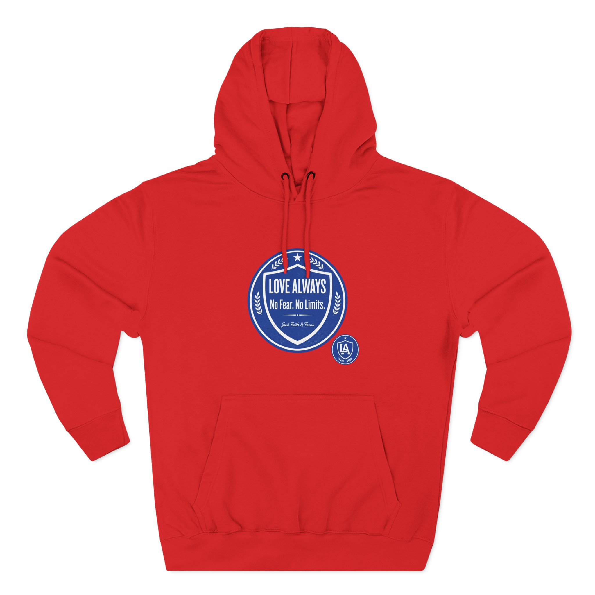 This midweight fleece hoodie brings calm confidence to everyday wear. The clean white canvas highlights bold blue badges that read “LOVE ALWAYS — No Fear. No Limits. Just Faith & Focus,” so your values feel visible but not loud. The roomy kangaroo pocket and adjustable hood invite slow mornings, road-trip playlists, and conversations that matter. Built with soft combed cotton and recycled fibers, it wears like something passed down: broken in, comfortable, and ready for whatever day asks of you.