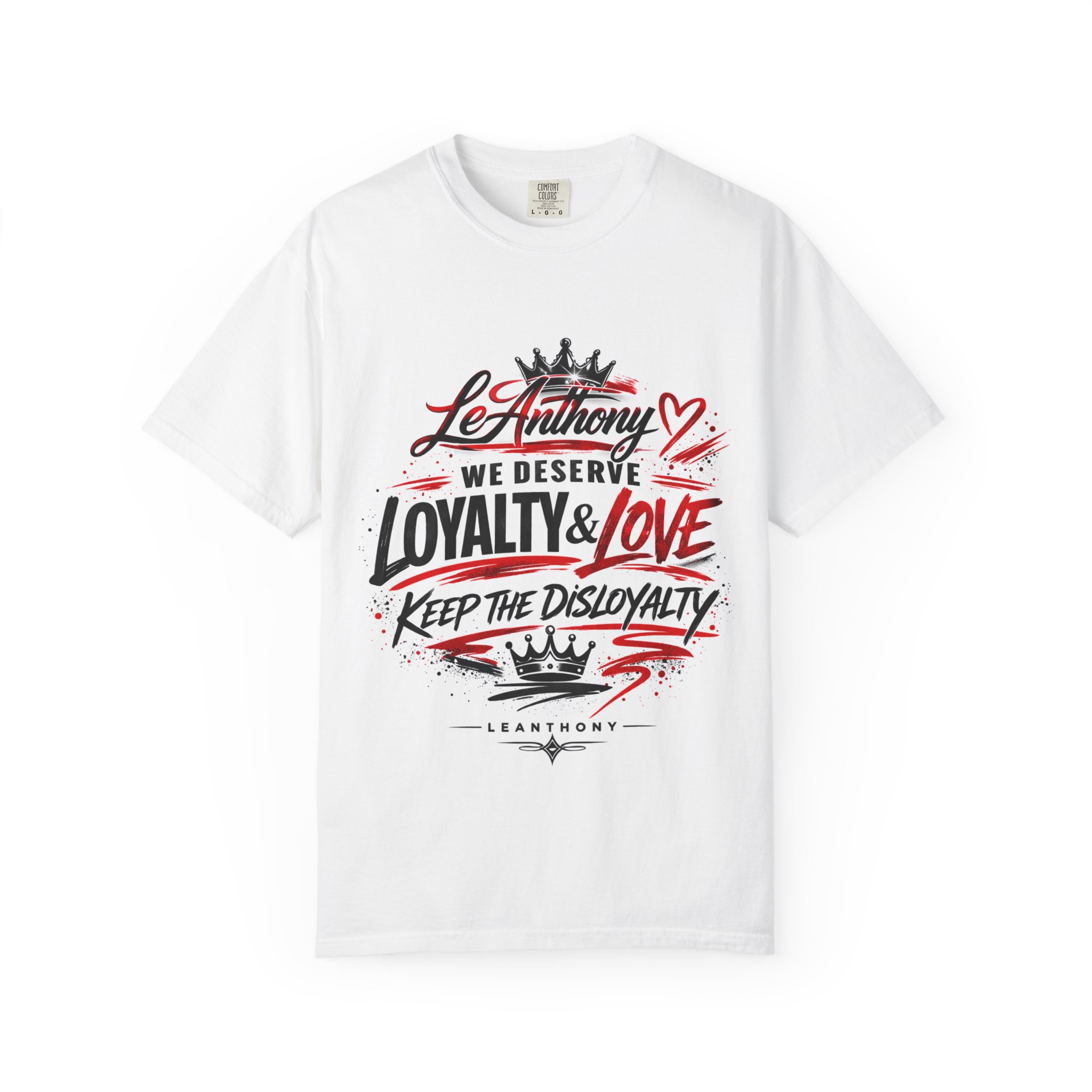This relaxed-fit cotton tee carries a bold, streetwise message — a graphic blend of hand-lettering, crown motifs, and energetic red-and-black accents that read “We deserve loyalty & love / Keep the disloyalty.” The heavyweight, garment-dyed fabric drapes softly and wears in over time, giving the shirt lived-in character. Sized S–4XL with sturdy double-needle seams and a tubular knit construction, it’s built to last and stay comfortable through everyday wear. Wear it to speak your values without saying a word — casual, confident, and made to move with you.