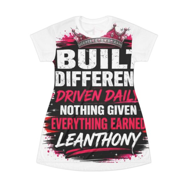 This dress-shaped tee blends motivation and street-style energy into a lightweight, wearable statement. The bold front graphic—heavy typography, paint-splatter accents, and a crown motif—reads like a personal creed: built different, driven daily, everything earned. Cut in a relaxed A-line silhouette, the soft-feel polyester keeps lines smooth and holds vibrant all-over prints. Slip it on after a workout, wear it to a casual meet-up, or layer under a denim jacket for a charged, confident look that speaks ambition without shouting it.