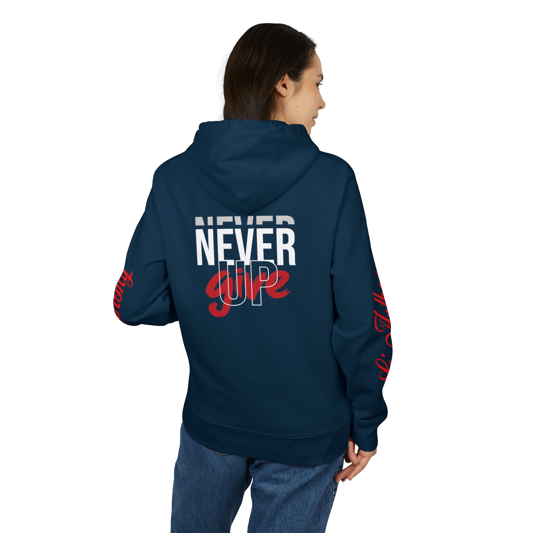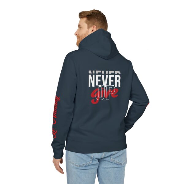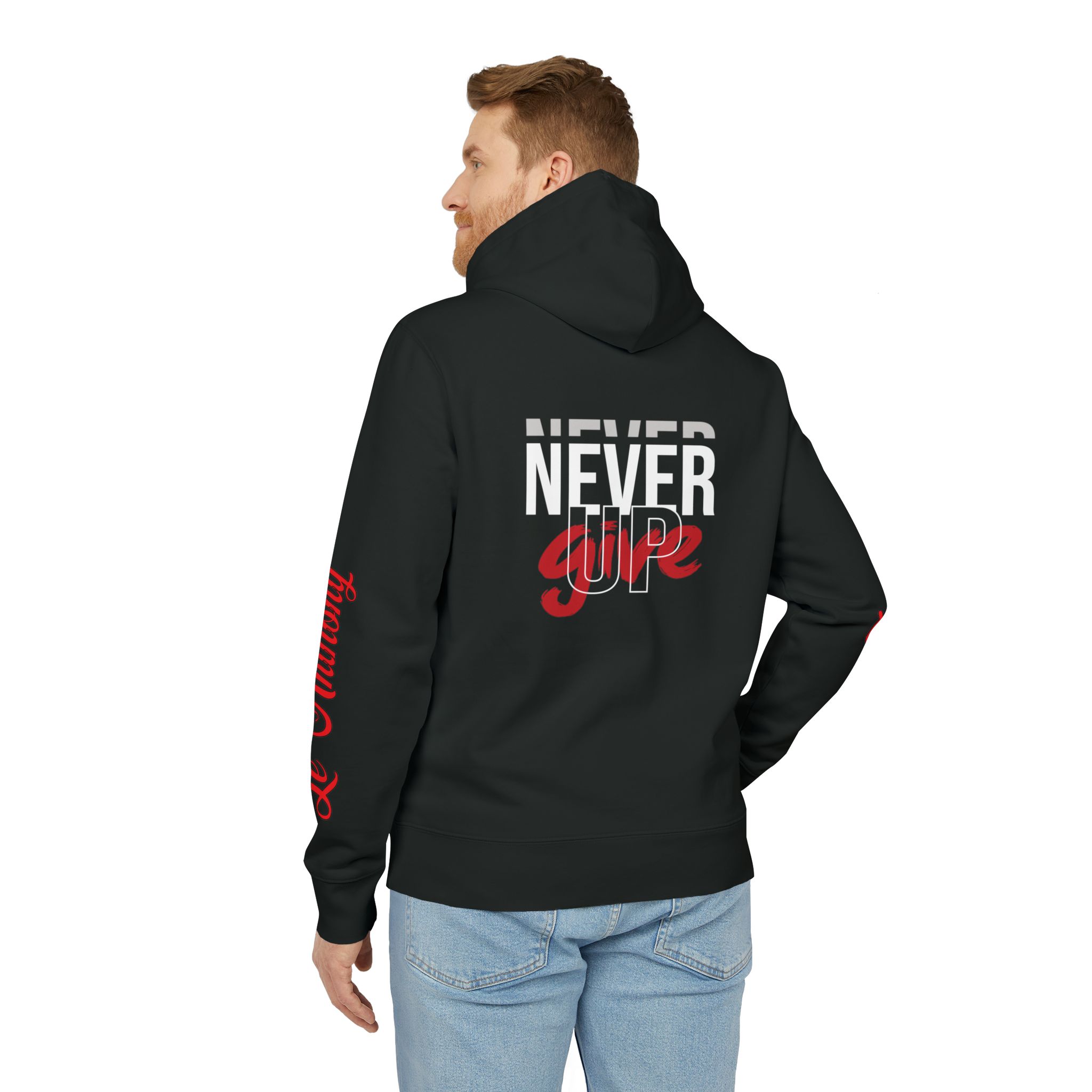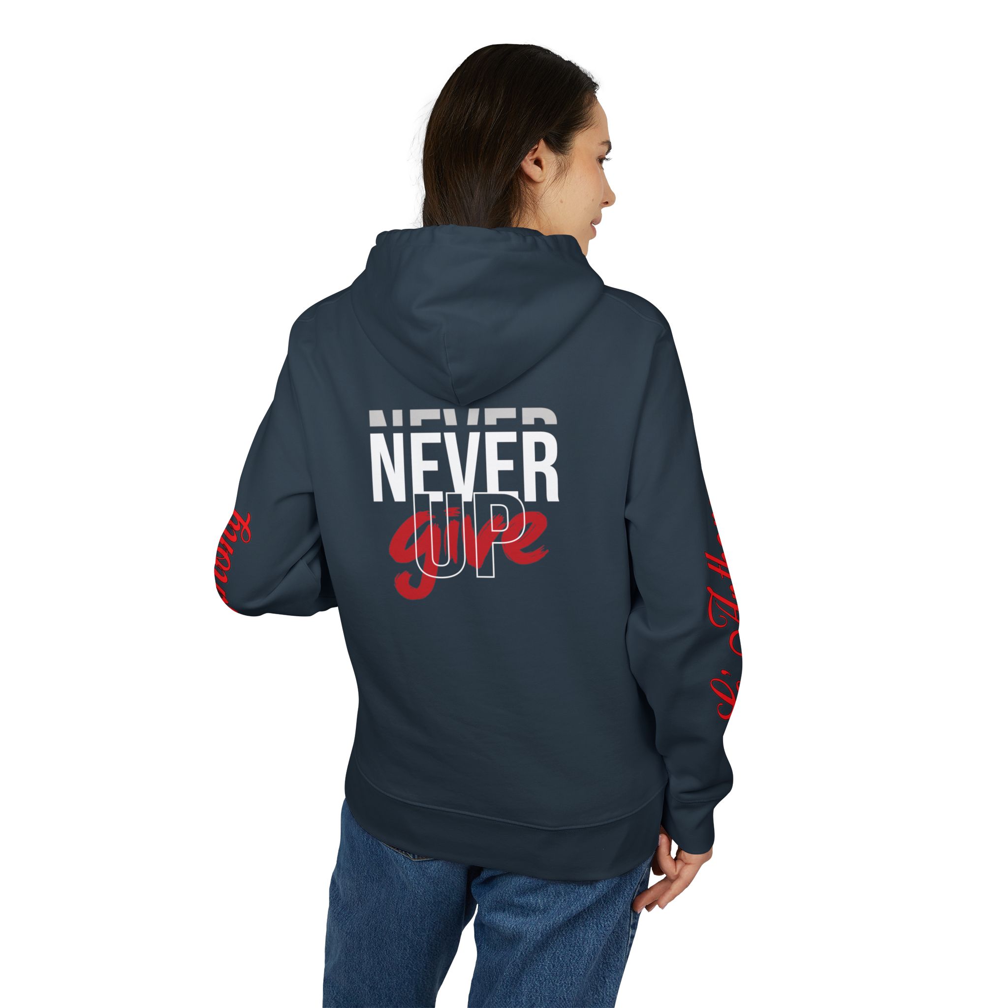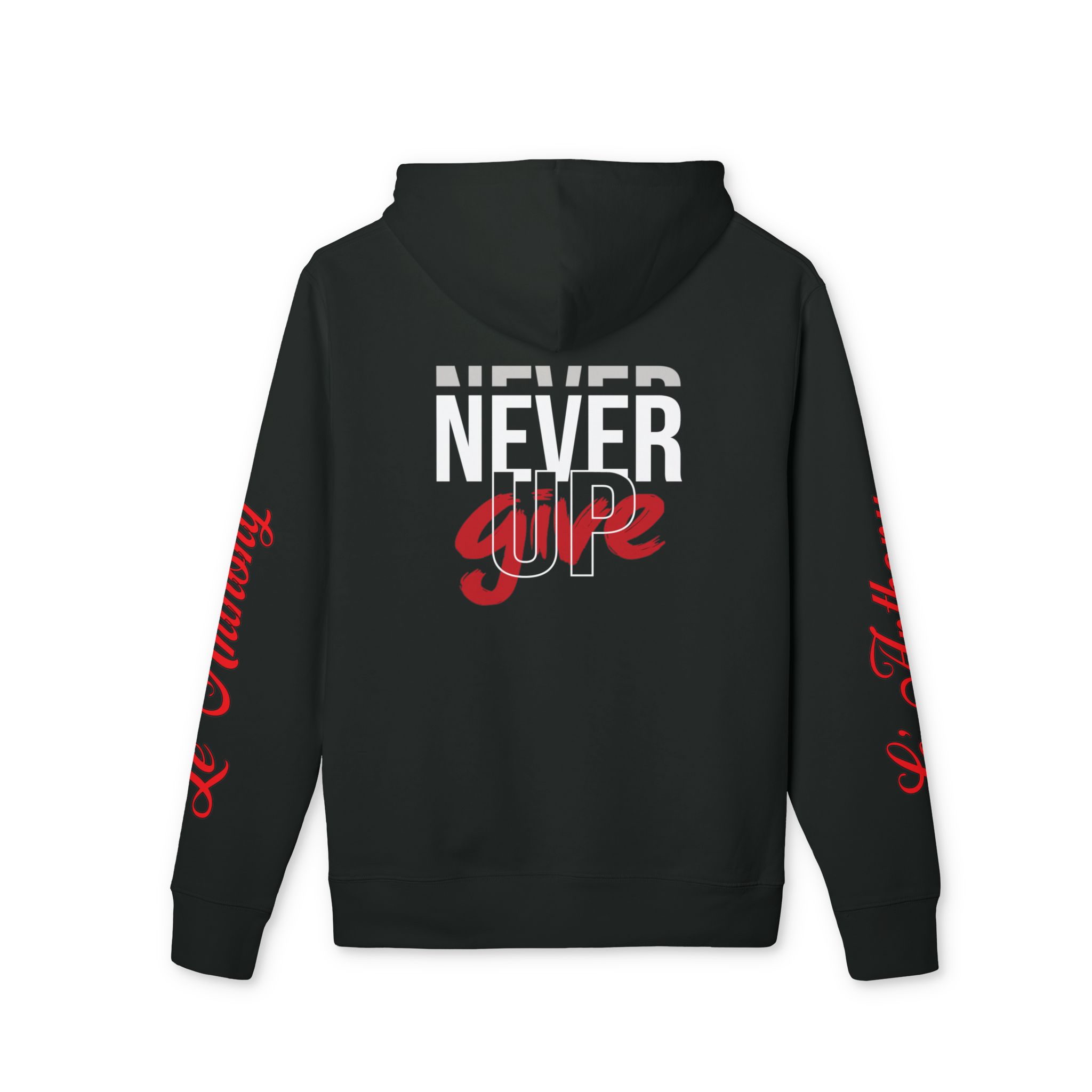This hoodie carries a quiet, steady conviction — not loud, but relentless. Worn by someone who pushes through long shifts, late-night projects, or early morning runs, it becomes part of their rhythm. The thick, brushed organic cotton settles in like a second layer of resilience. Pockets hold a phone, keys, or a folded note; the reinforced neck and metal-tipped drawcords keep it feeling reliable wash after wash. “Never Give Up” reads like a mantra, a soft, constant nudge when energy is low and resolve matters most. Slip it on for evening walks, travel days, or when you need a wearable reminder to keep moving forward.