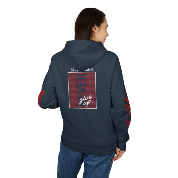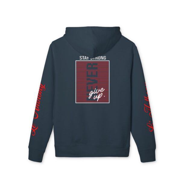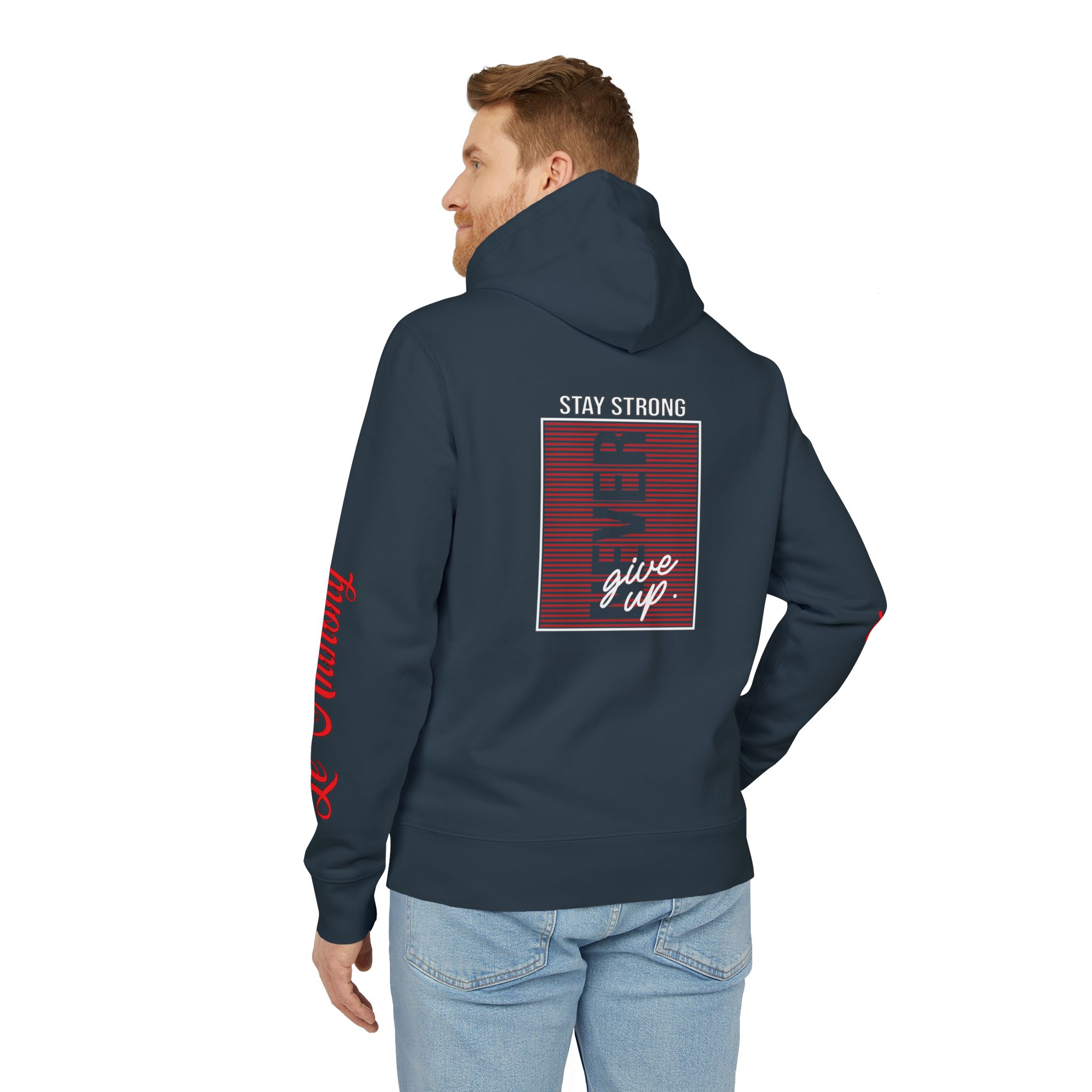 This hoodie carries a quiet, steady confidence — a wearable reminder to keep pushing forward. Soft, heavy-weight cotton drapes comfortably while the bold “Never Give Up Stay Strong” message sits close to the chest, like a small pep-talk you can pull on before a long day. It’s the kind of layer you reach for when you need focus: errands that demand patience, late-night study sessions, slow morning coffee walks, or the recovery days after a hard workout. The substantial fabric and clean construction give it a lived-in, dependable feel that ages gracefully. Details like matching round drawcords, metal eyelets, and a neat half-moon at the back neck make the piece feel intentional — functional without shouting. Slip it on and you’ve got warmth, durability, and a bit of quiet encouragement that fits into whatever challenge you’re facing.