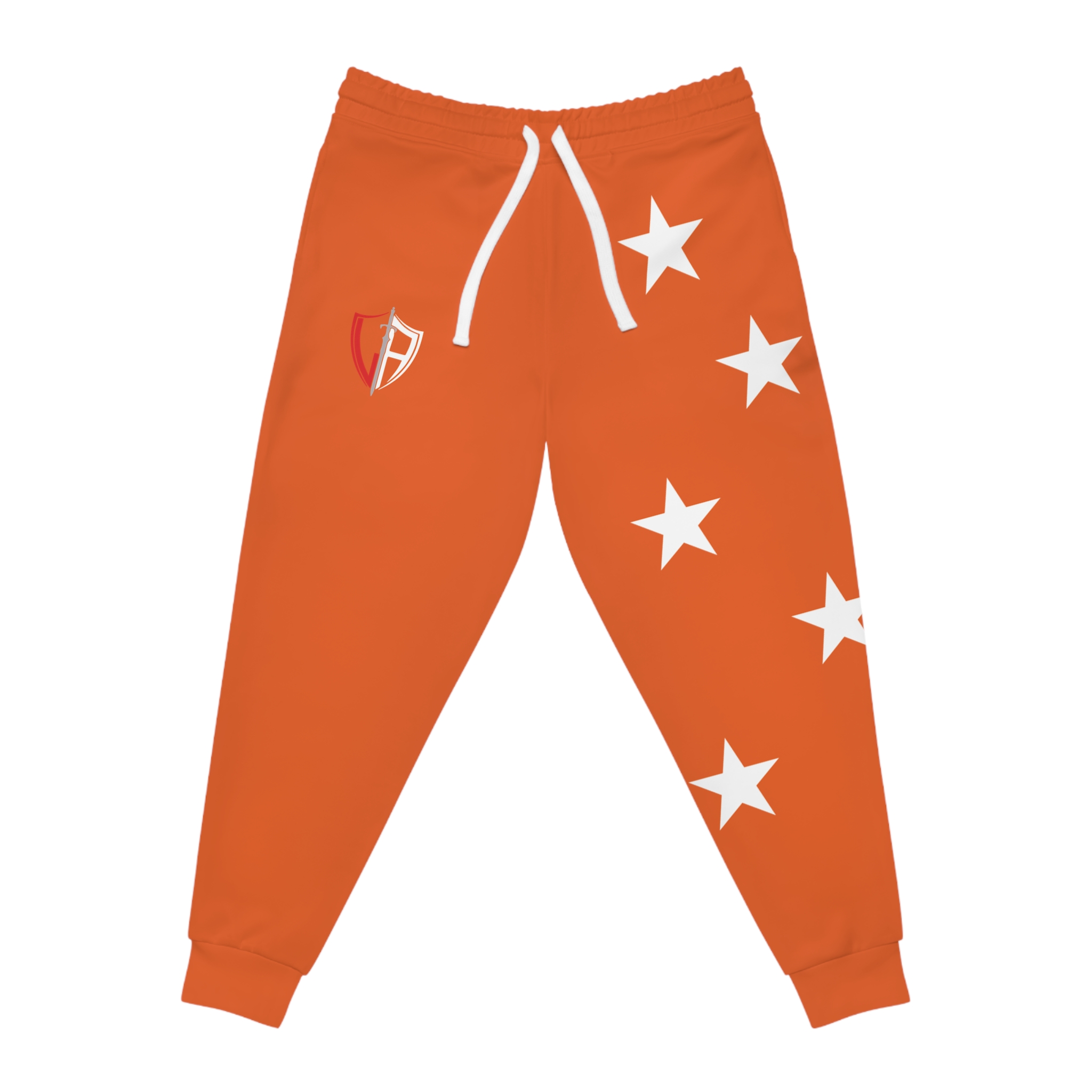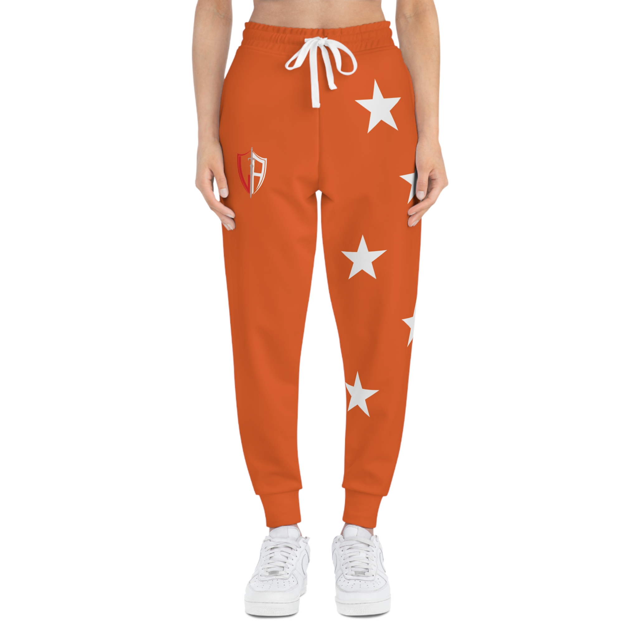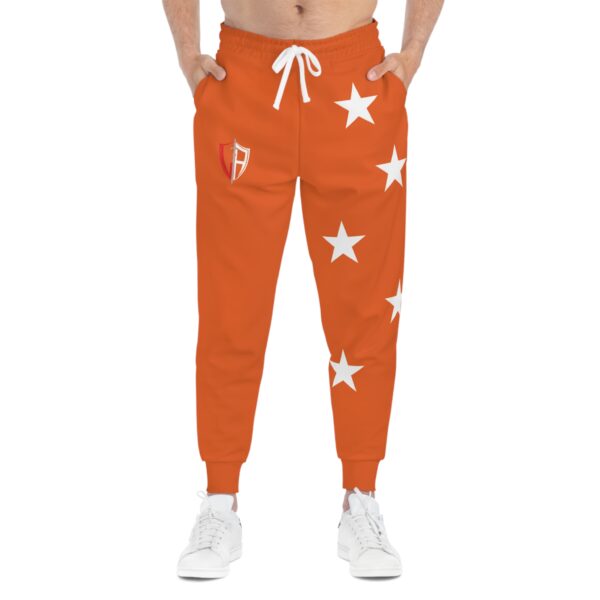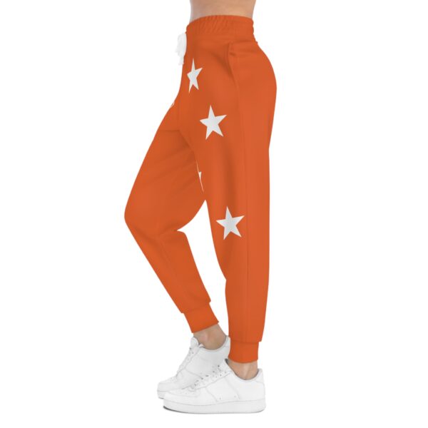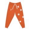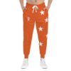 Bold, comfortable joggers that bring team-spirit energy to everyday wear. These athletic joggers wear a saturated orange all over, accented with white stars cascading down one leg and a small shield emblem at the hip. The midweight knit feels soft against skin and moves with you — from morning warm-ups to relaxed afternoons. Deep double-layer pockets keep your essentials close. The elastic drawstring waist lets you dial in a secure fit while ribbed cuffs hold the silhouette at the ankle. They look like sportswear but live in the city, the gym, and weekend rituals alike — a confident, active piece that layers easily and keeps a bright, spirited tone to your outfit.
