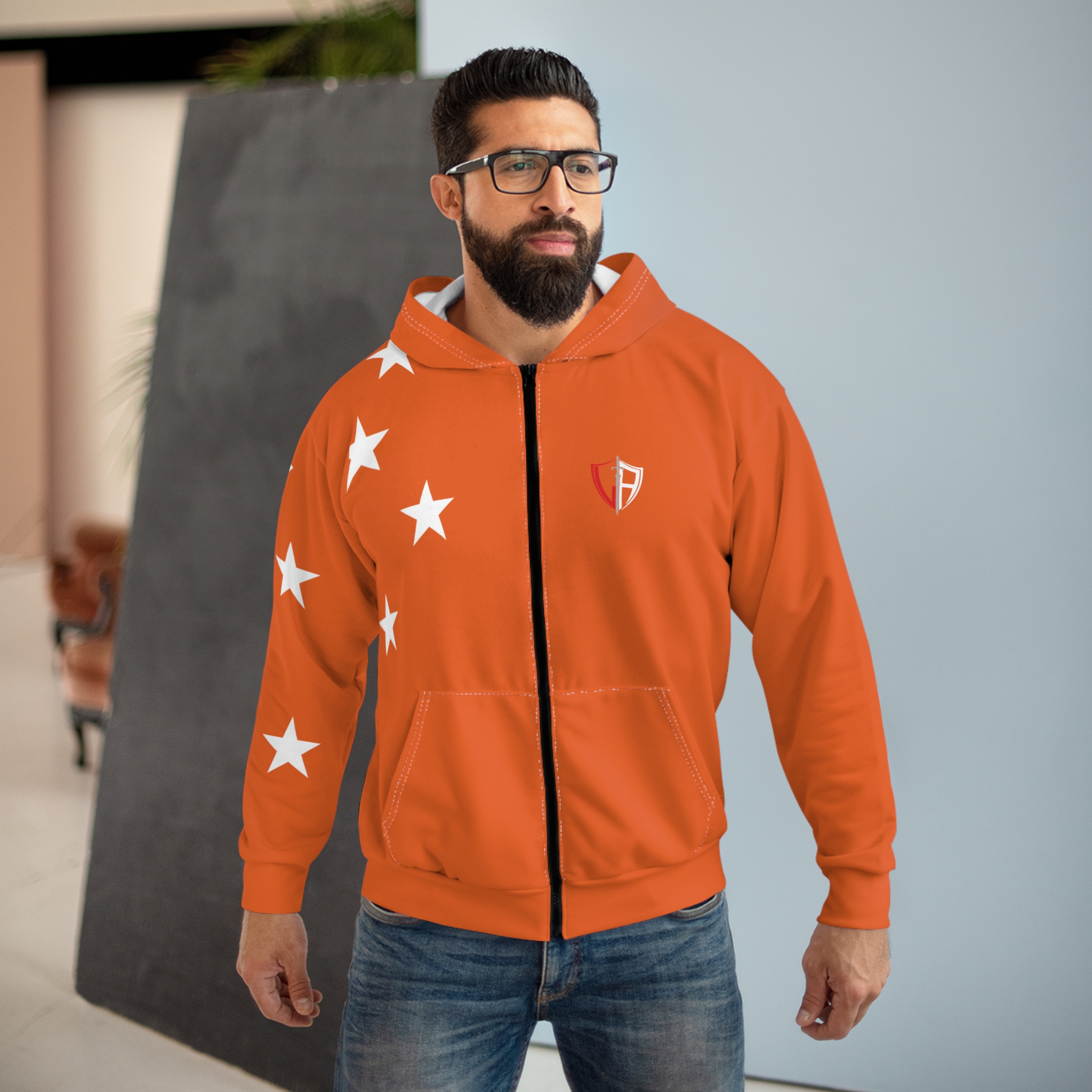 Be the first to review “Orange Star Zip Hoodie — All-Over Print Casual Zip-Up”