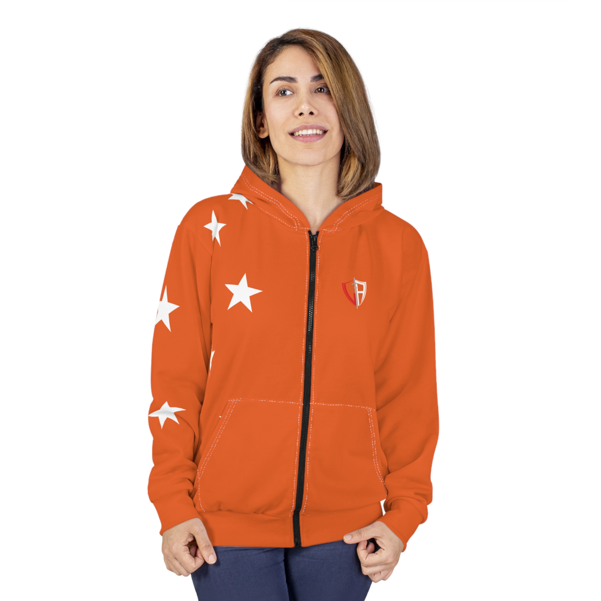 This vibrant zip-up hoodie brings bold, all-over color to everyday wear. The warm orange canvas is accented with scattered white stars on the sleeve and chest, plus a small shield emblem that hints at a playful, sporty spirit. Medium-weight polyester holds the shape and color wash after wash while custom cut-and-sewn construction keeps the print aligned across seams. The roomy front pockets and full zipper add practical comfort — reach-in warmth for chilly commutes or quick layering between seasons. Wear it to stand out at late-night meetups, casual game nights, or relaxed weekend runs; it moves with you and keeps its brightness through frequent wear.