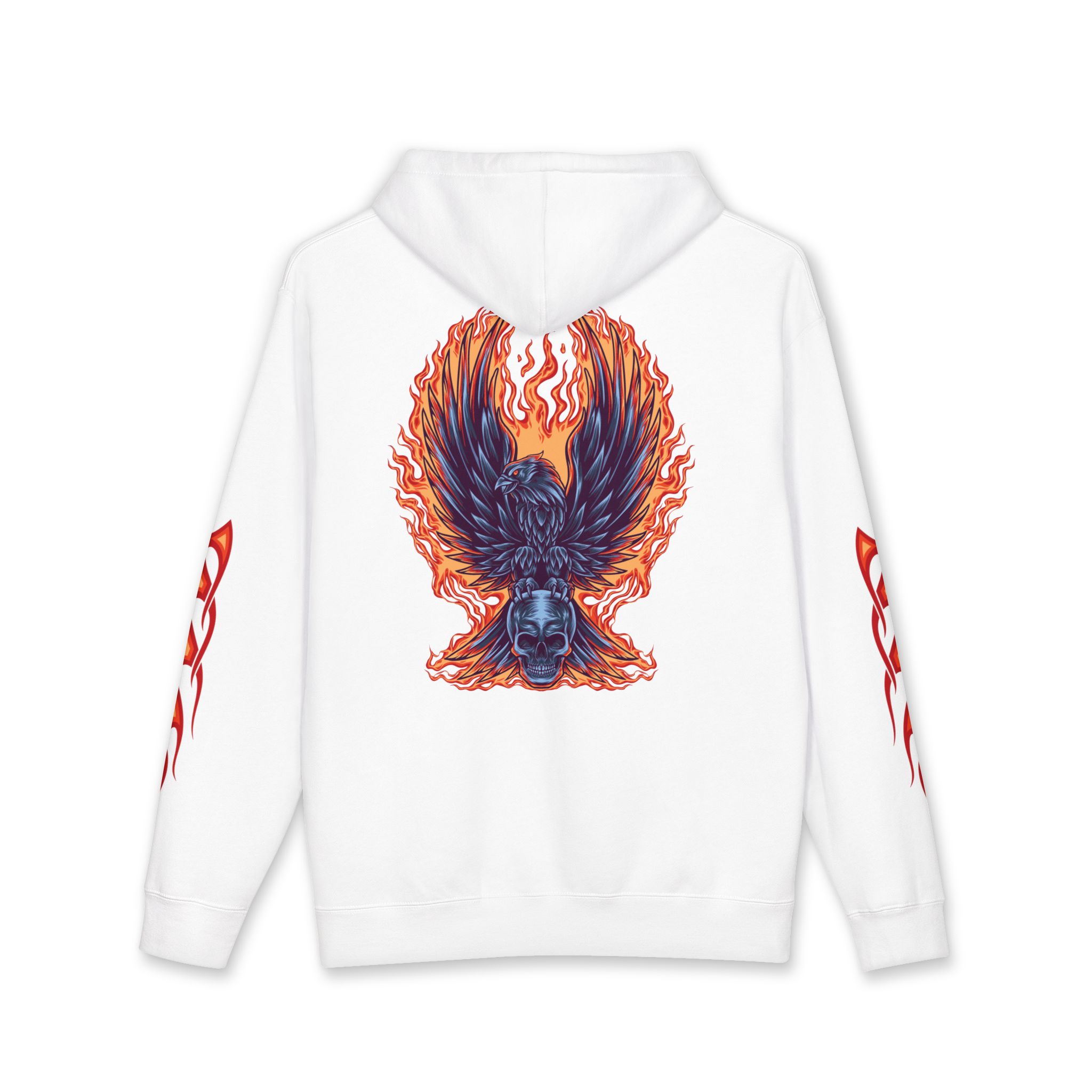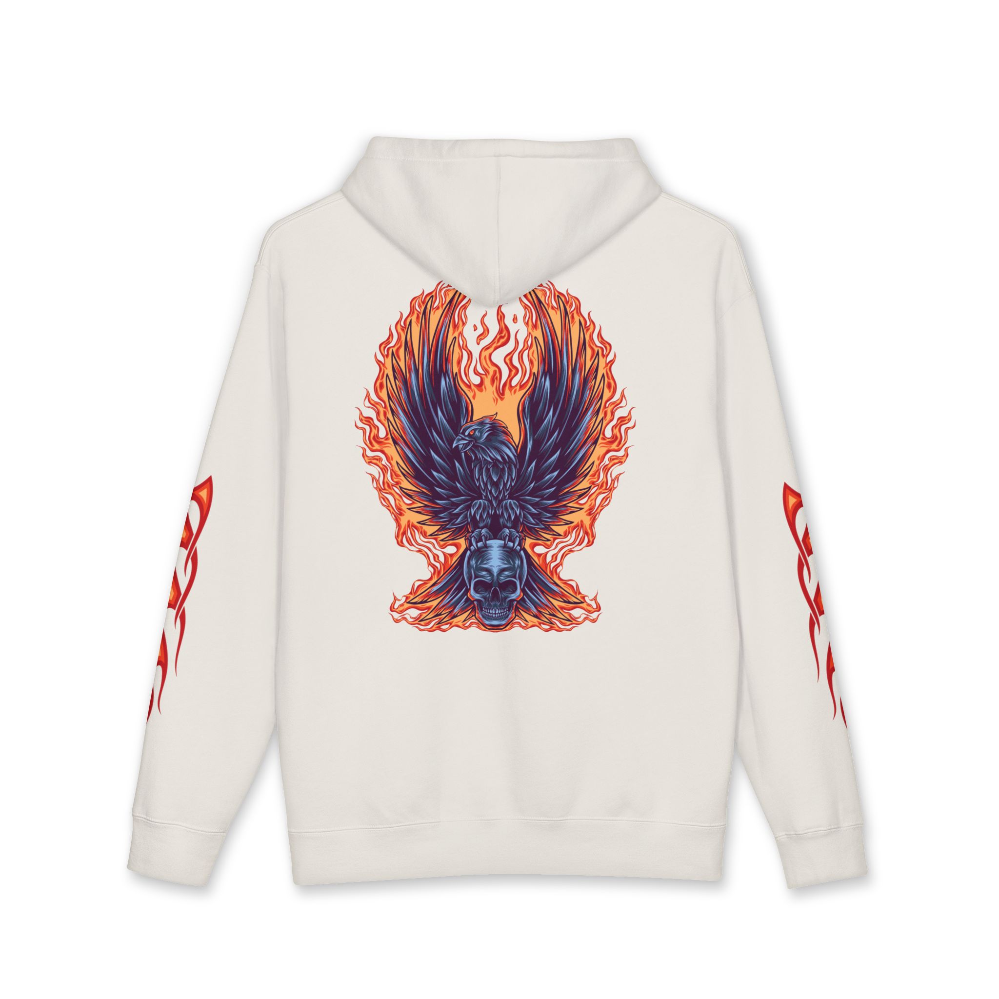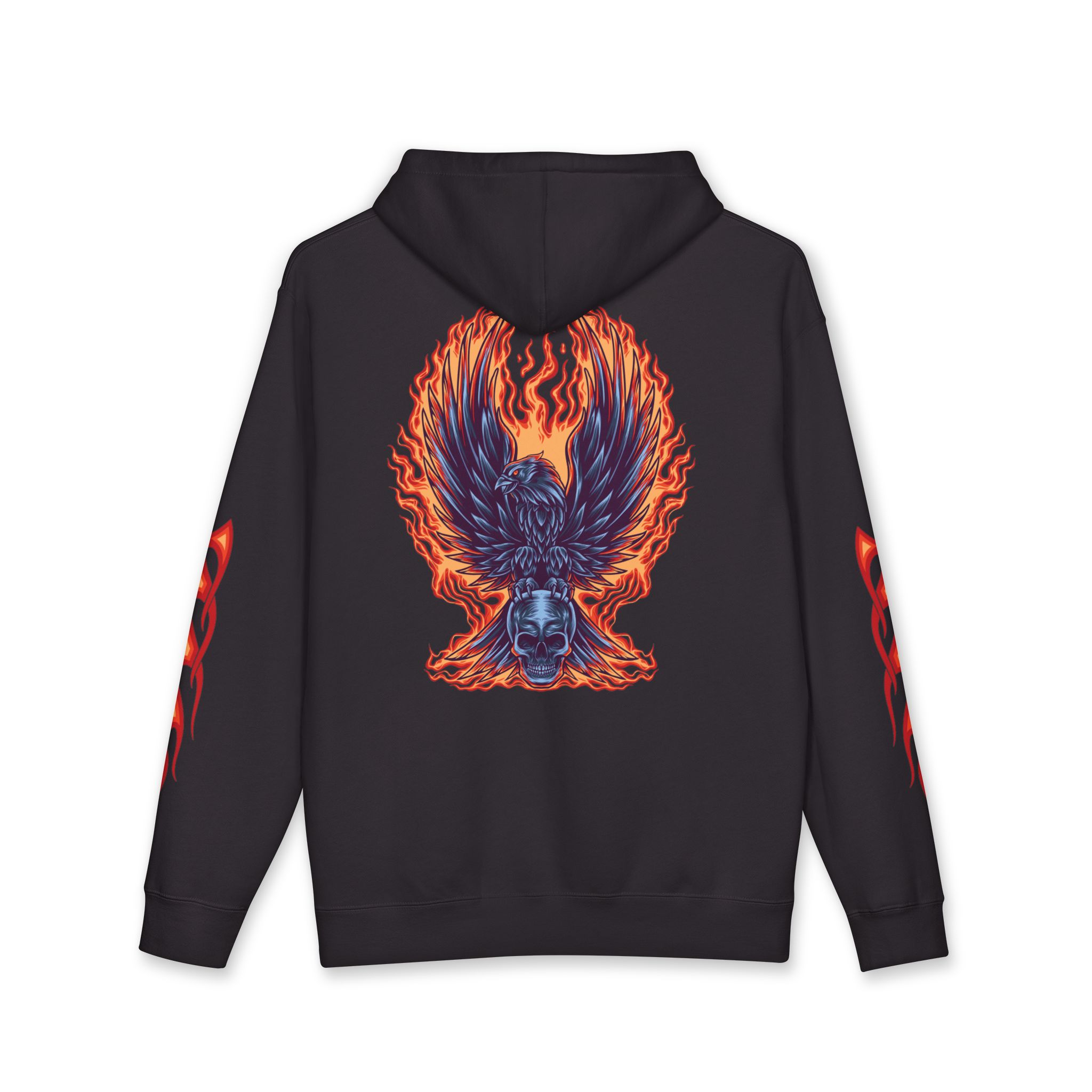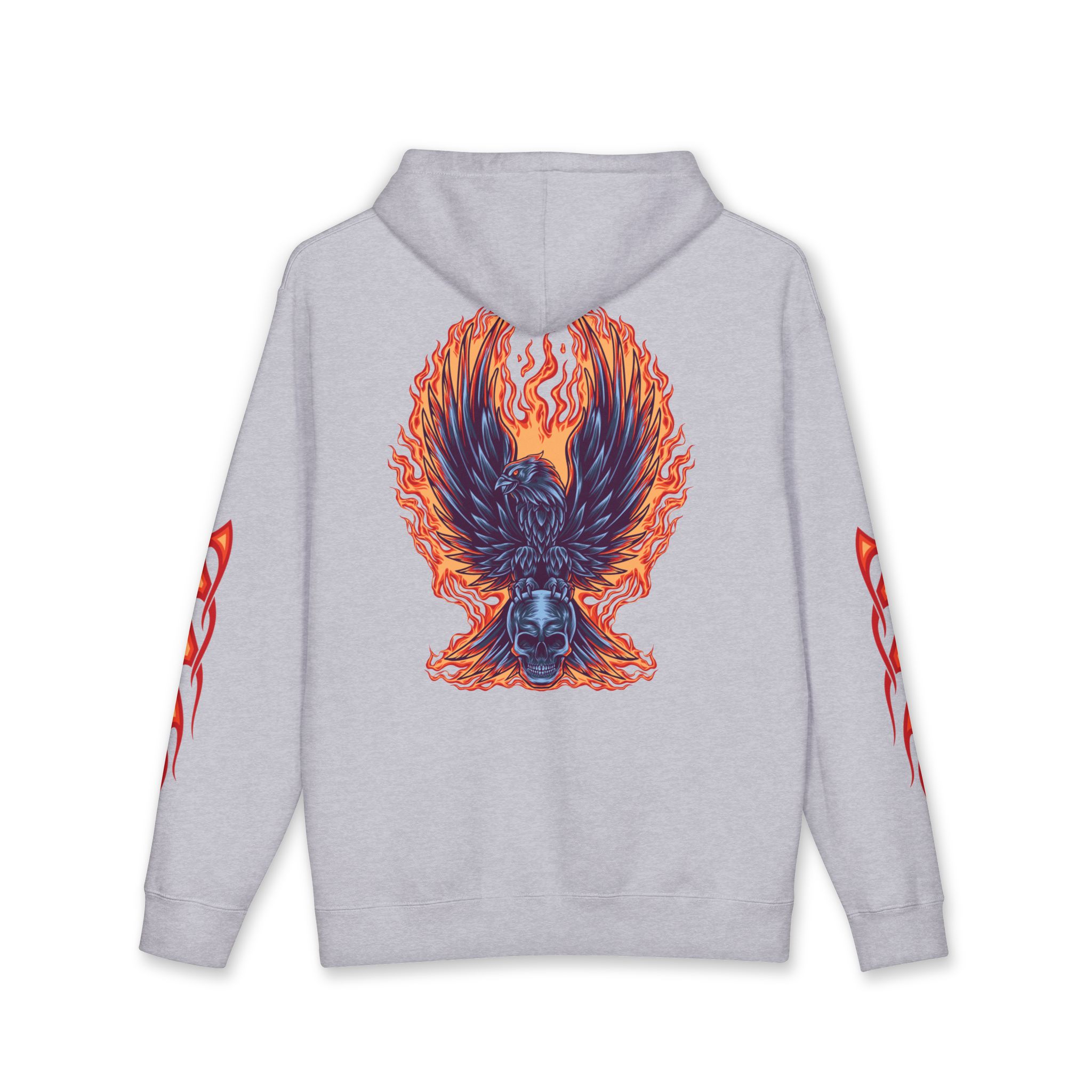 This heavyweight hoodie brings heat — literally and visually. The thick fleece-lined hood and sturdy 10 oz fabric wrap you in warmth, while flame motifs race down the sleeves and a dramatic phoenix-like crest blazes across the back. It feels like slipping into a warm, protective layer that still lets you show bold style. Wear it on cold nights at shows, on late rides, or when you want an edge while running errands. The relaxed fit lets you layer a tee or flannel underneath without losing shape. Small embroidered crest at the chest keeps the front clean so the back artwork can take center stage. Built with reinforced stitching and ribbed cuffs, it’s made to last through repeat wears and washes.
