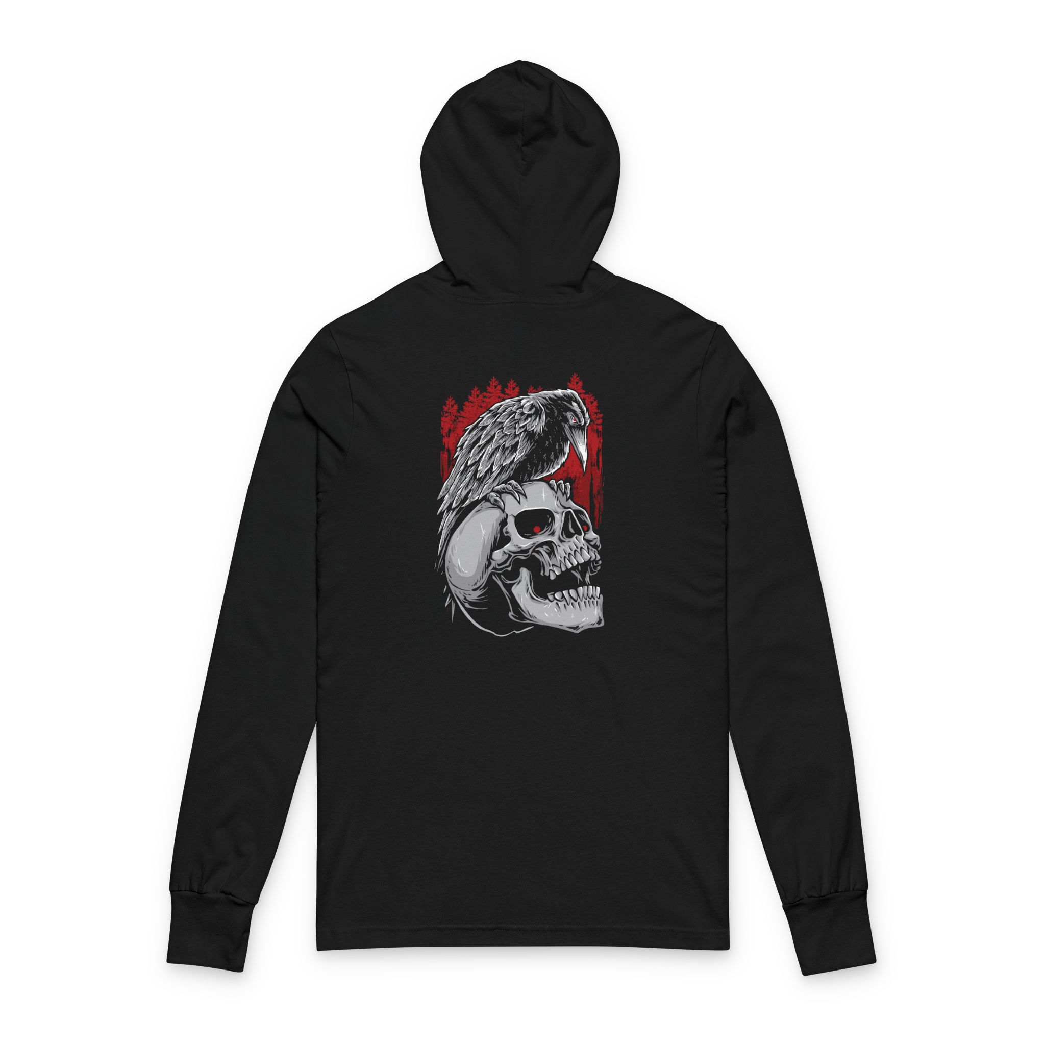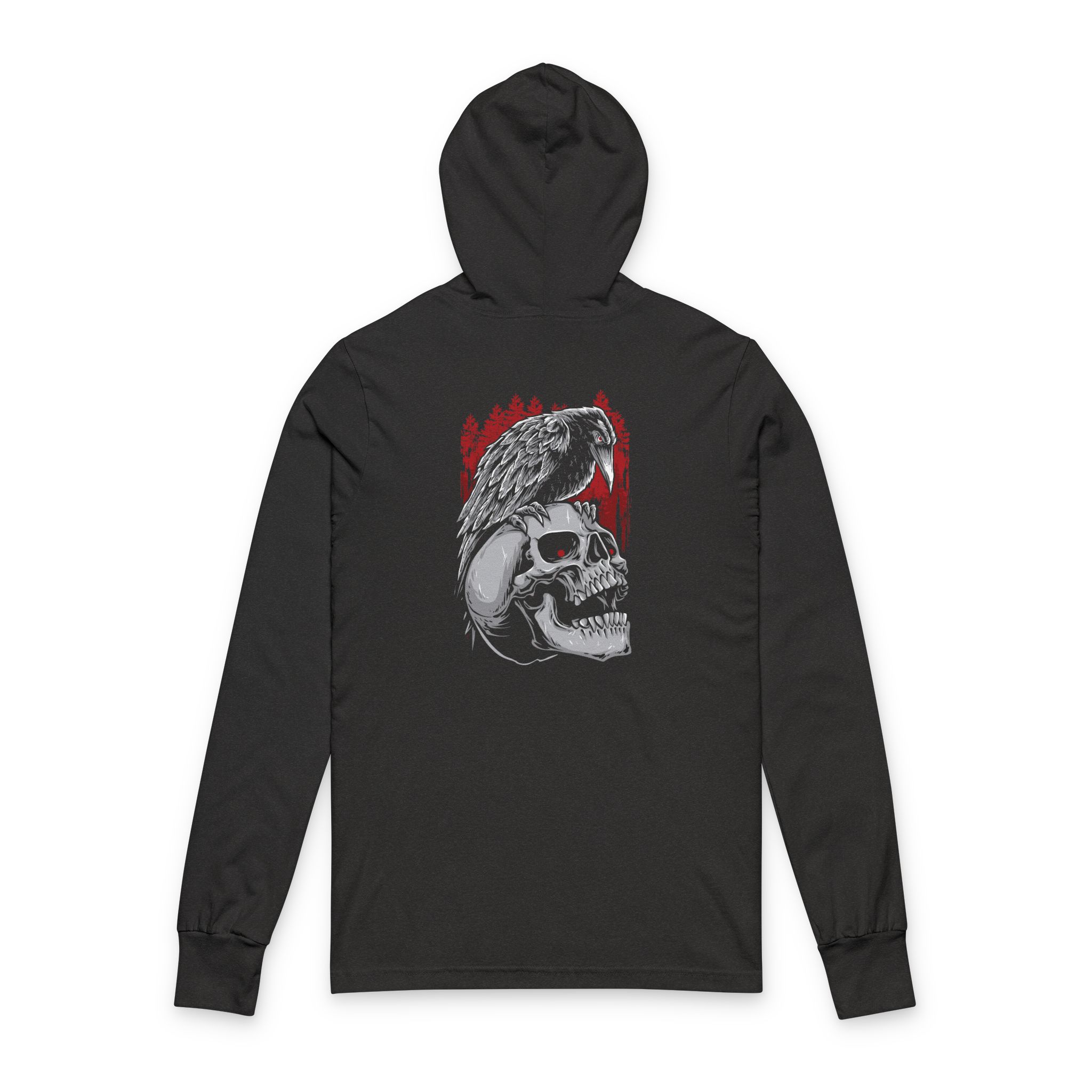 A slim, lived-in hooded long sleeve that wears like a favorite. Soft, lightweight cotton drapes close to the body while side seams keep the shape from stretching out. The front carries a small, subtle emblem; the back reveals a moody, detailed graphic — a skull cradled by a raven against a wash of deep red — that reads like a quiet statement. It’s made to move with you: easy to layer under a jacket or stand alone on cool evenings. Bring it on late-night walks, music runs, or evenings around a fire when you want clothing that feels personal and a little bit fierce.