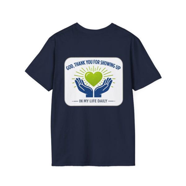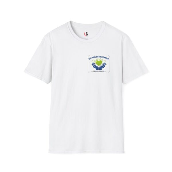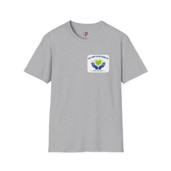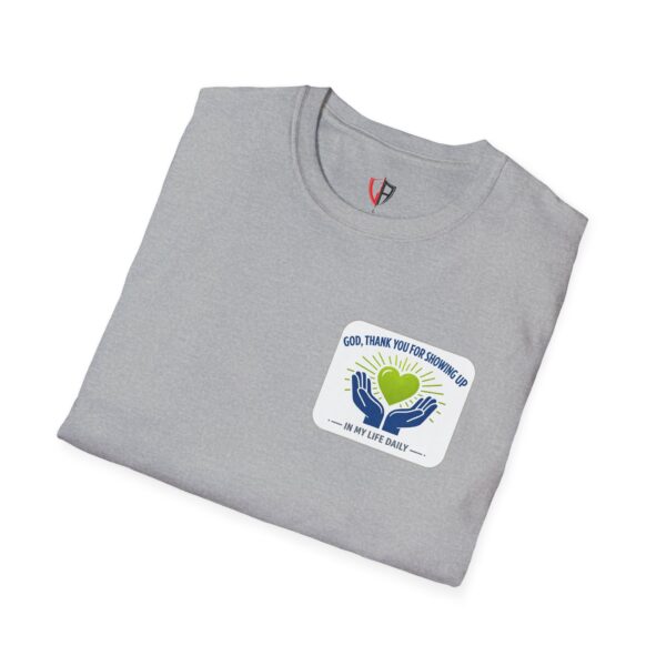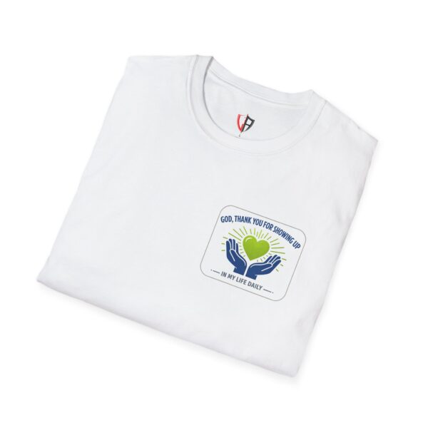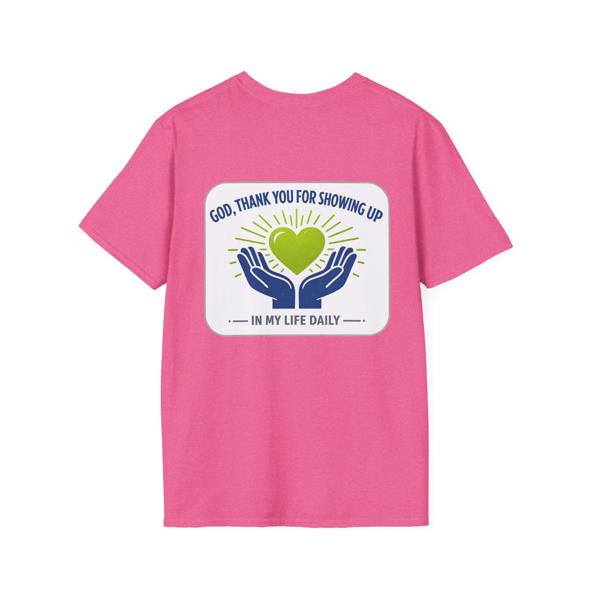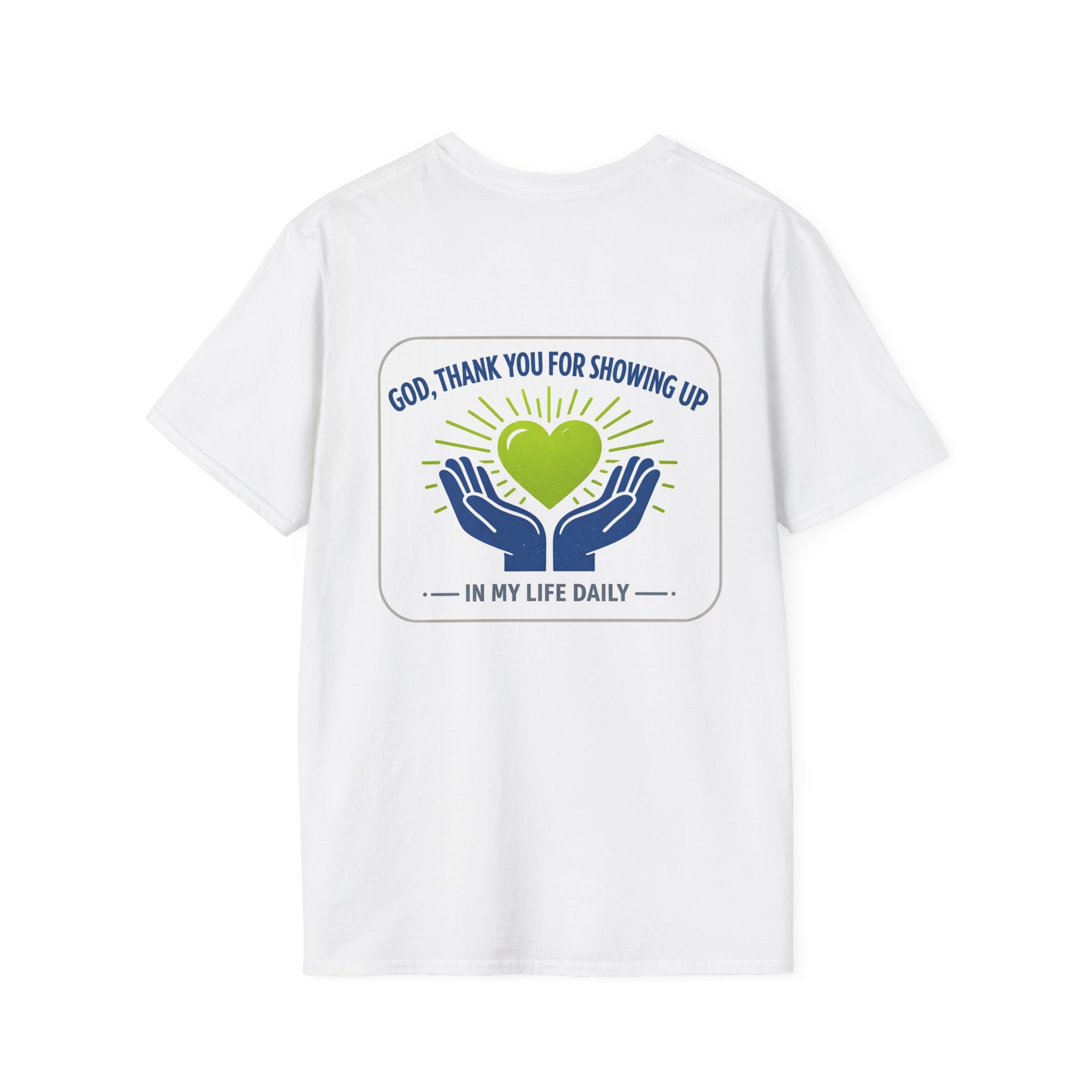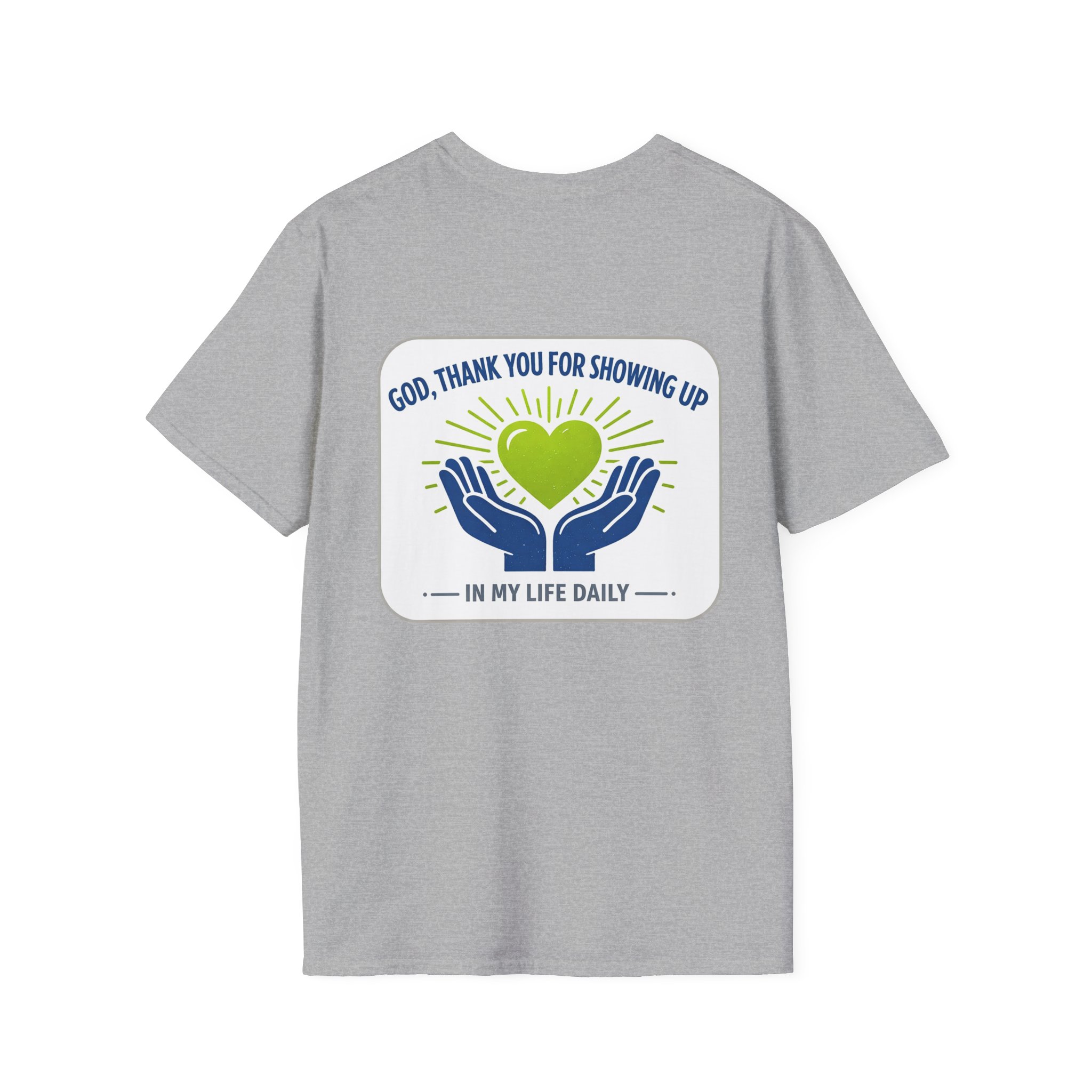 Soft, simple, and full of quiet gratitude — this lightweight tee carries a small but meaningful message across the chest and a bolder version on the back. A pair of open hands cradles a glowing heart, framed by gentle rays and the words “God, thank you for showing up in my life daily.” It’s the kind of shirt you reach for when you want your faith to speak softly through your wardrobe: comfortable fabric that breathes, a clean crew neck, and a design that reads like a short, personal prayer.