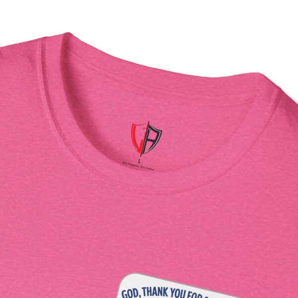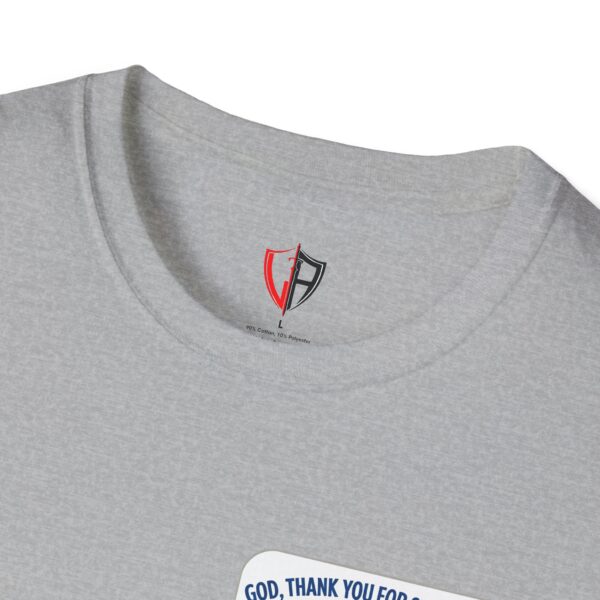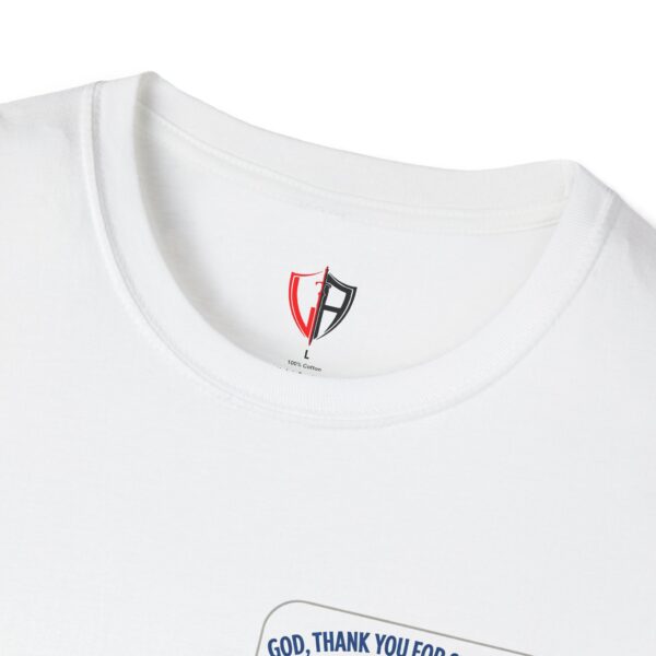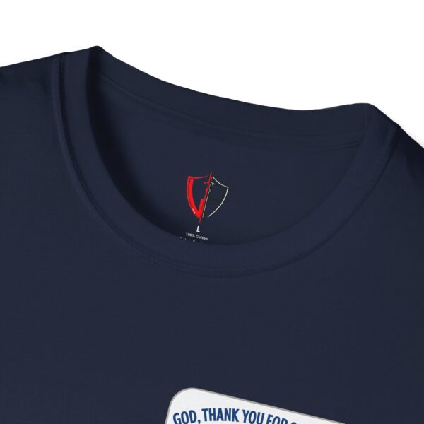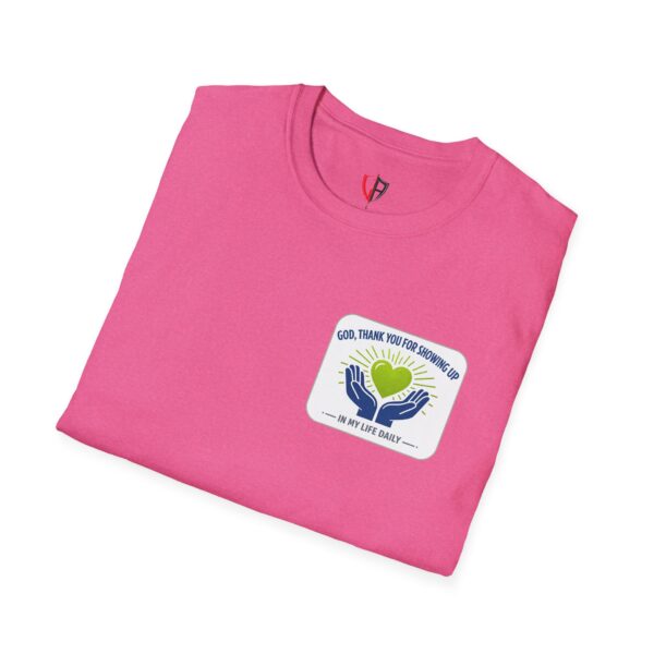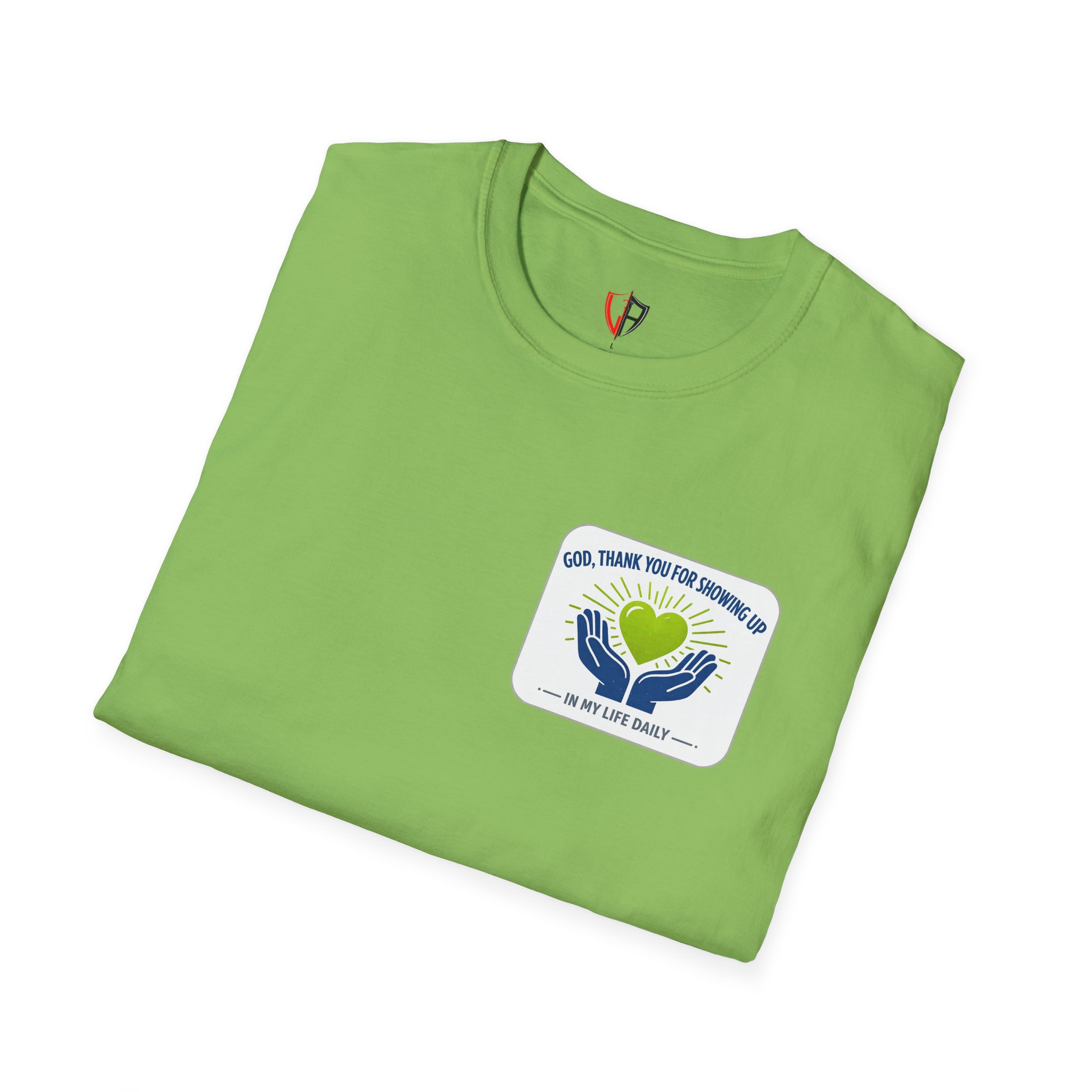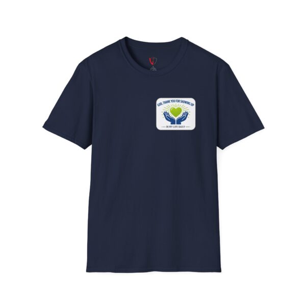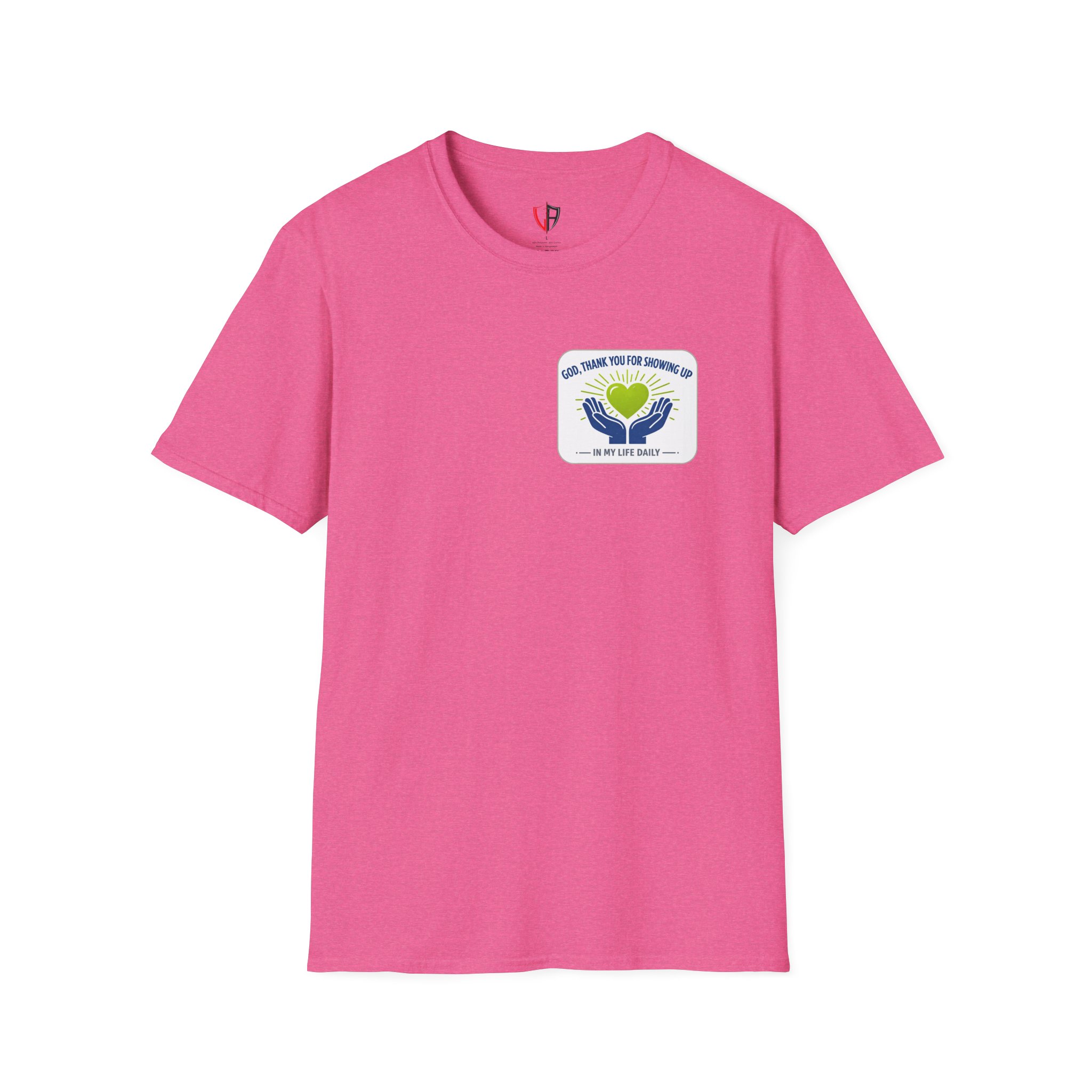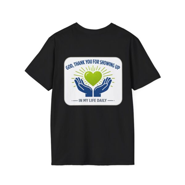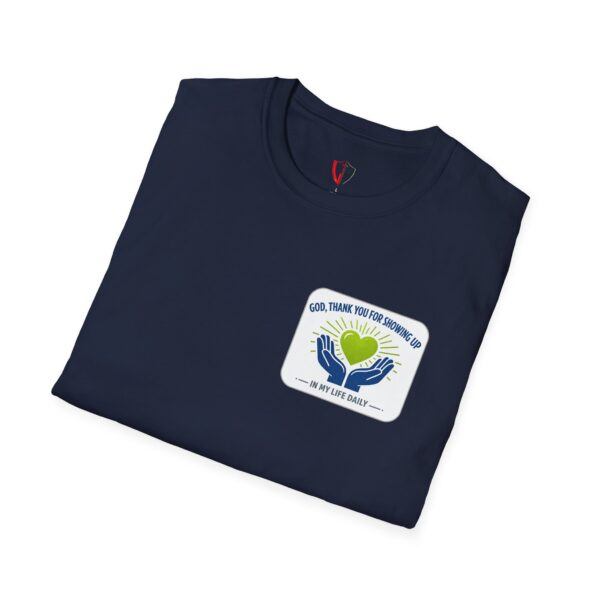 Soft, simple, and full of quiet gratitude — this lightweight tee carries a small but meaningful message across the chest and a bolder version on the back. A pair of open hands cradles a glowing heart, framed by gentle rays and the words “God, thank you for showing up in my life daily.” It’s the kind of shirt you reach for when you want your faith to speak softly through your wardrobe: comfortable fabric that breathes, a clean crew neck, and a design that reads like a short, personal prayer.