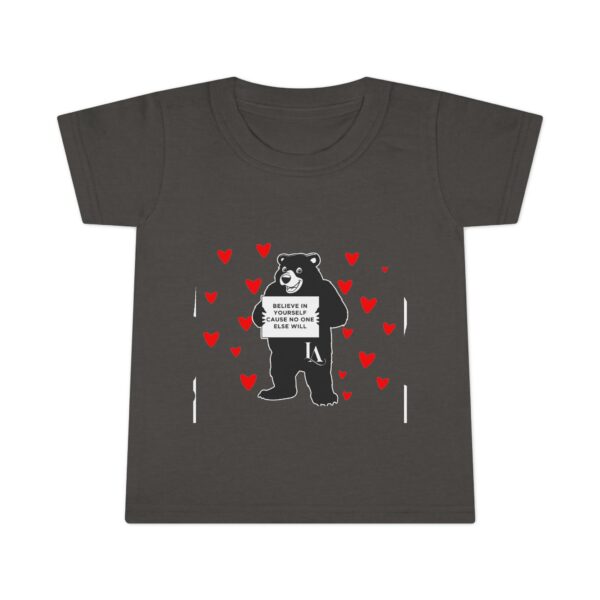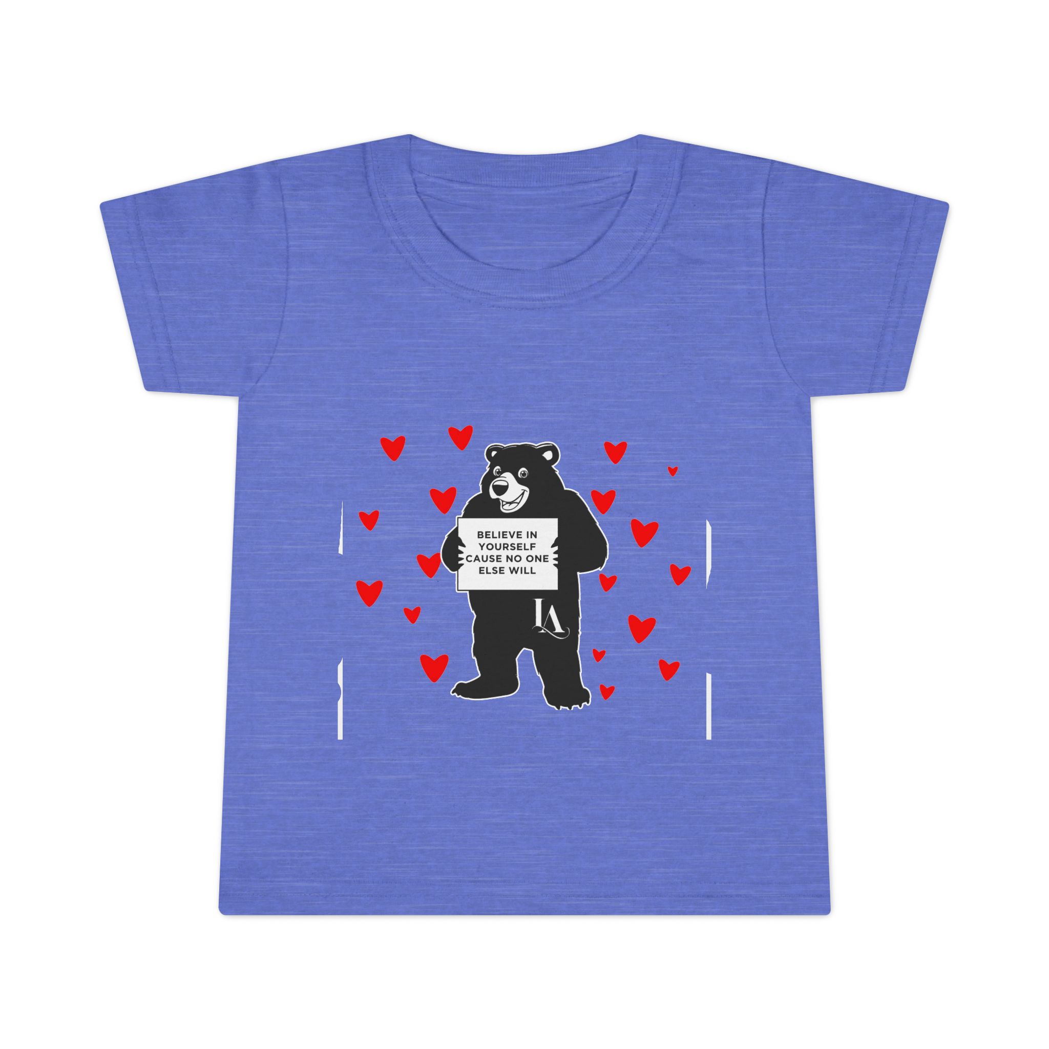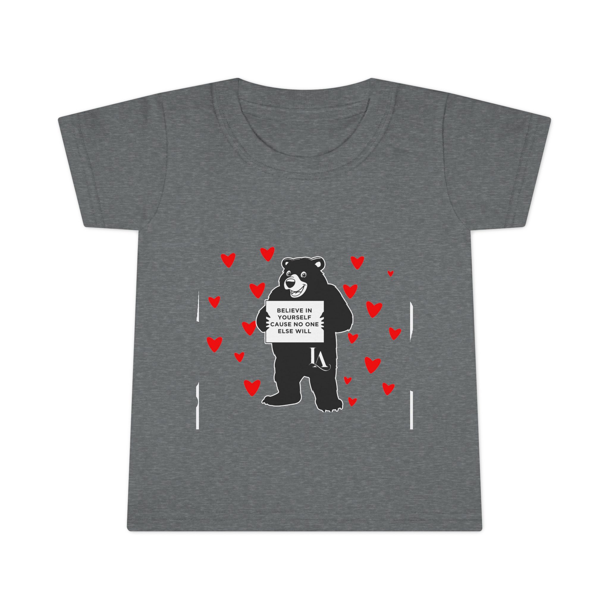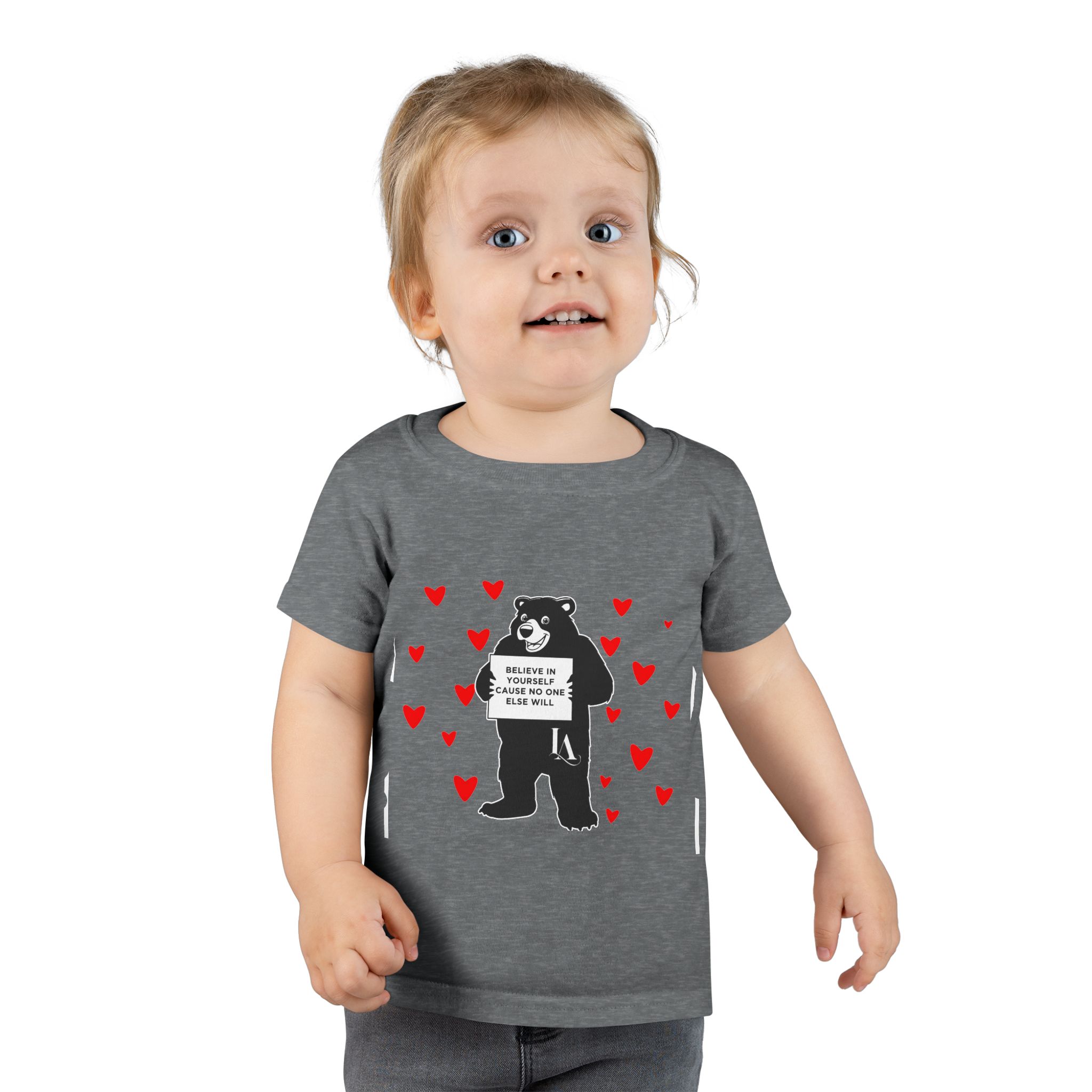 Soft, light, and playful — this toddler tee brings cozy comfort and a little bit of mischief to everyday play. A friendly bear stands center stage, surrounded by tiny red hearts that add a touch of warmth and whimsy. The relaxed classic fit and breathable ringspun cotton make it easy for busy toddlers to climb, tumble, and explore without feeling restricted. Subtle details like taped shoulders, side seams for structure, and double-stitched hems keep the shirt looking neat wash after wash. It’s the kind of top that pairs well with storytime snuggles, park adventures, or family photos where a sweet, slightly sassy vibe is welcome.