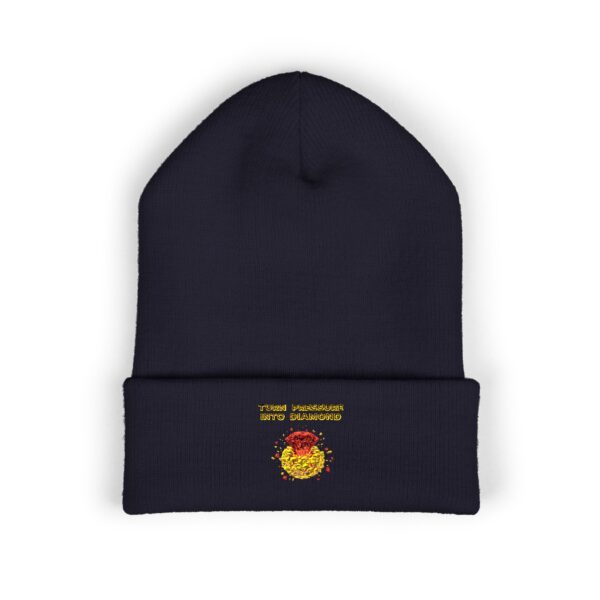 Turn Pressure Into Diamond comes to life on a warm, cuffed beanie that speaks quietly but firmly. The embroidered message sits low on the cuff — a tactile reminder that grit refines, not breaks. Slip it on during early morning runs, late-night study sessions, or while you’re standing watch at an open mic. The knit wraps your head in steady warmth, while the raised stitching adds texture and quiet confidence. This is for people who prefer action over slogans: those who welcome the grind, who carry quiet resilience during cold commutes, mountain walks, or city nights. Wear it when you need a small, visible nudge — a hand-stitched emblem that pressure can become something beautiful and durable.